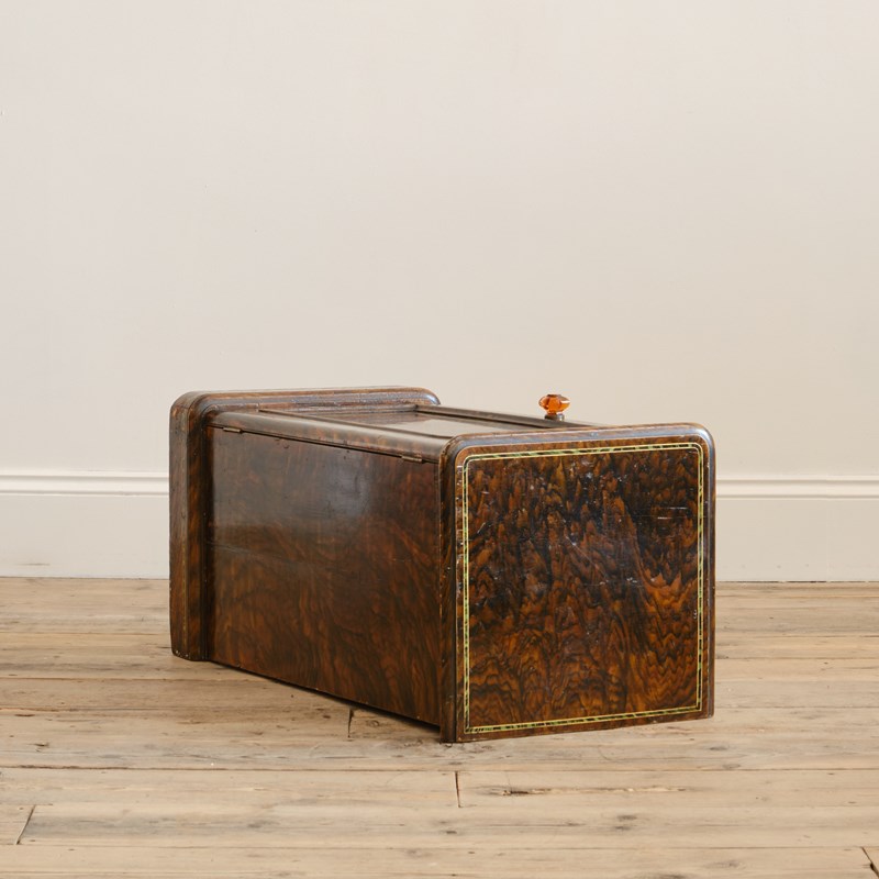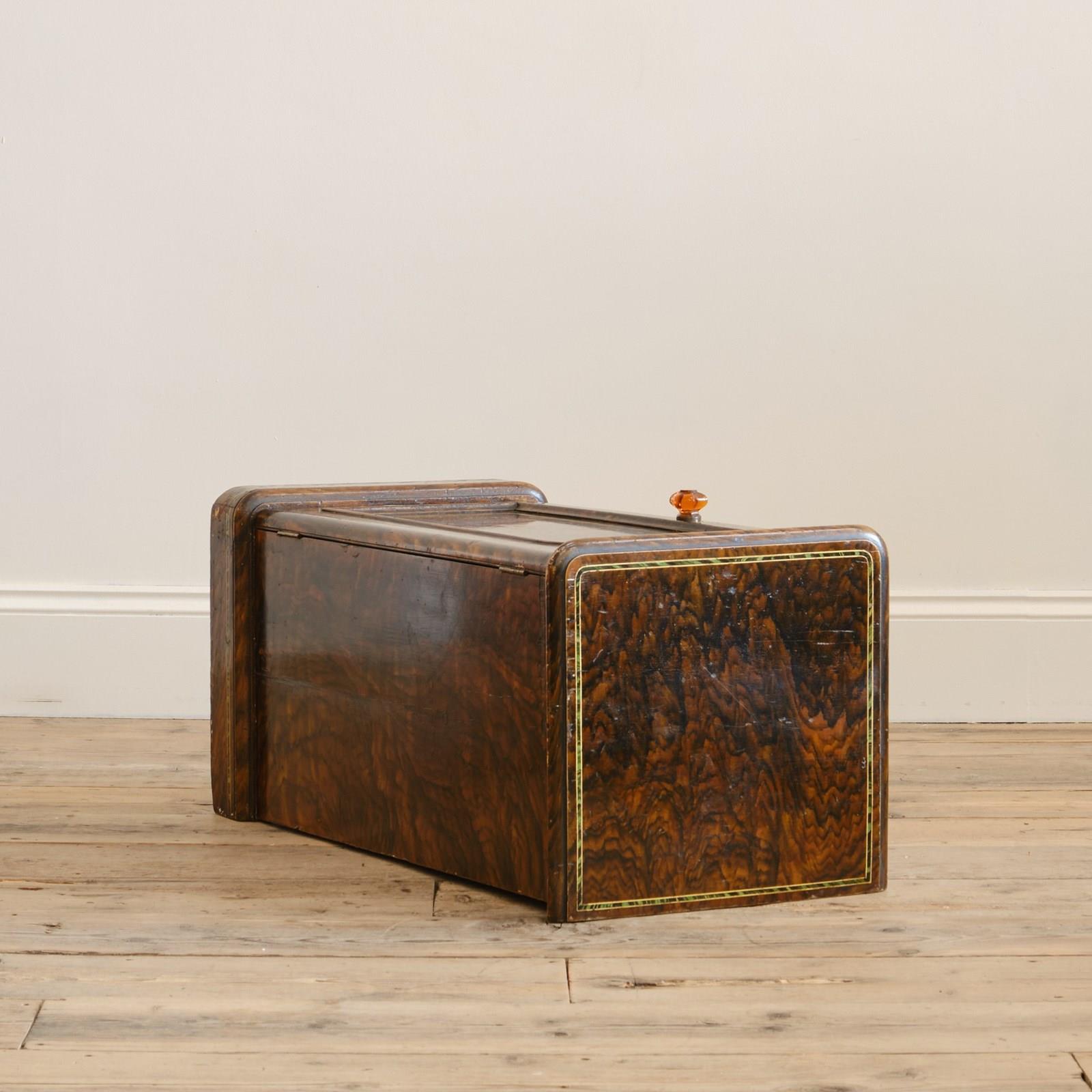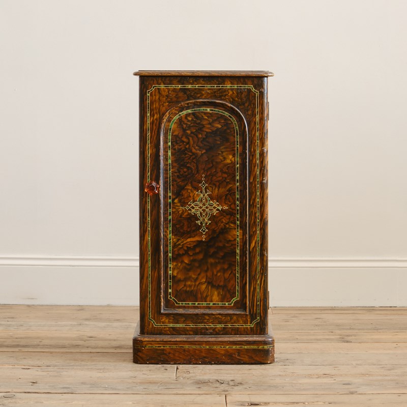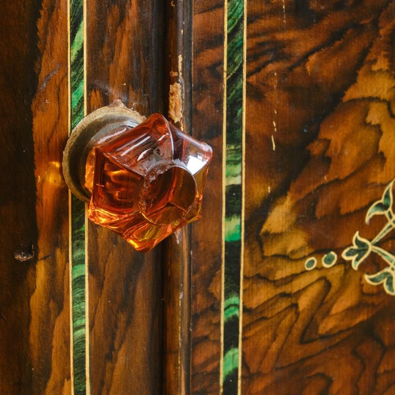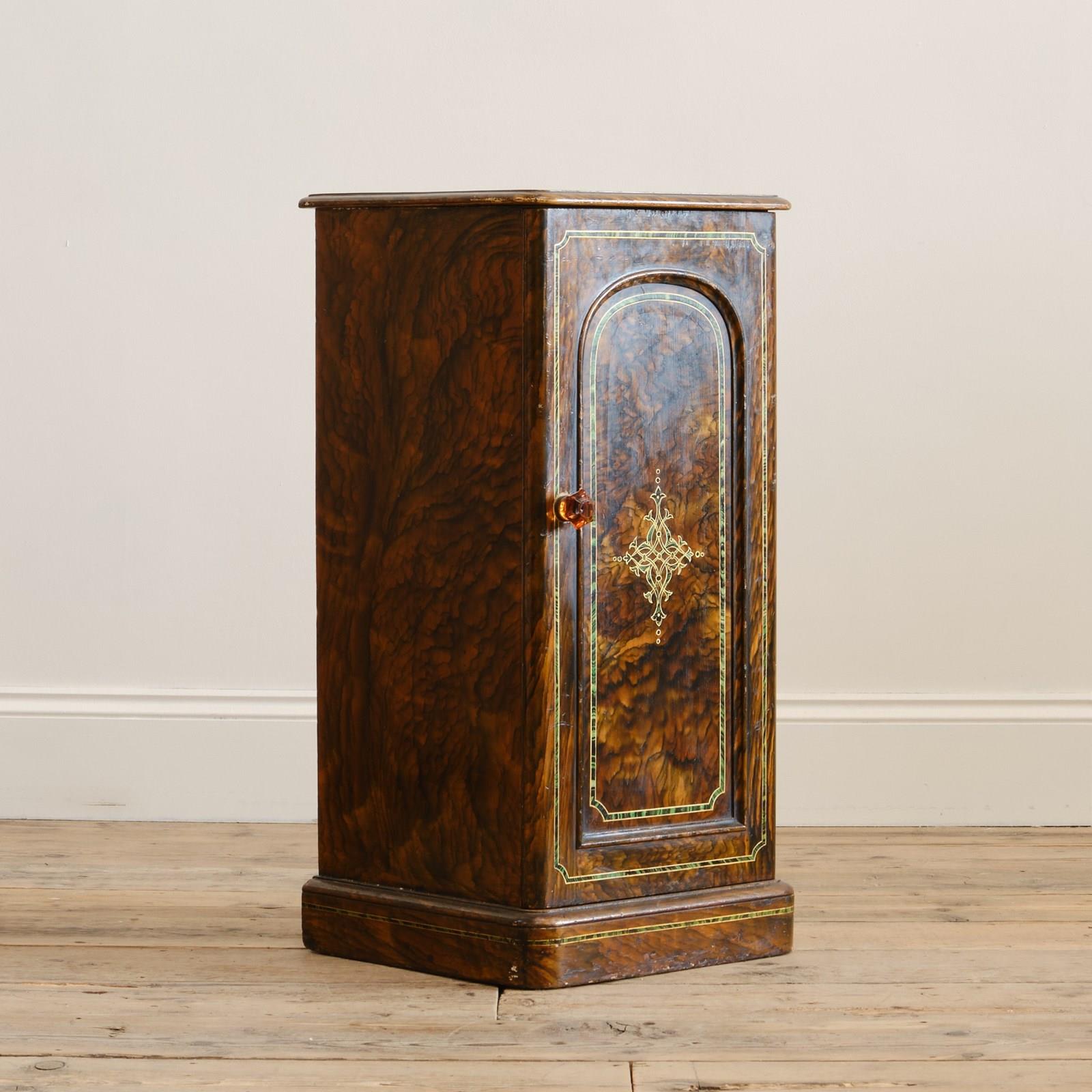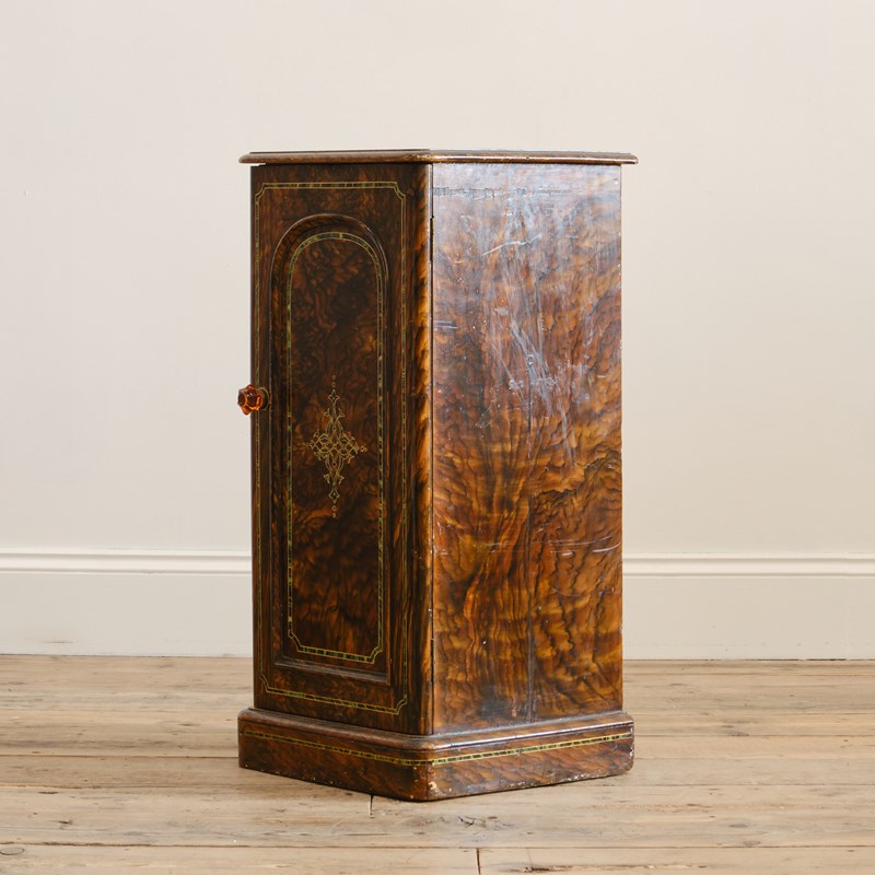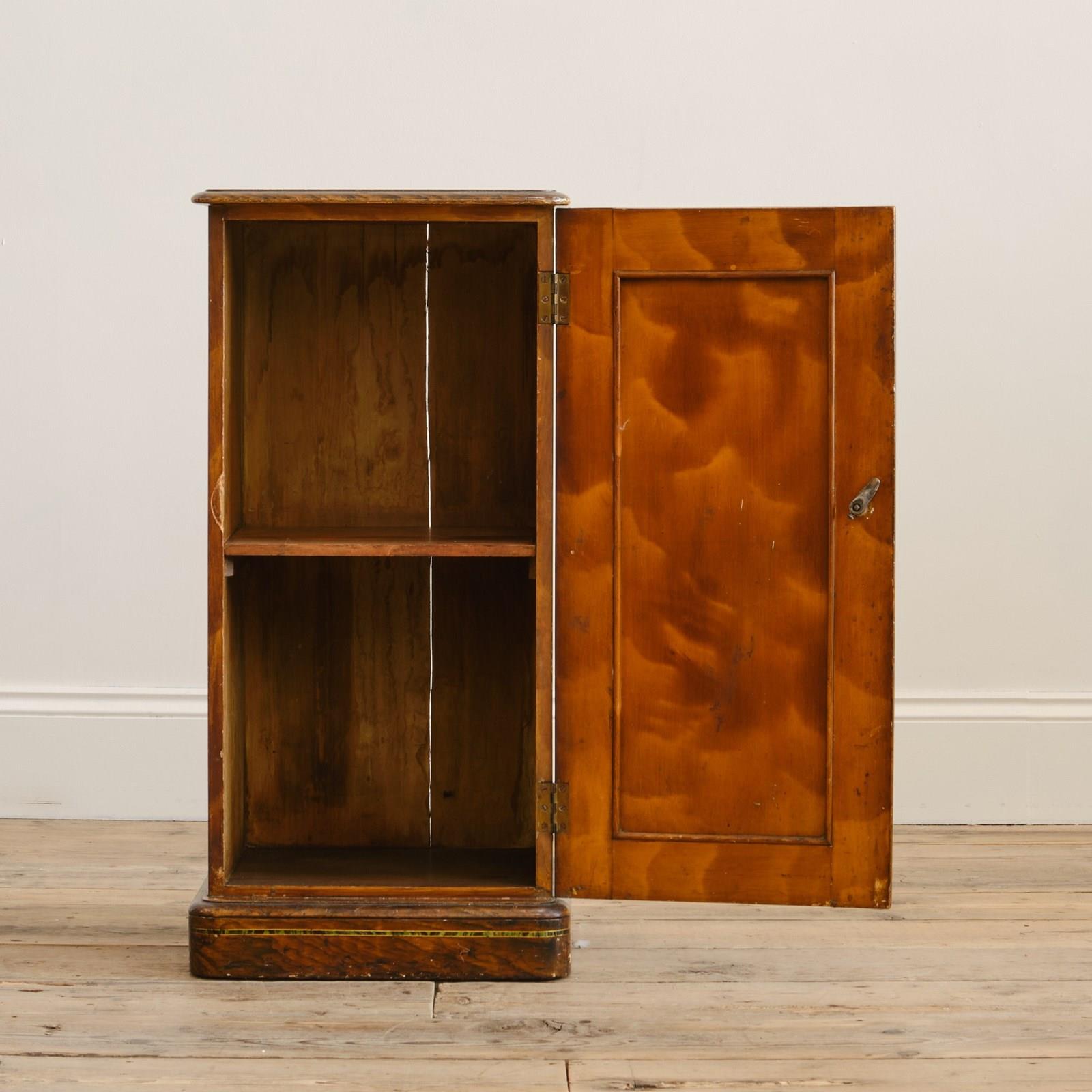 A quirky little 19th century bedside cupboard. In its original grained finish, decorative faux inlay and amber handle.