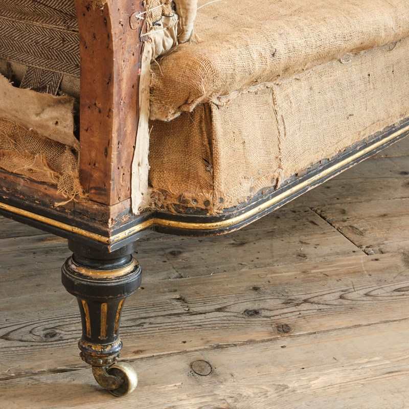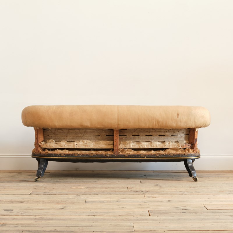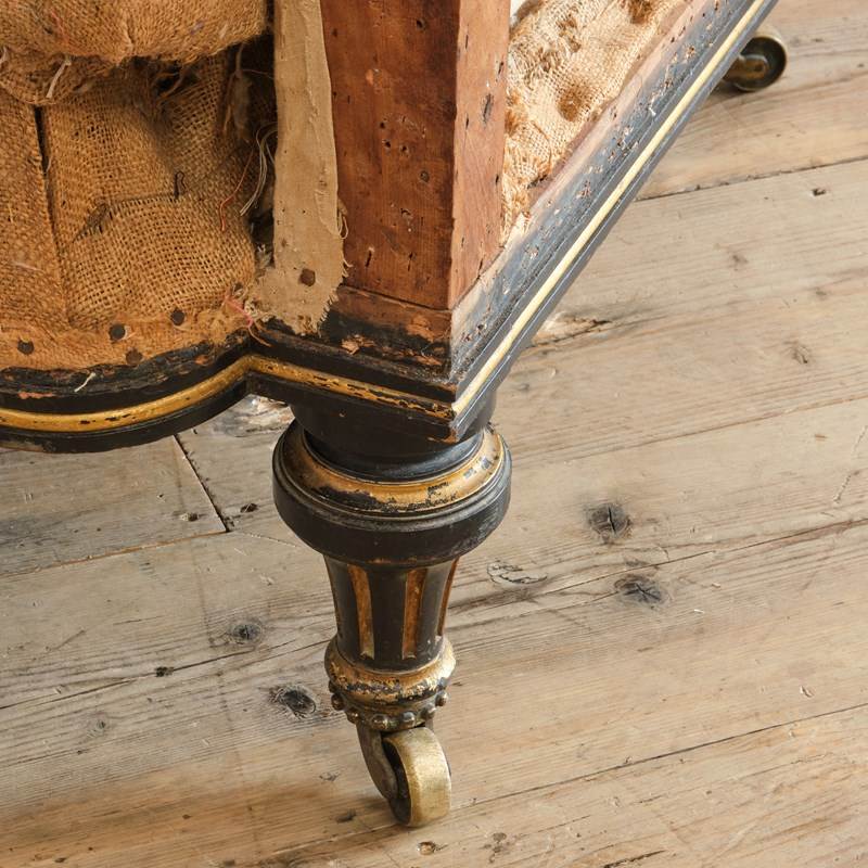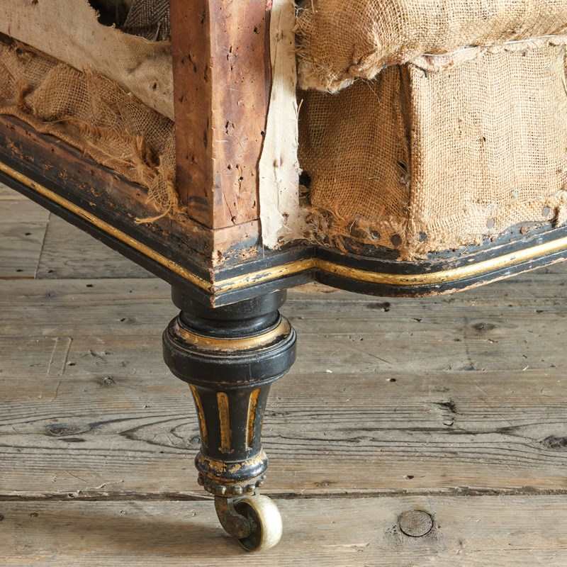 A 19th century country house chesterfield sofa by the renowned Holland & Sons of London. Raised on turned and fluted ebonized and Gilt turned front legs with outward splayed rear legs and all retaining the original brass casters. The left rear leg bearing the Holland & Sons makers mark. The walnut frame with ebonized and gild decorative trim. C1870