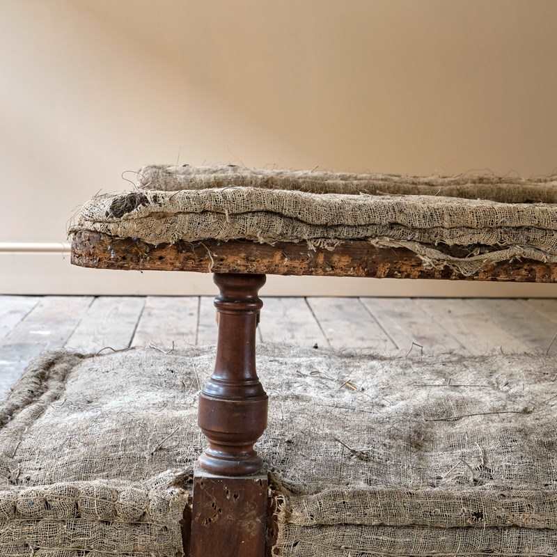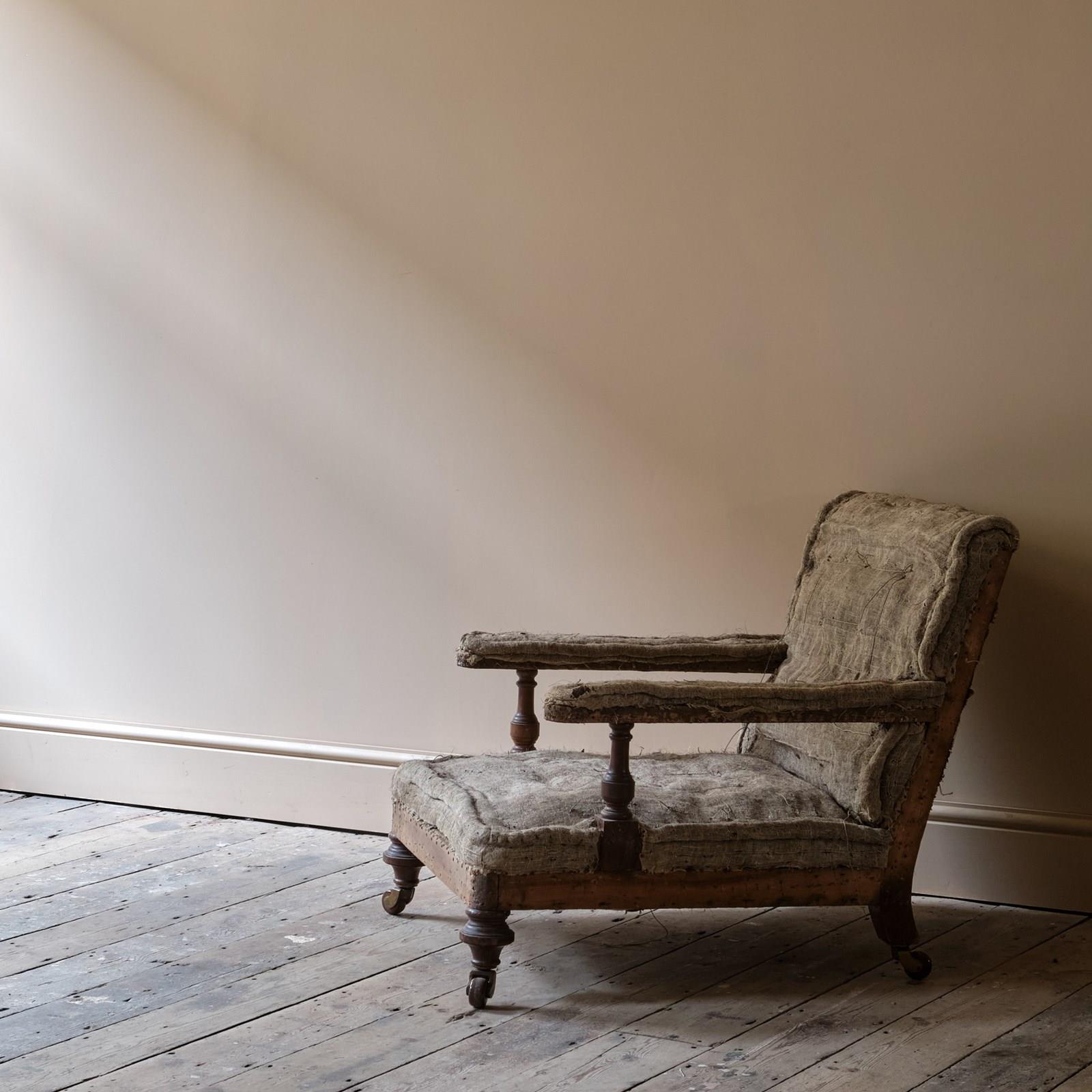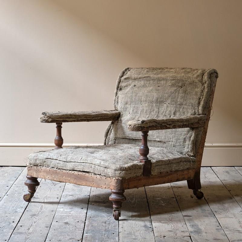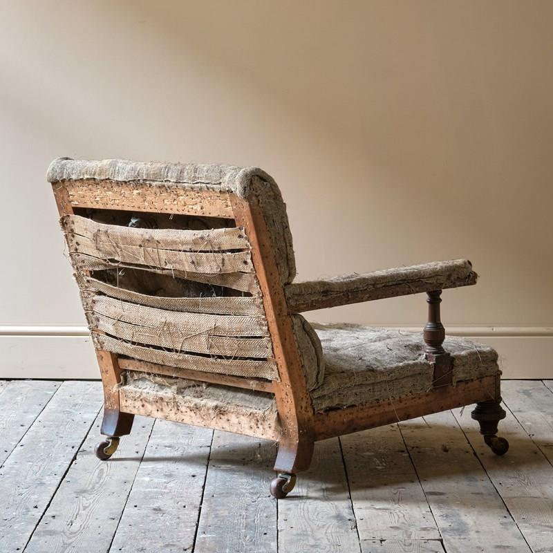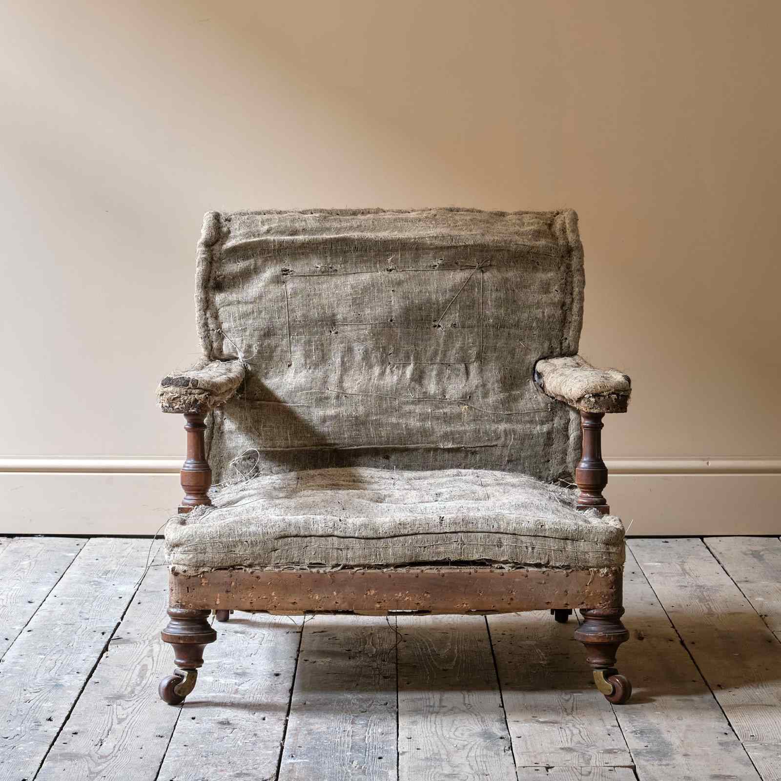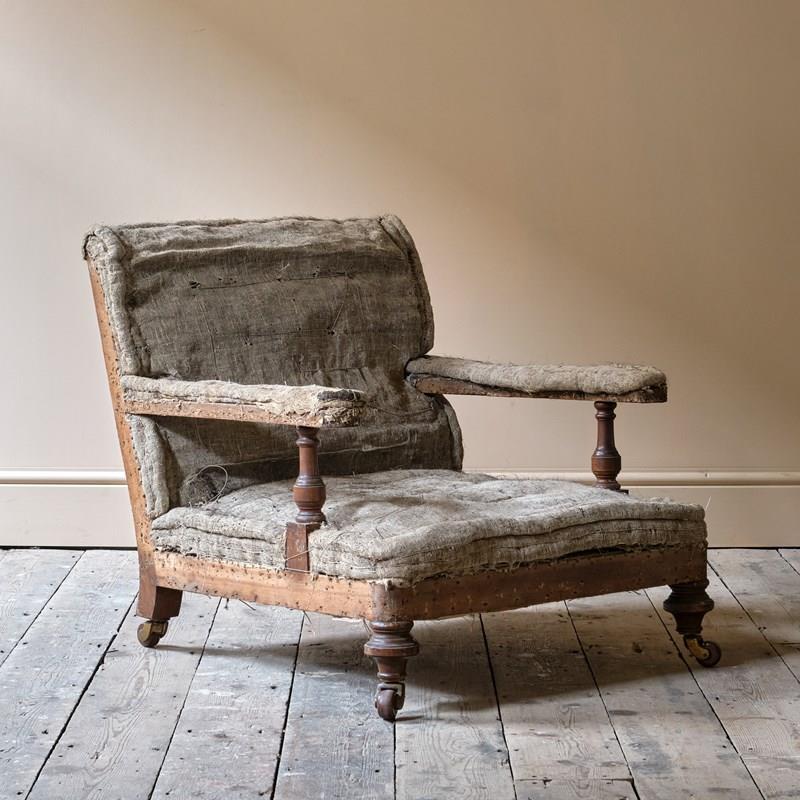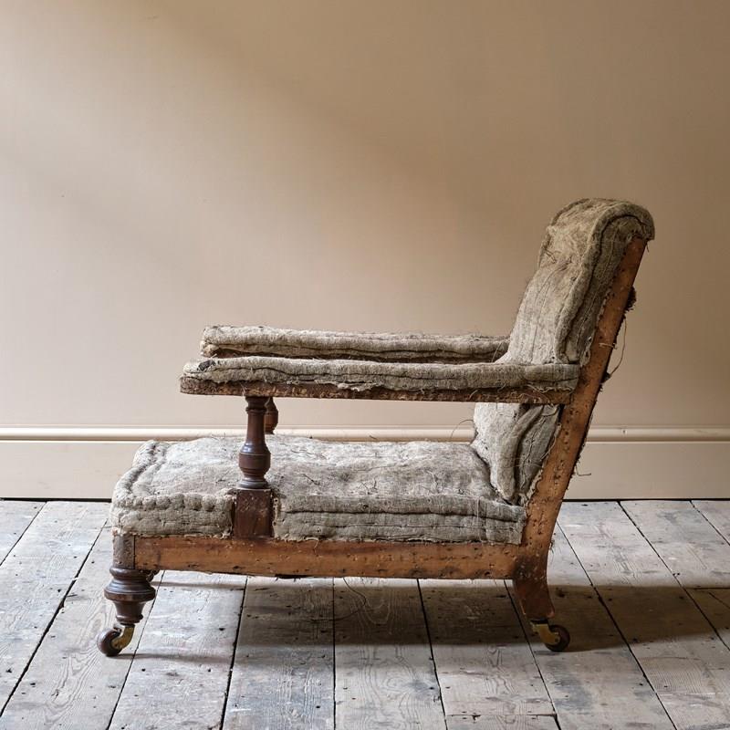 Solid frame sits on walnut legs and arm supports. Resting on brass castors and ceramic wheels.