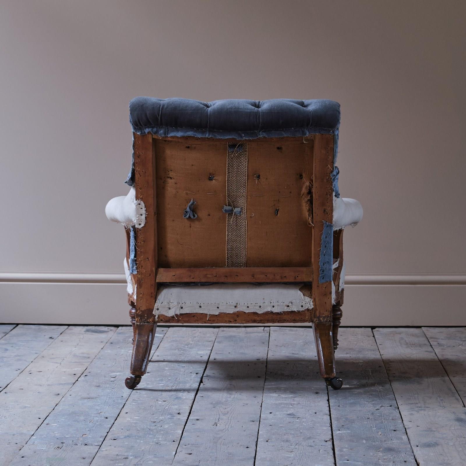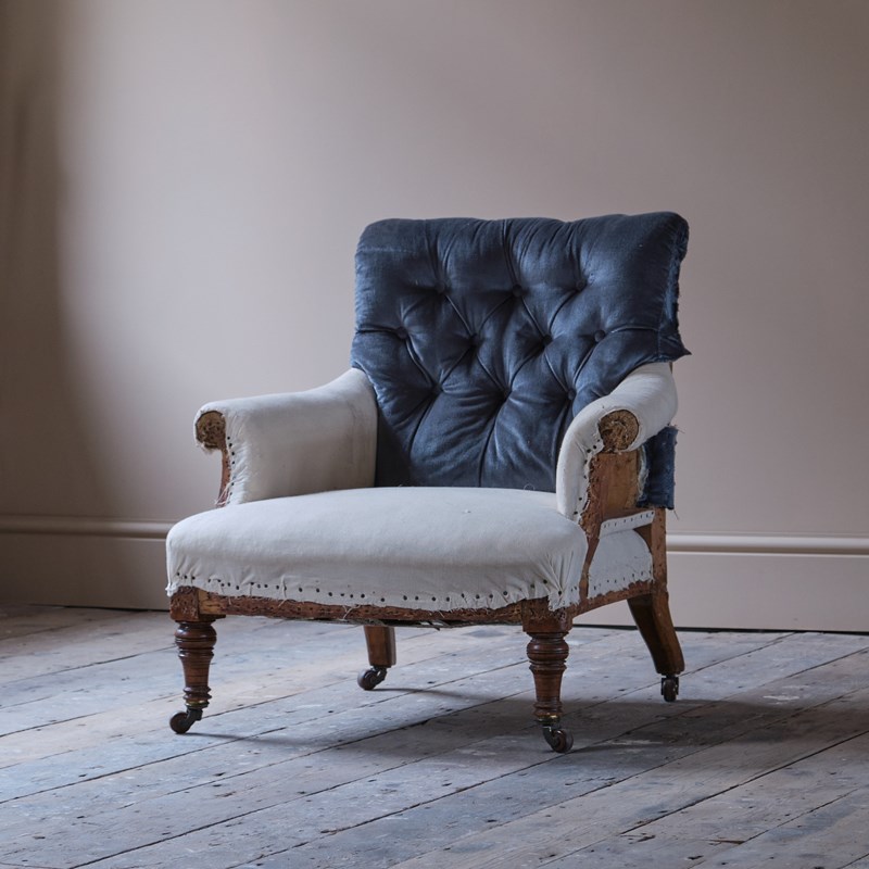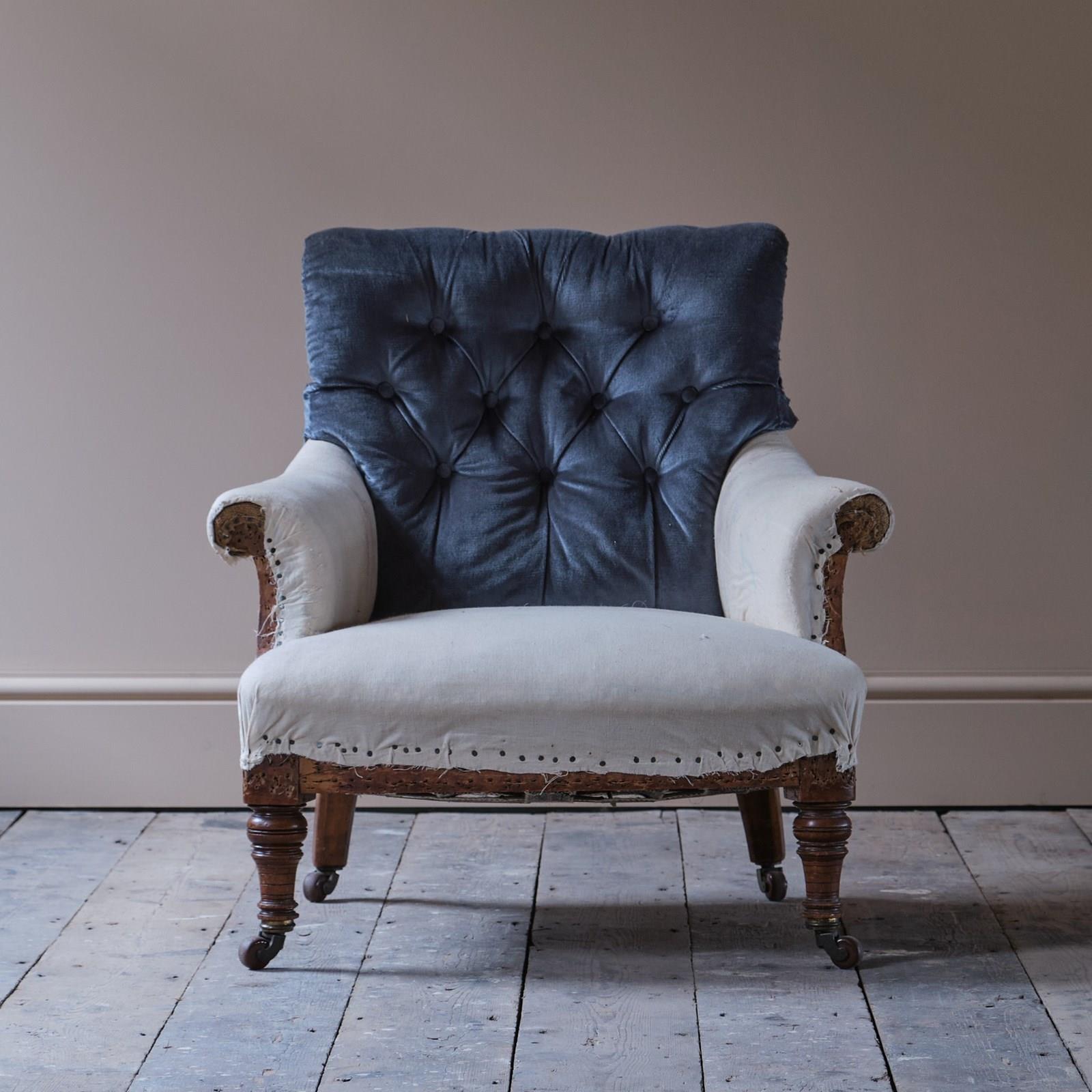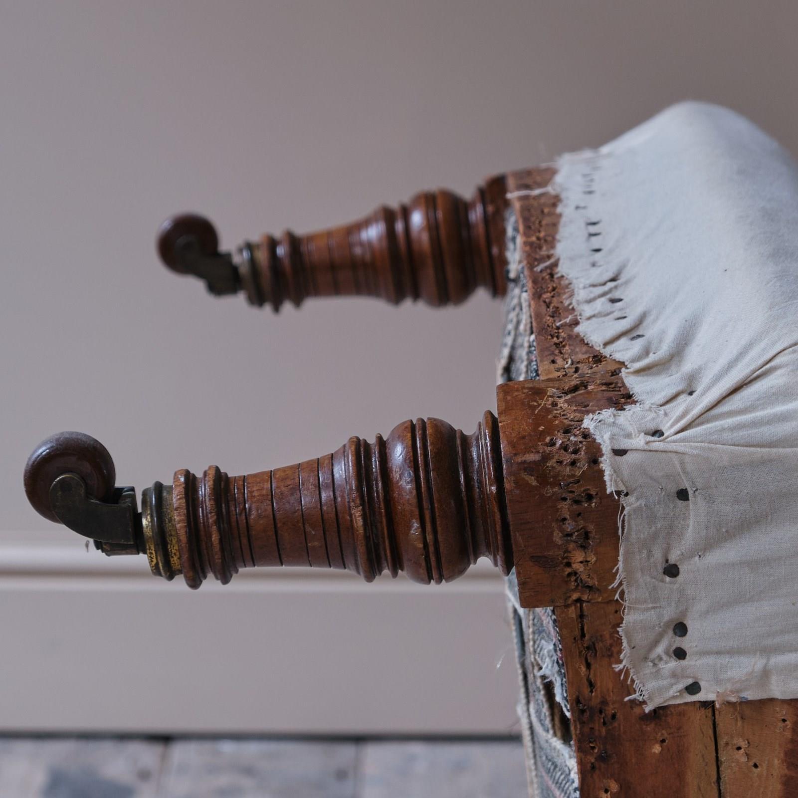 A cute little late 19th century armchair. Raised on walnut legs with the original casters.