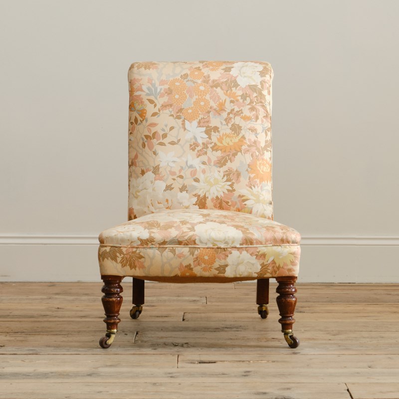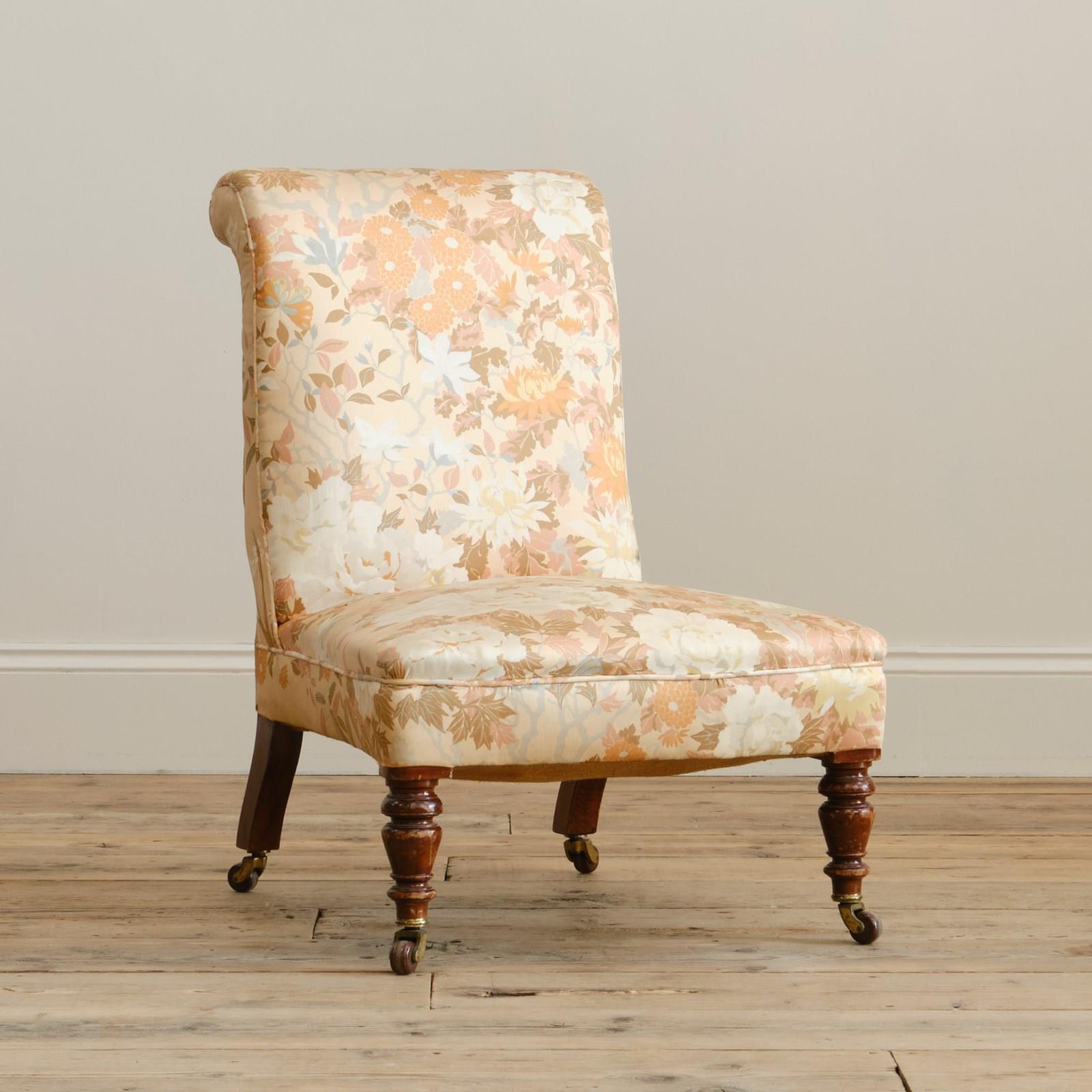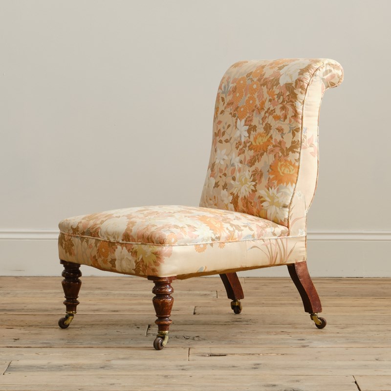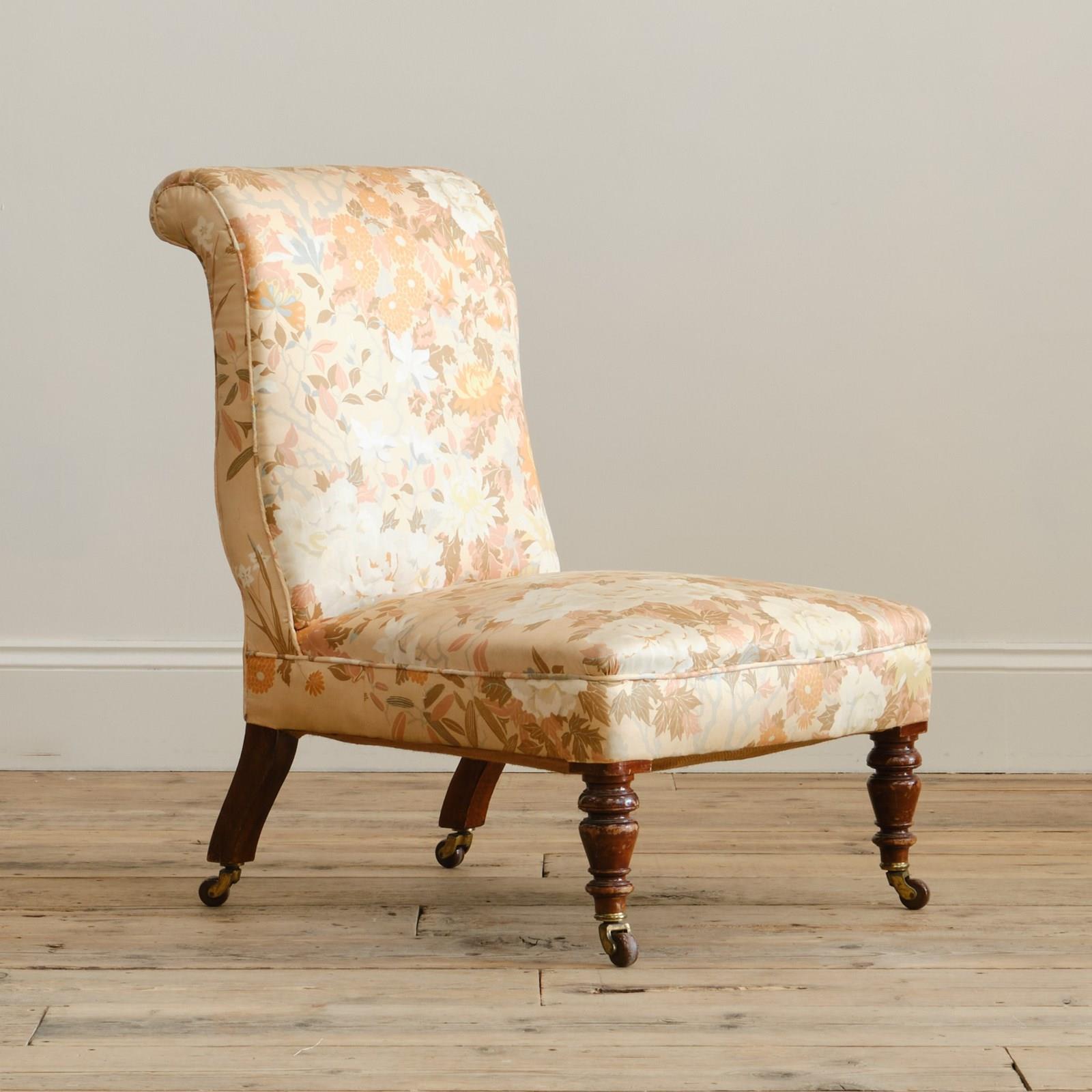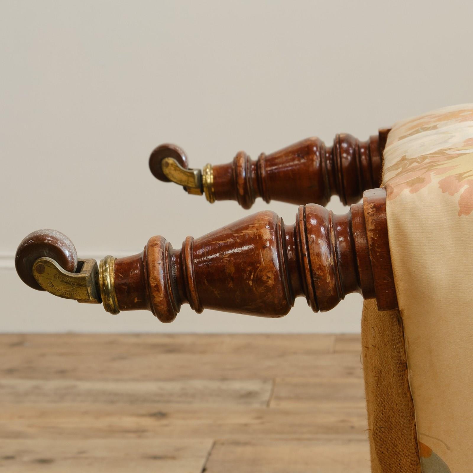 A good quality late 19th century slipper chair by Jas Shoolbred of London. Raised on mahogany legs and the original 4 stamped casters.