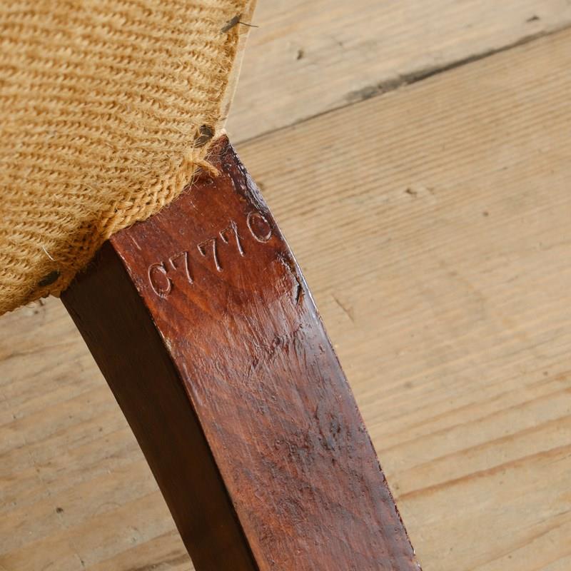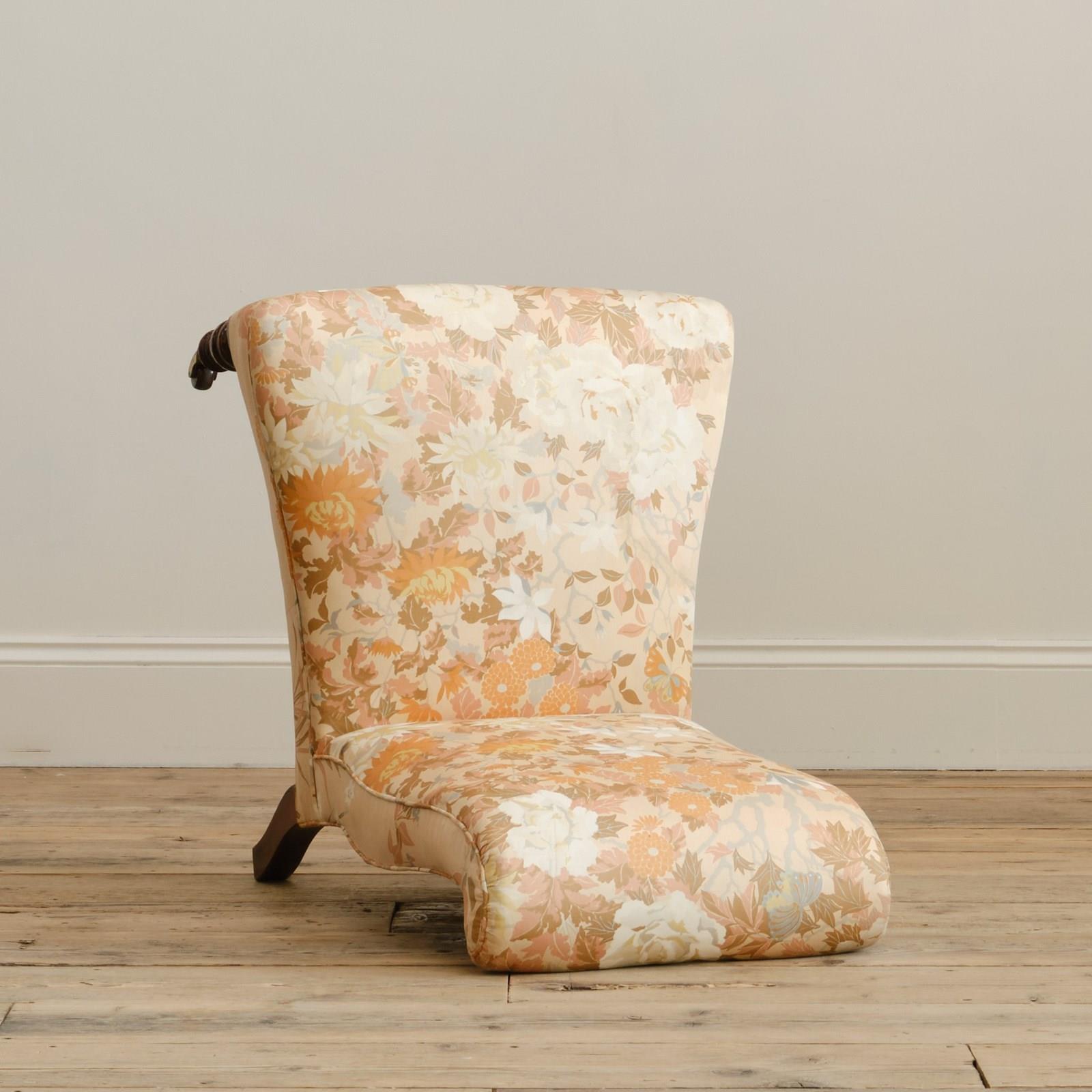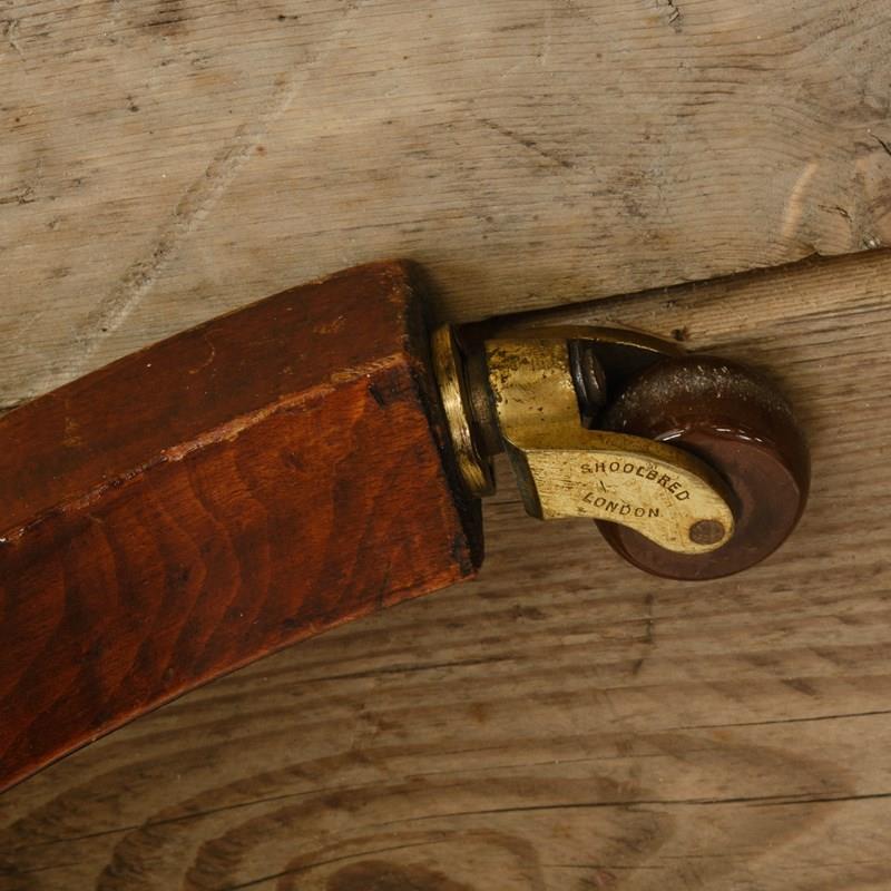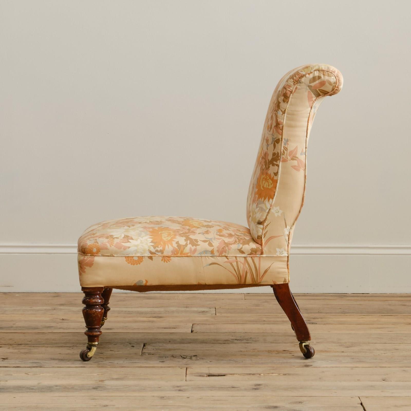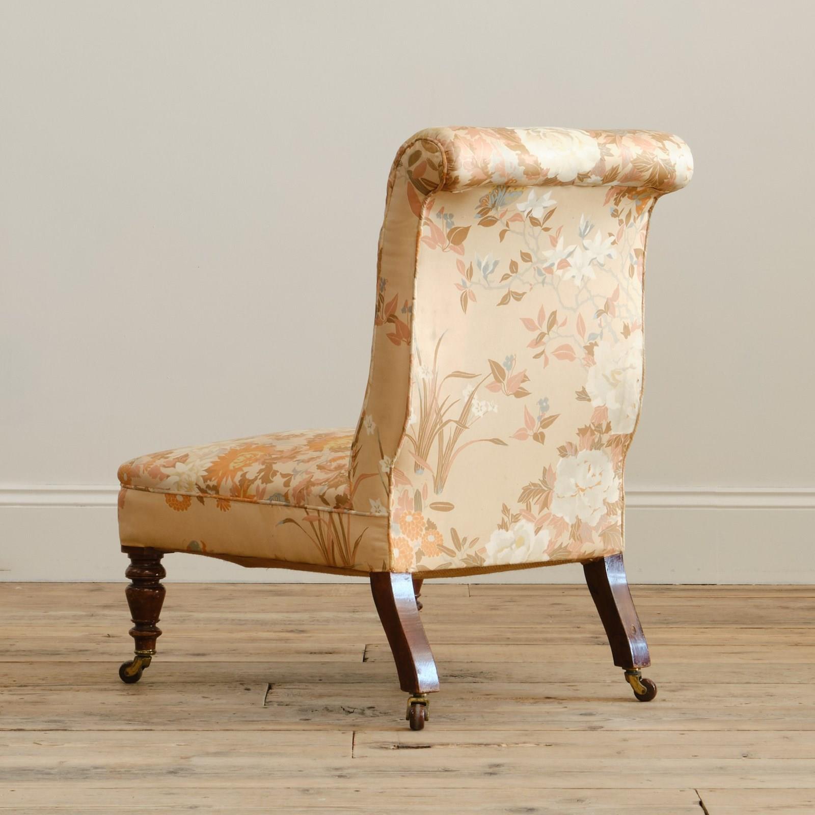 A good quality late 19th century slipper chair by Jas Shoolbred of London. Raised on mahogany legs and the original 4 stamped casters.