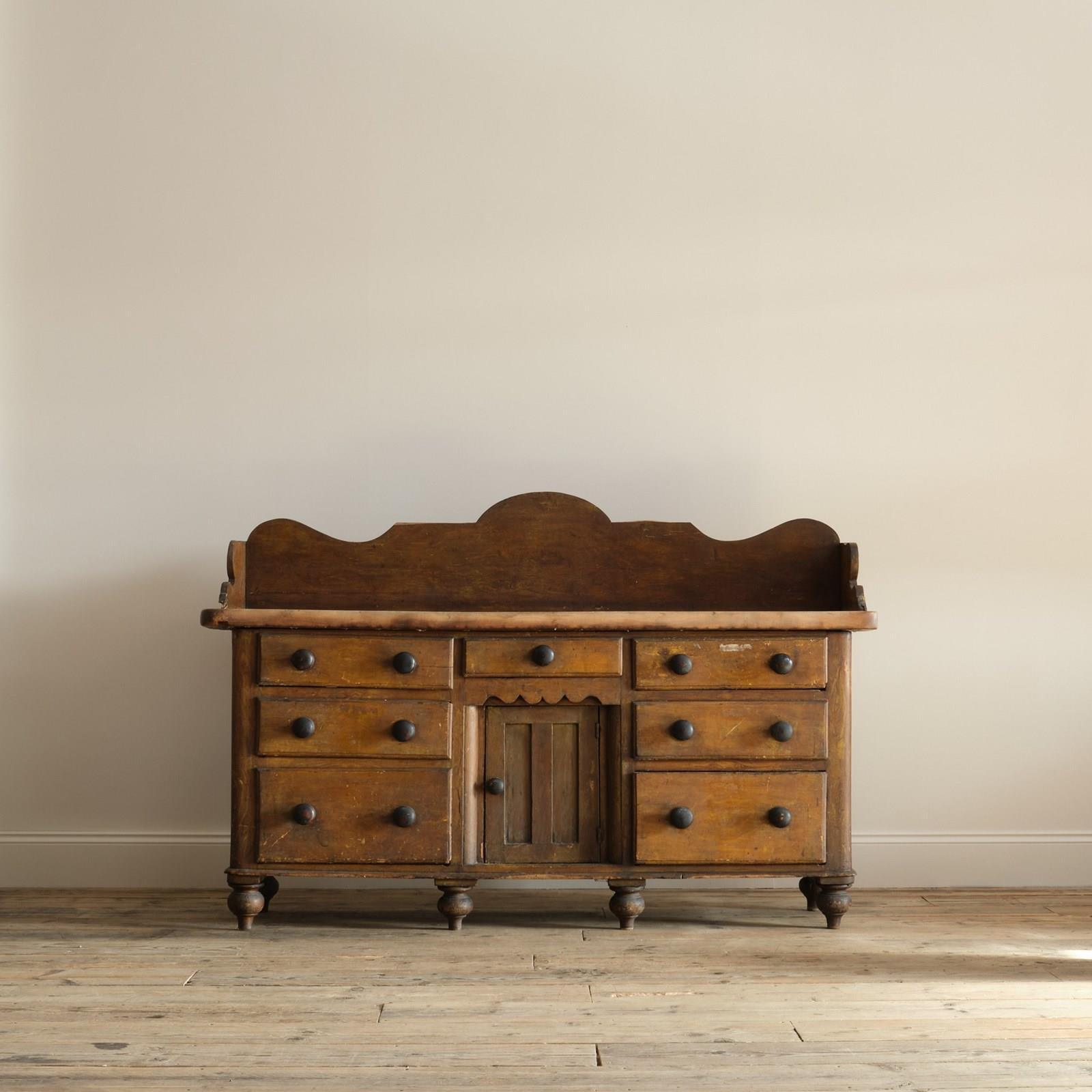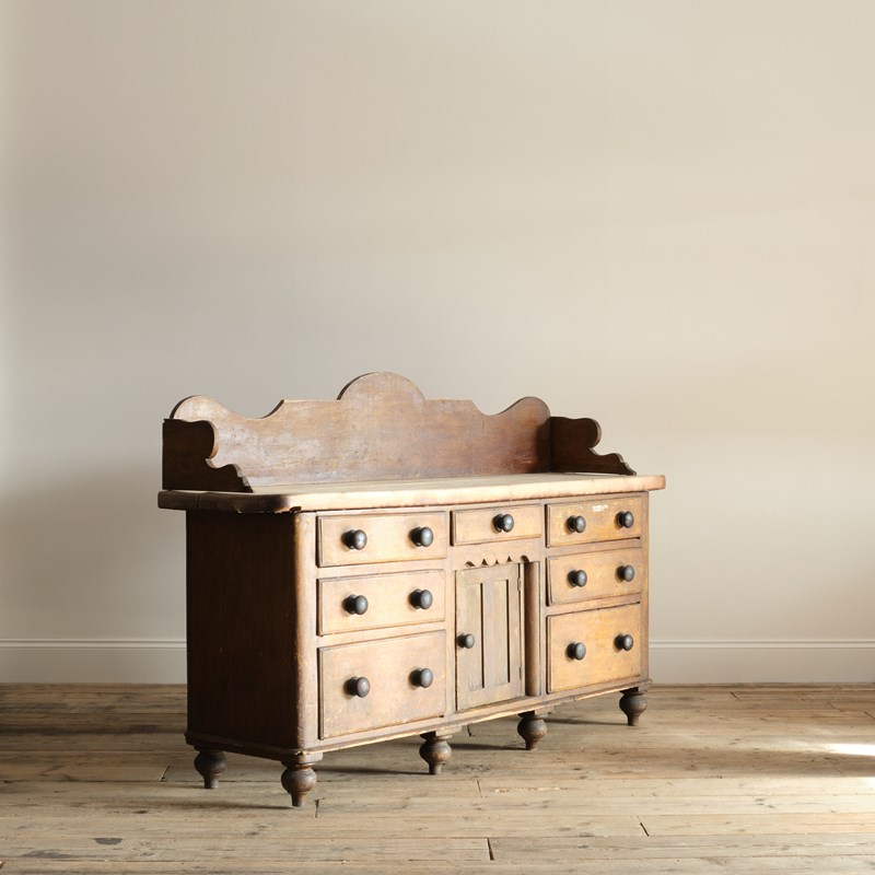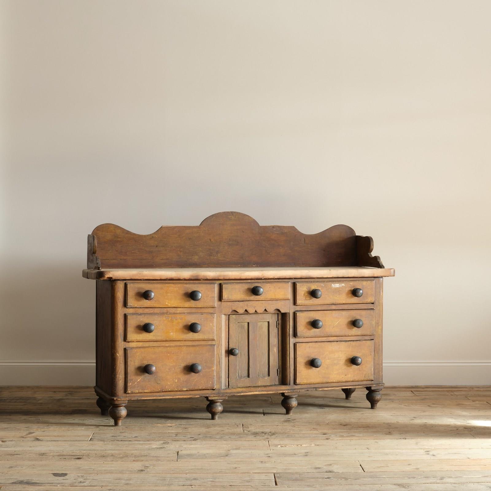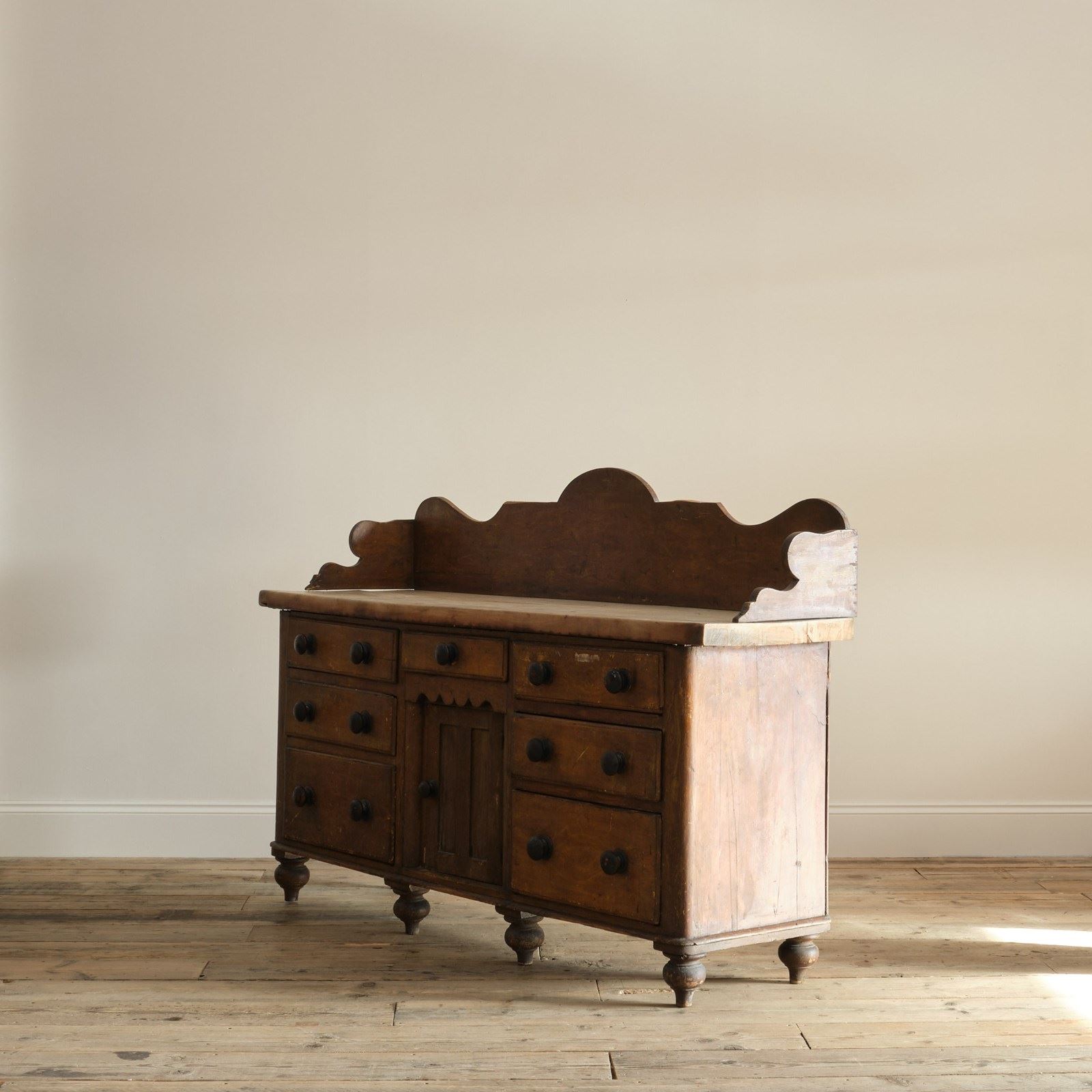 A wonderfully original mid 19th century pine kitchen dresser in old dry simulated oak paint and a thick 2 plank Sycamore scrub top. In as found, perfectly imperfect condition.