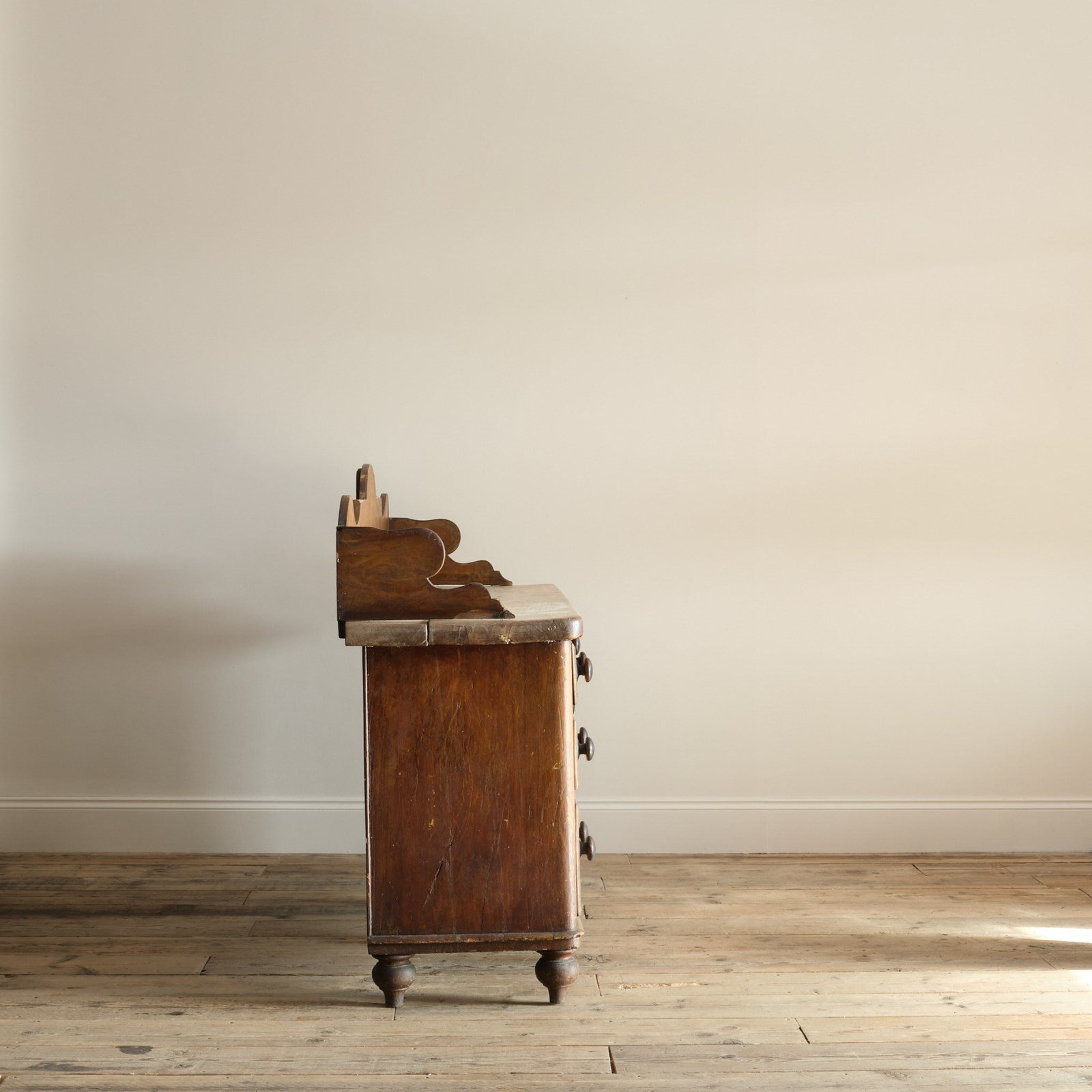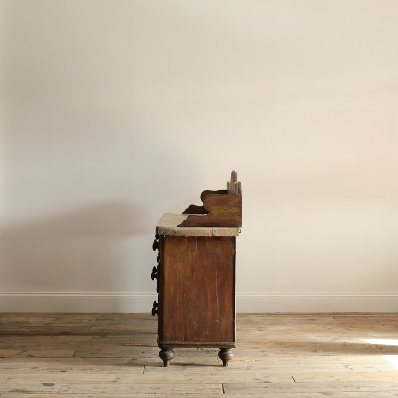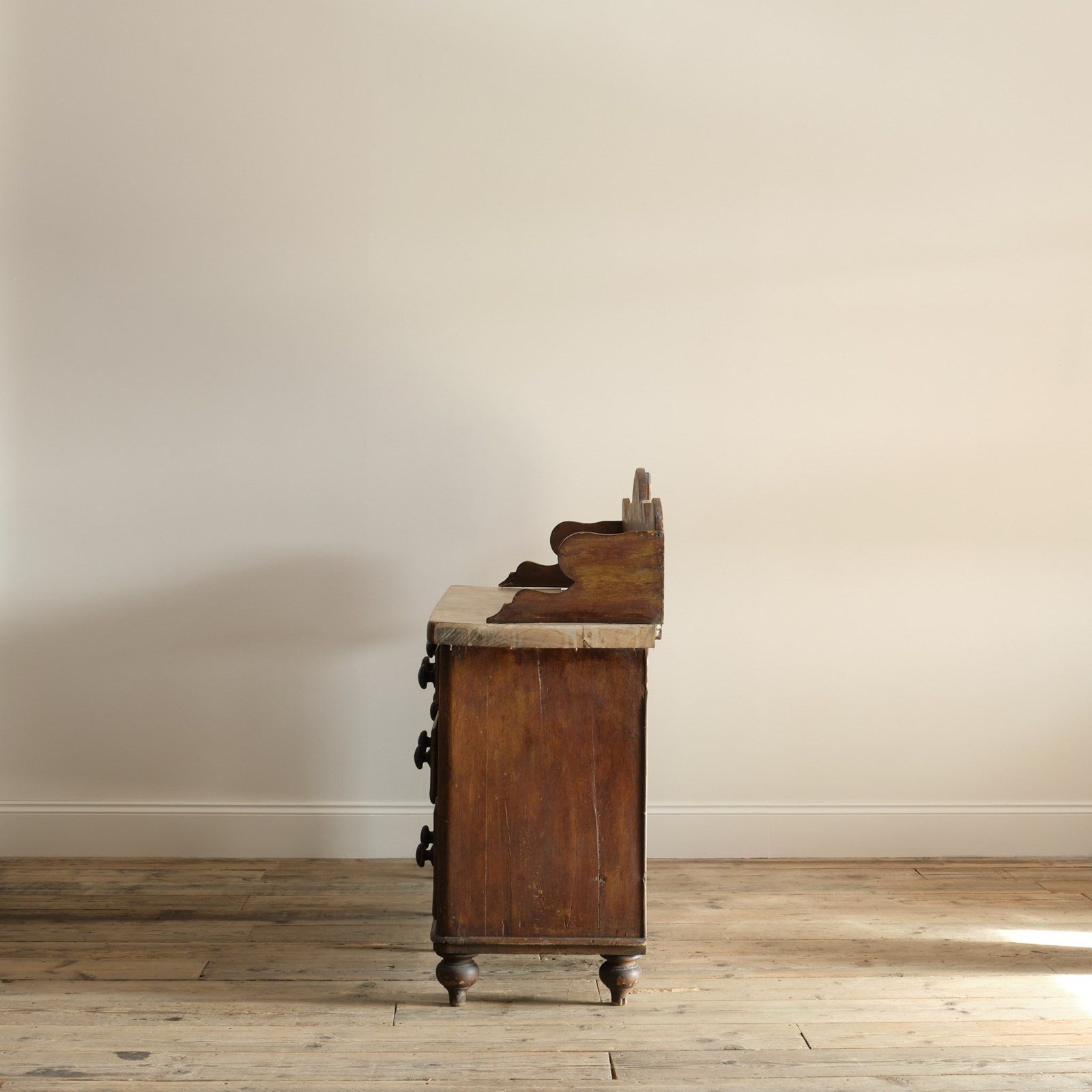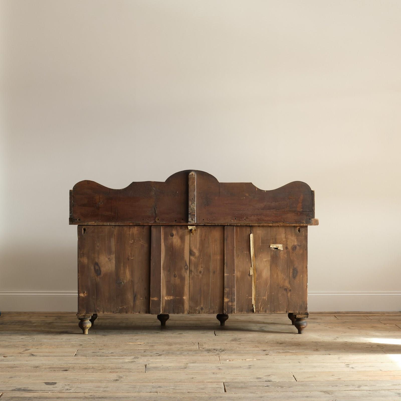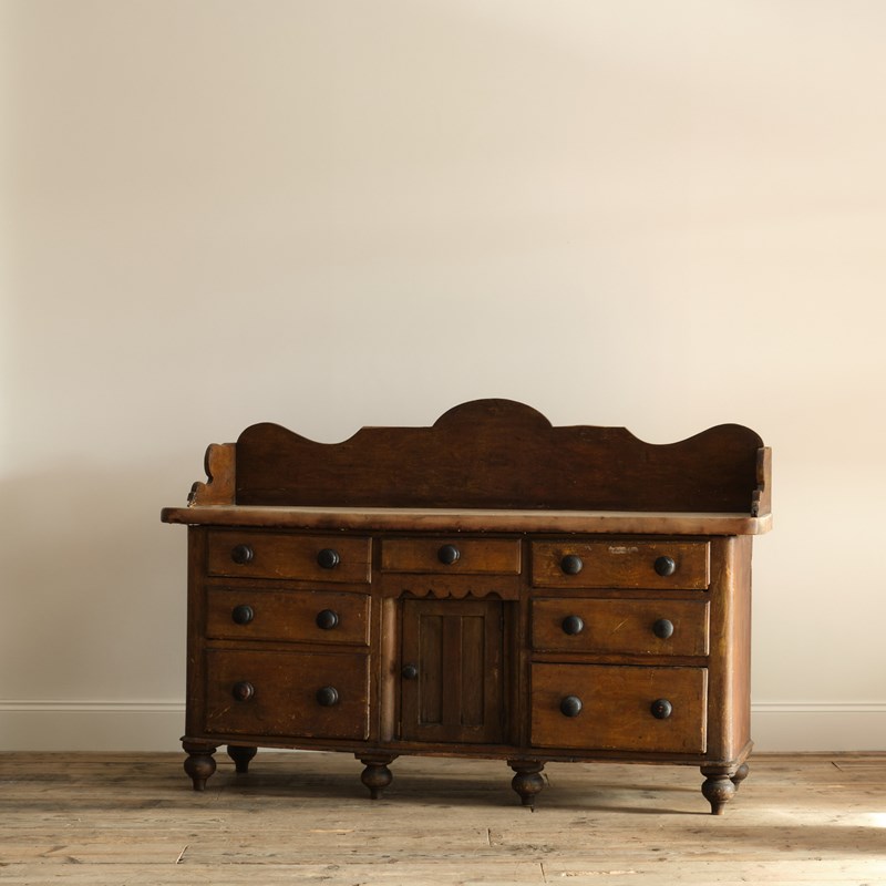A wonderfully original mid 19th century pine kitchen dresser in old dry simulated oak paint and a thick 2 plank Sycamore scrub top. In as found, perfectly imperfect condition.