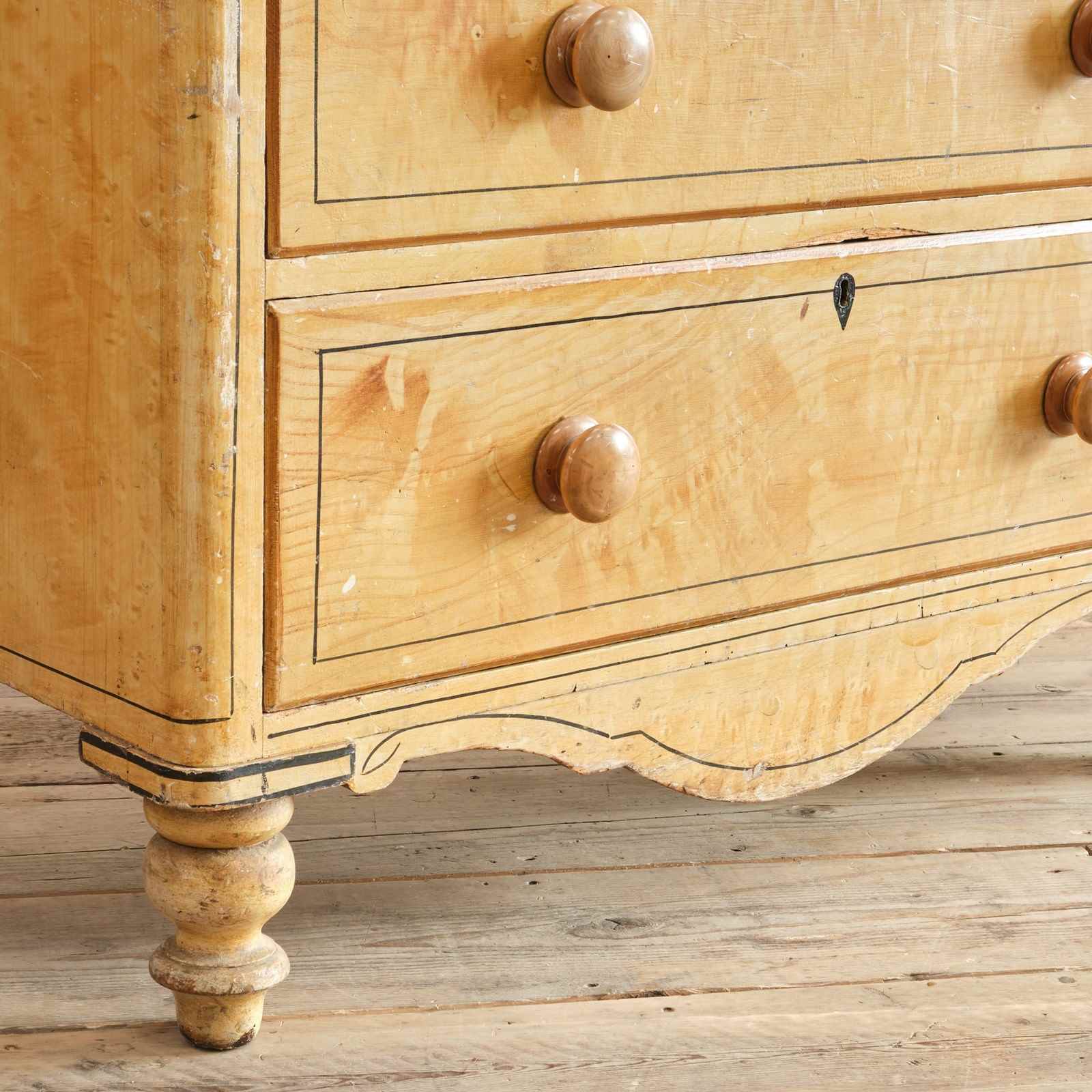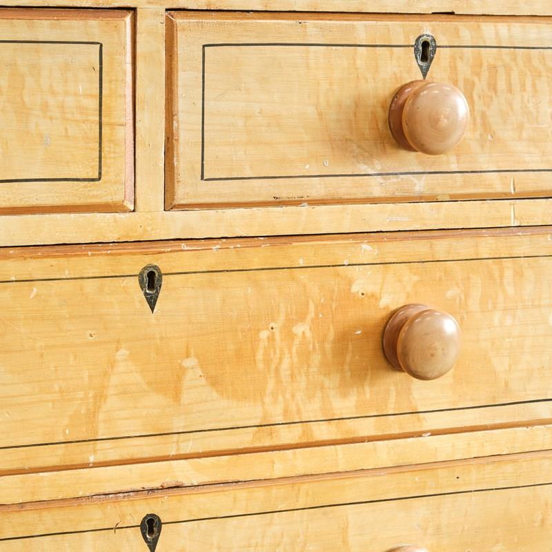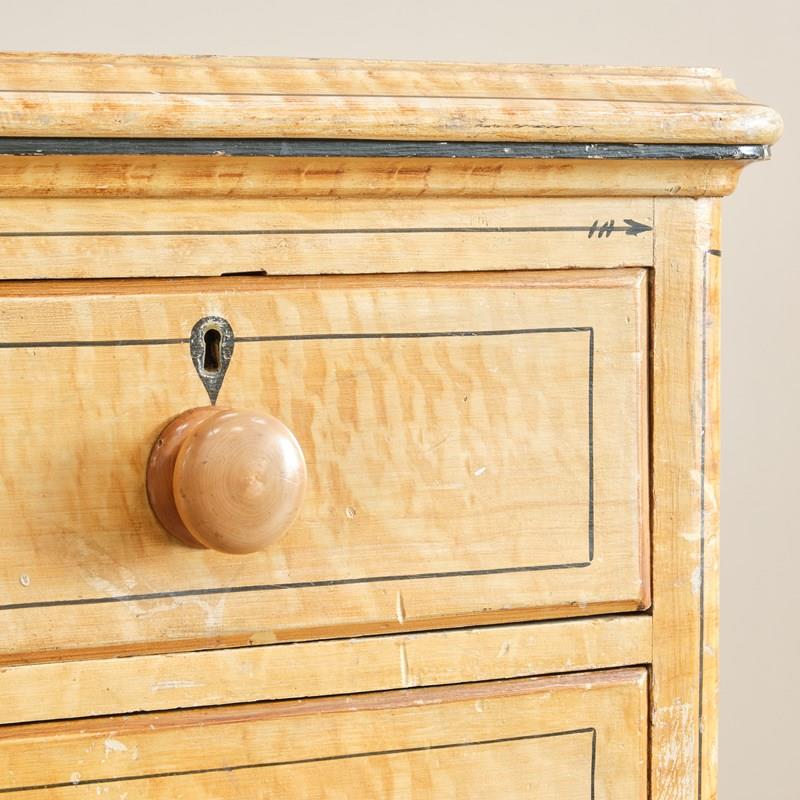 A 19th century pine chest of drawers in the original simulated Birdseye maple painted finish and pin striped details. The drawers retain the original turned knobs and locks. Raised on turned 4 turned feet and with a nice front apron.