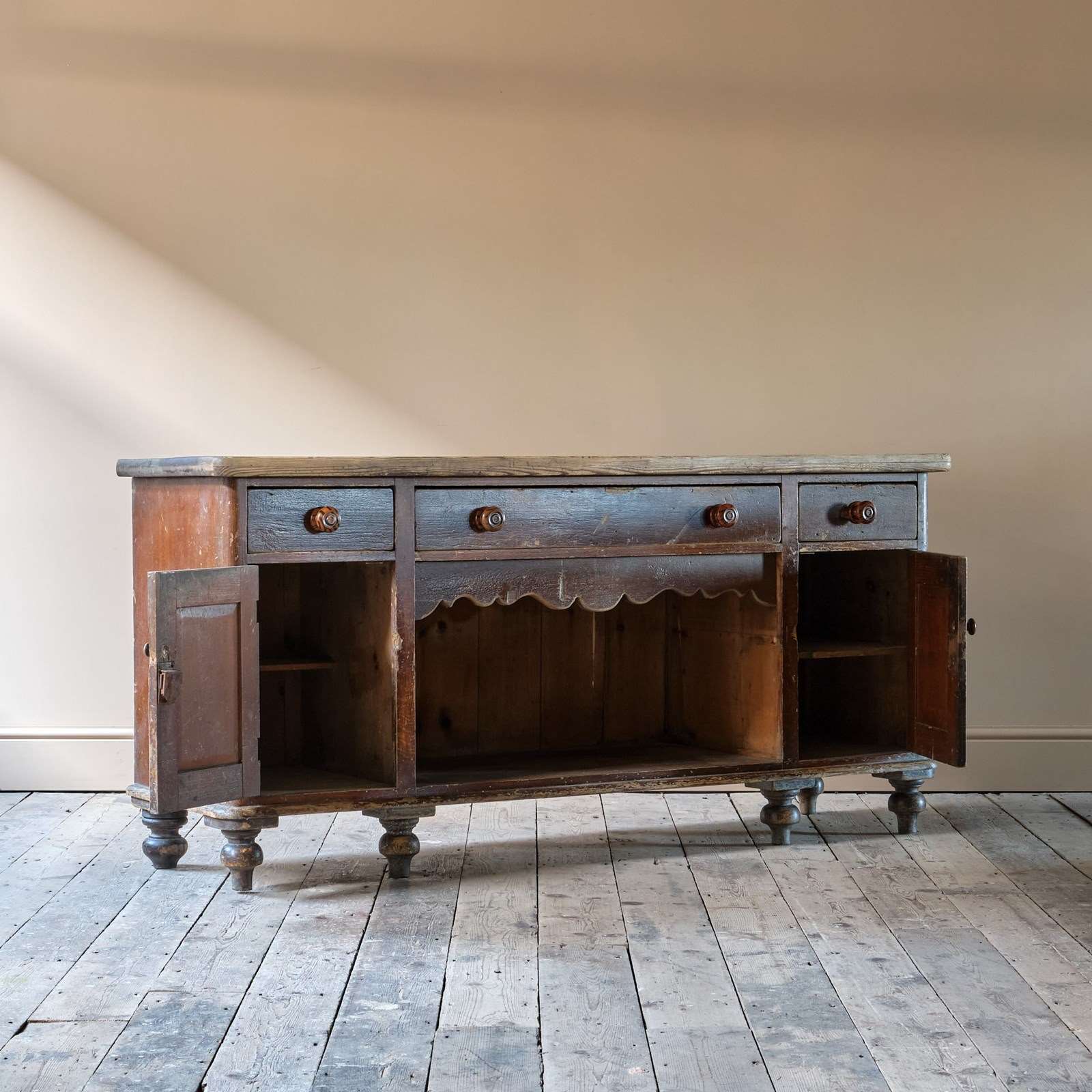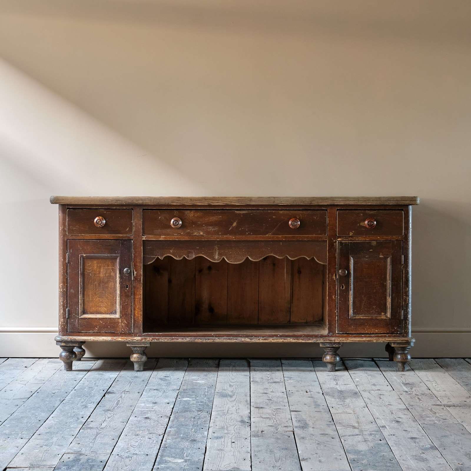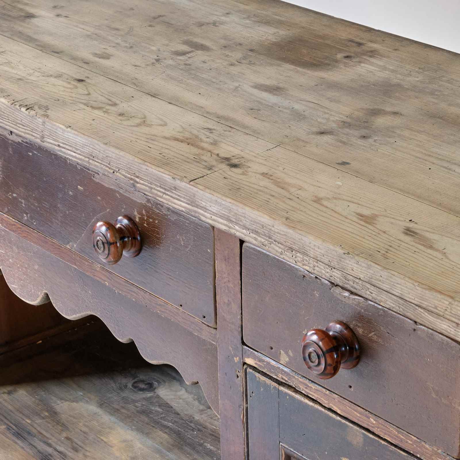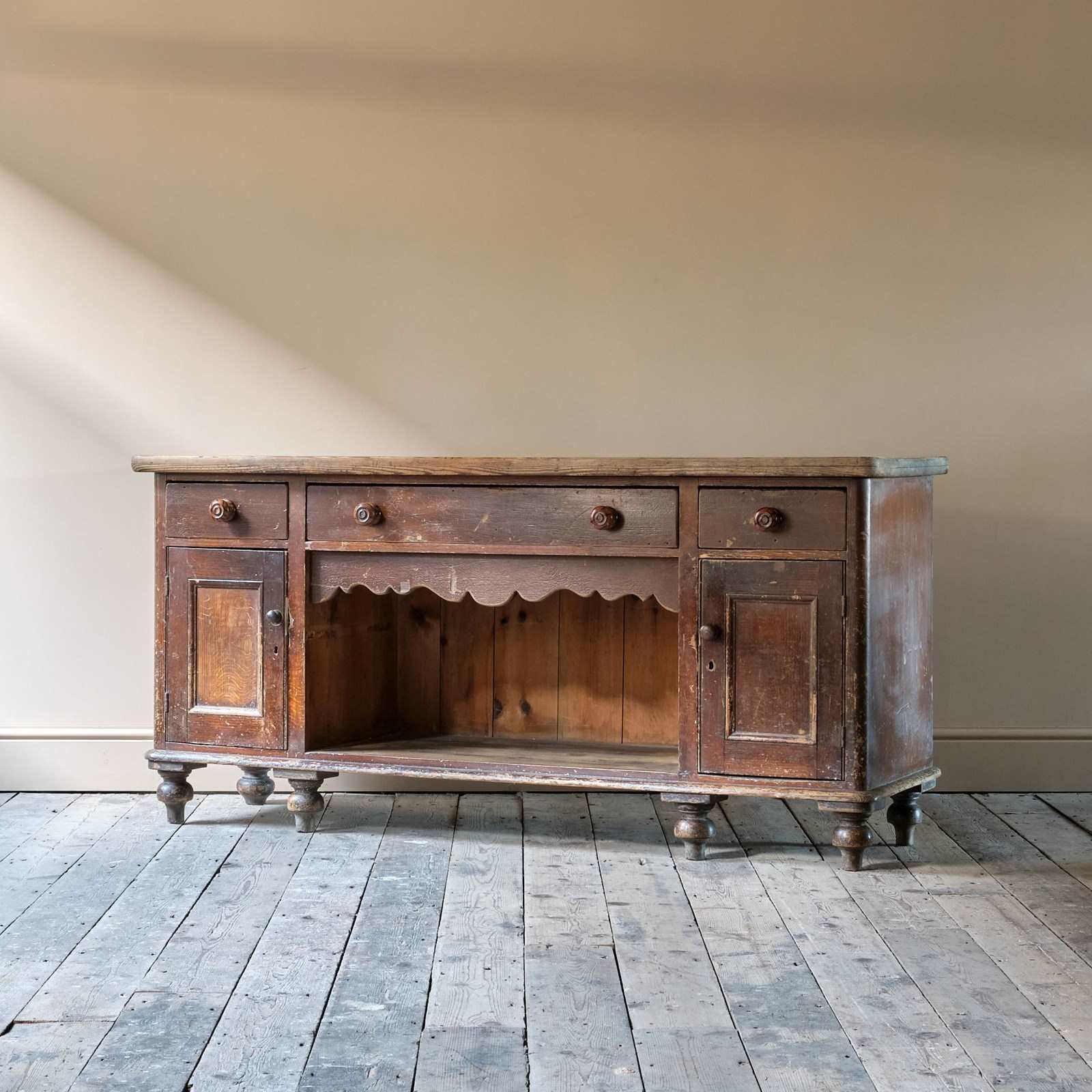 A decorative scalloped apron in the centre is flanked by cupboard and topped with draws.