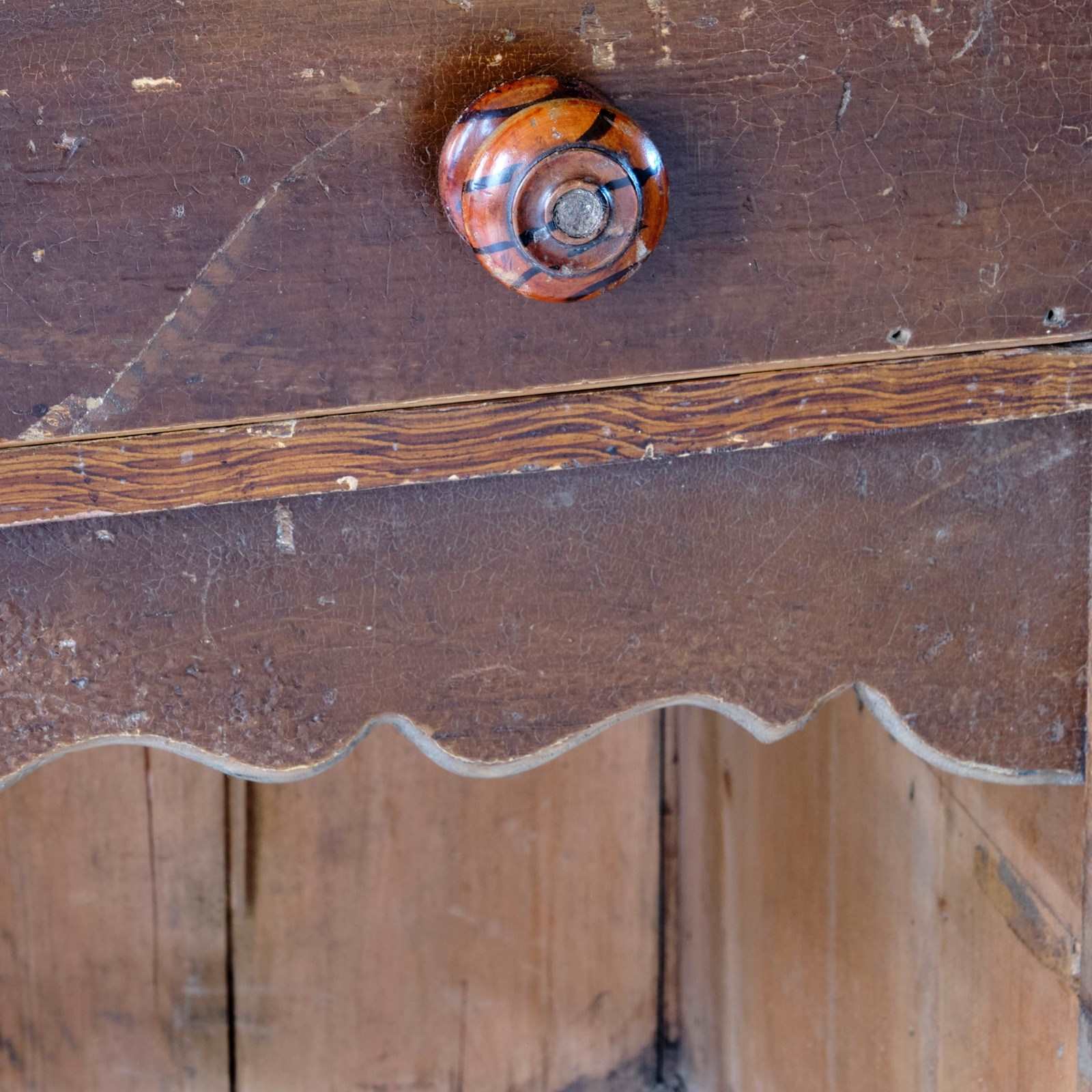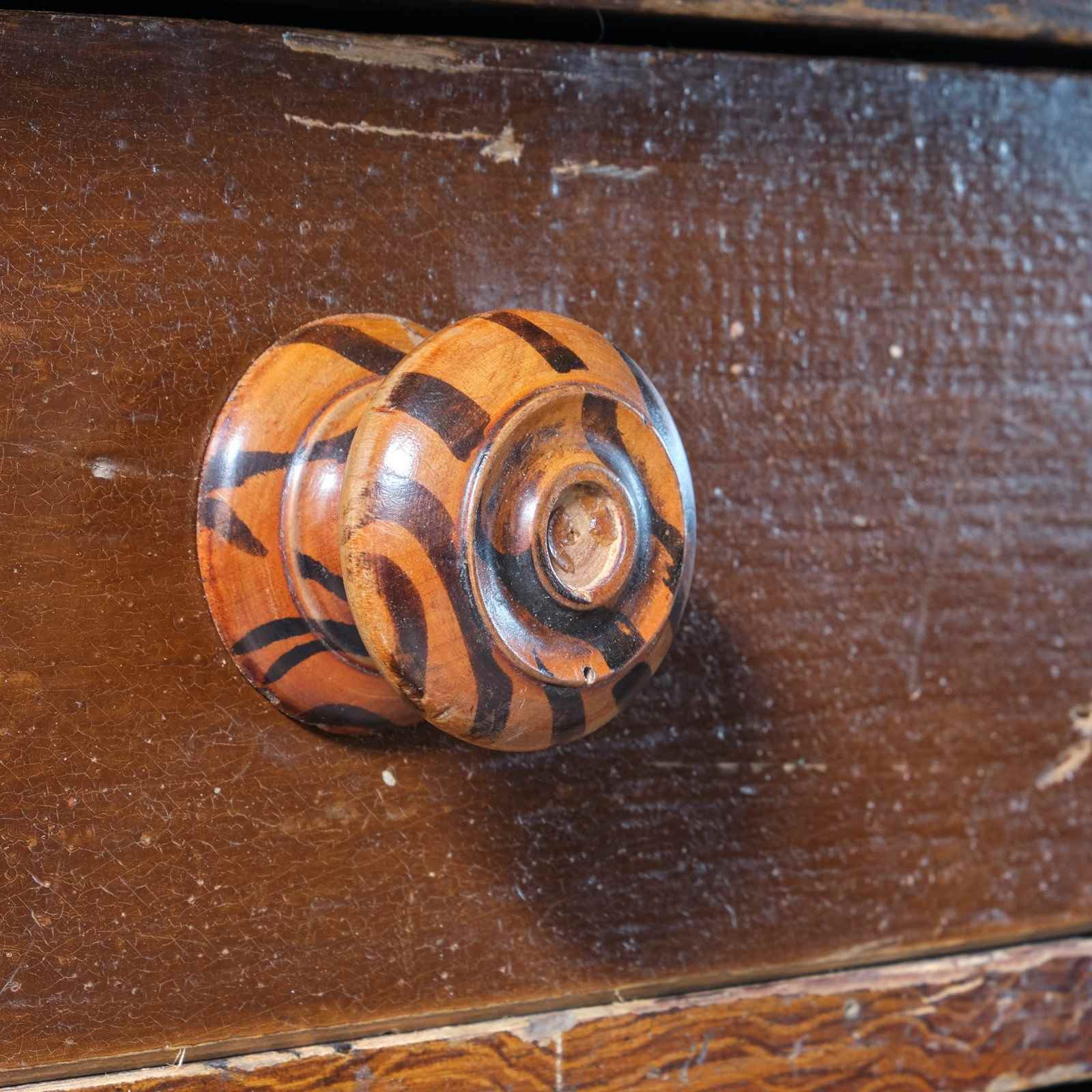 Drawer knobs are painted with tiger stripe patterns.