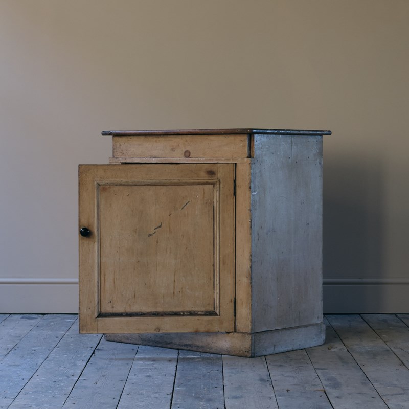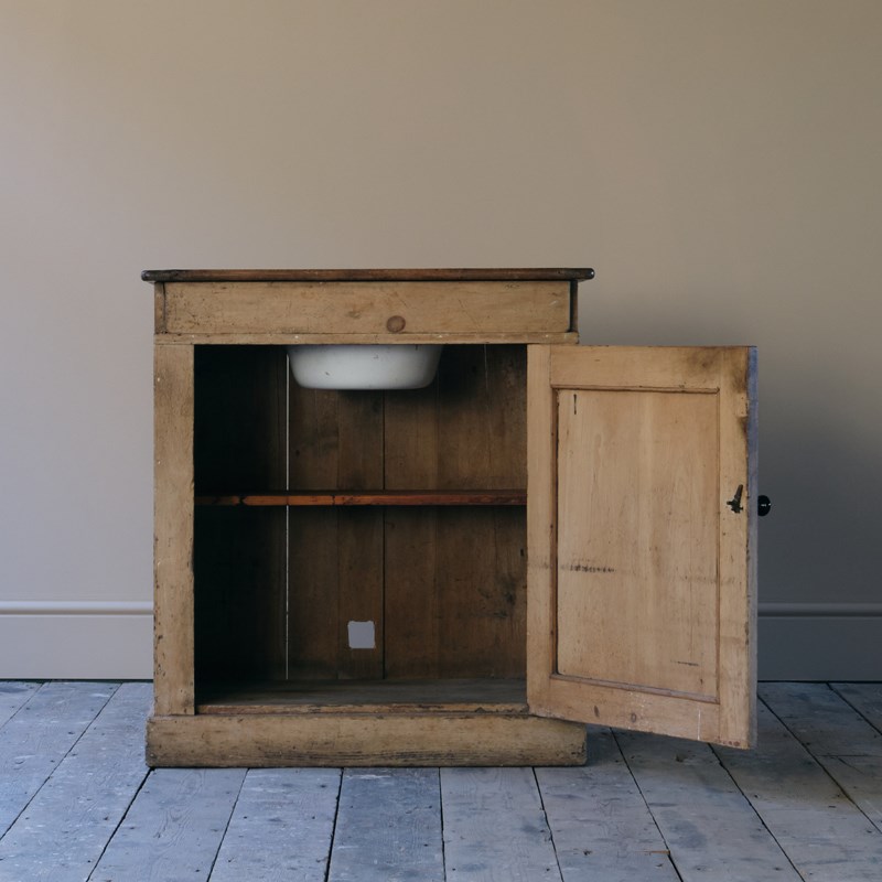 A mid 19th century pine wash stand with a lift up lid, Enamel bowl and singe shelved cupboard. A nice and simple design with an attractive time worn patina. The inner shelf is a replacement.