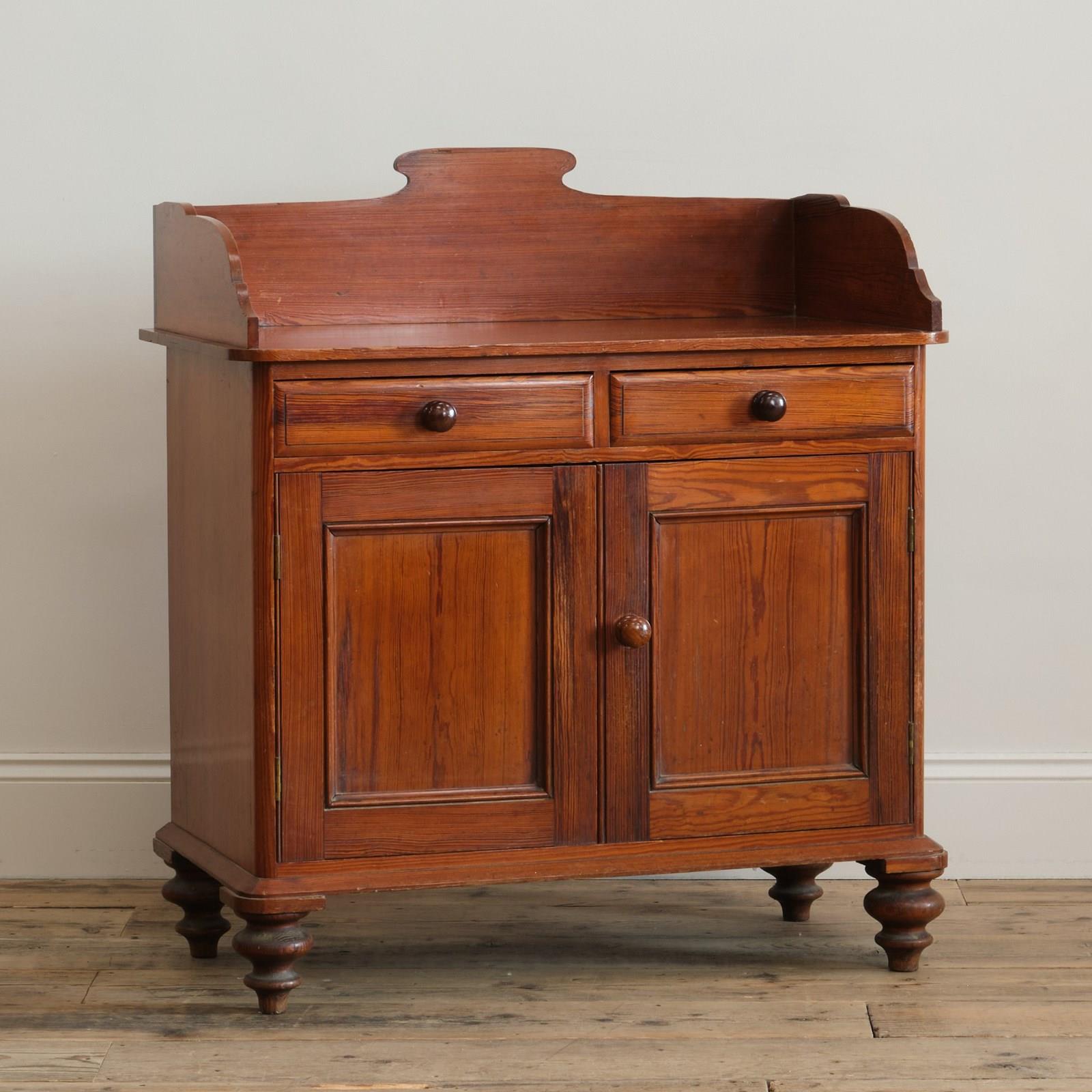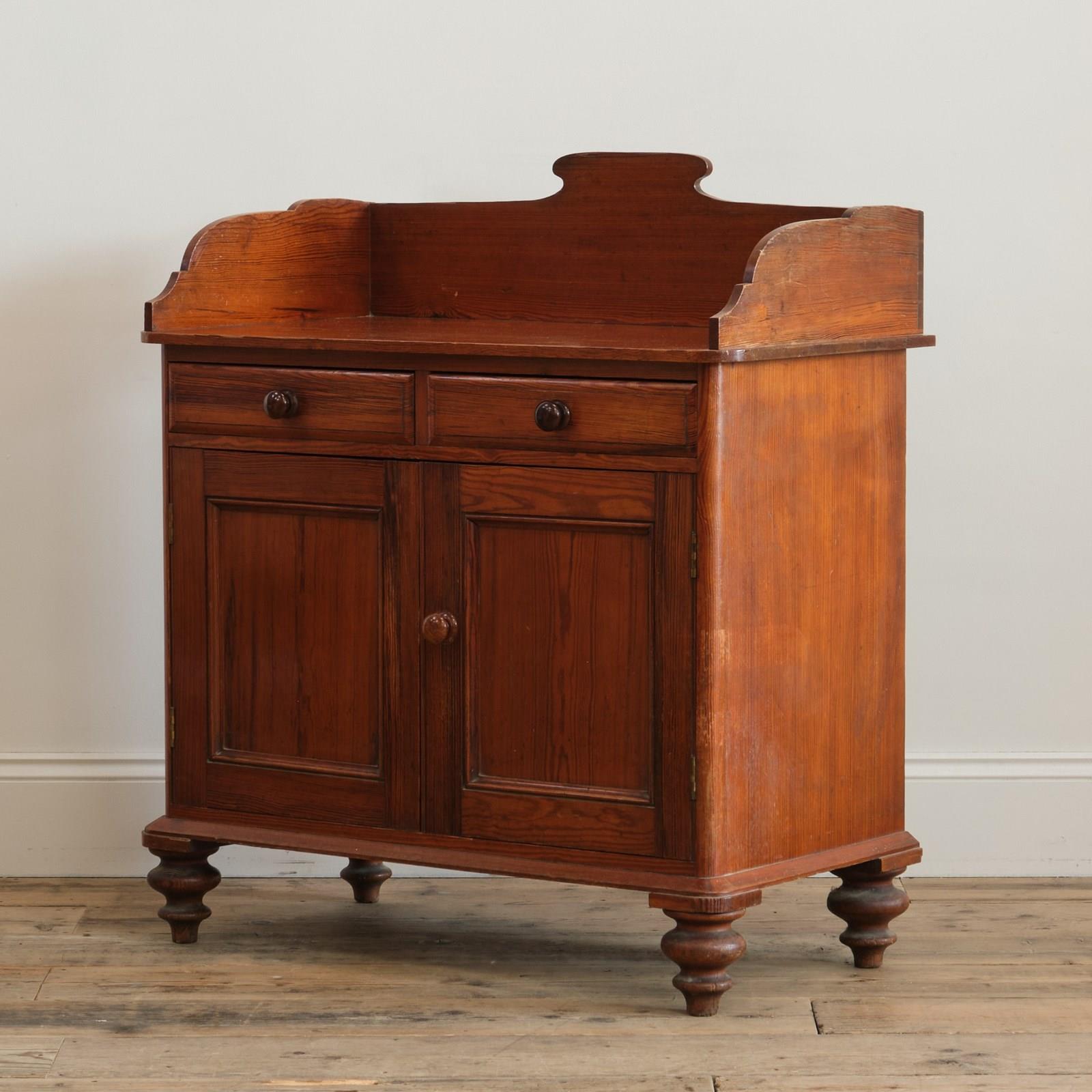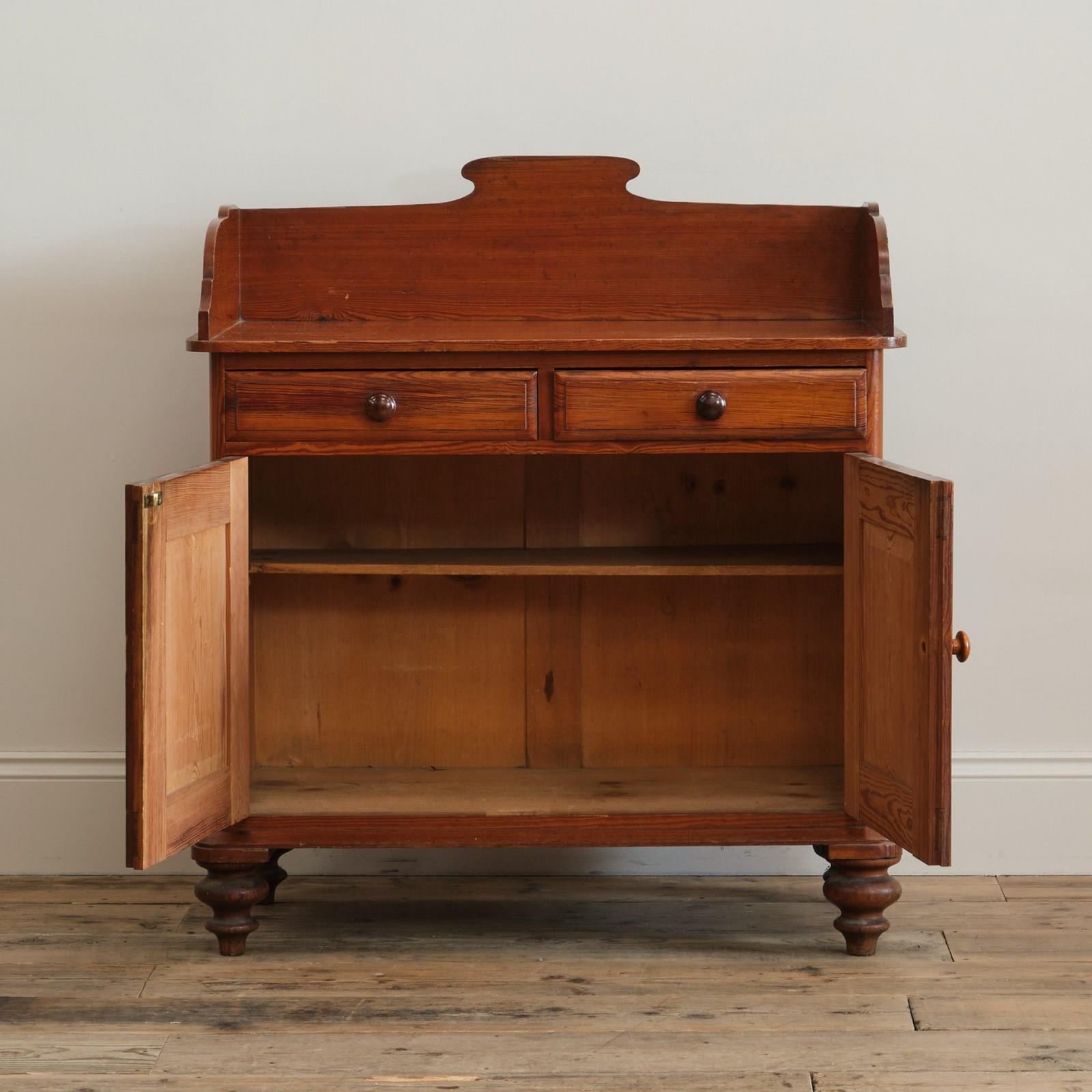 A 19th century pitch pitch pine washstand with 2 drawers and a shelved cupboard. Raised on nice turned feet and the whole with rich colour.
