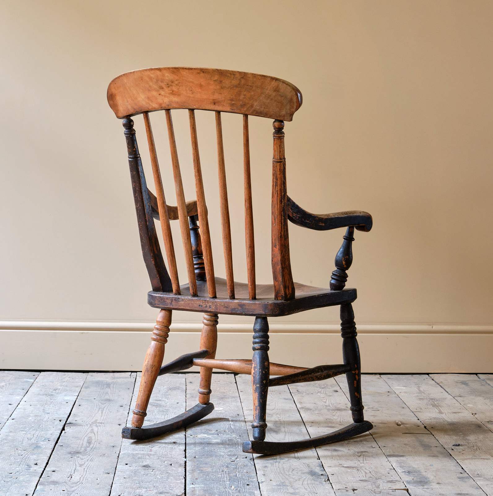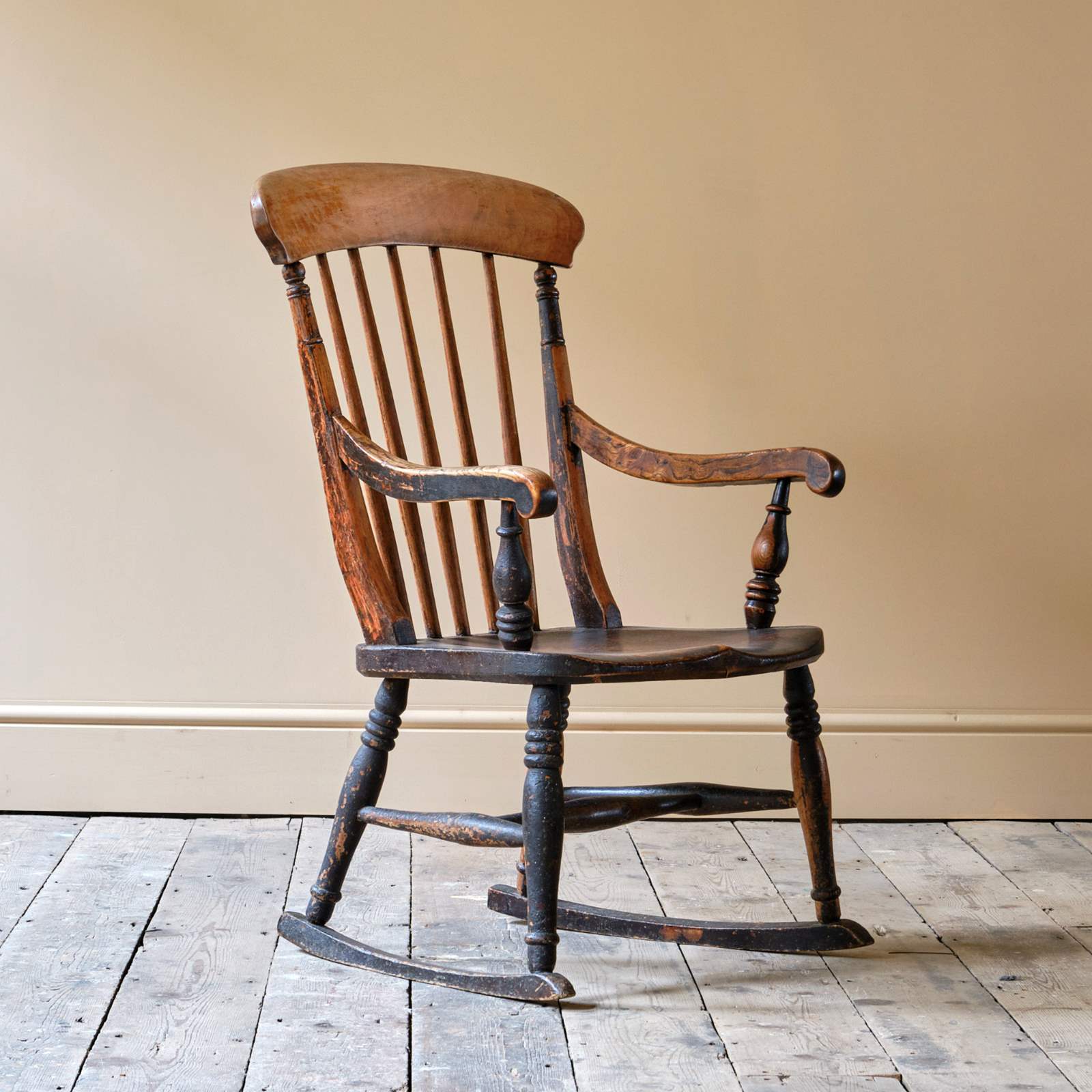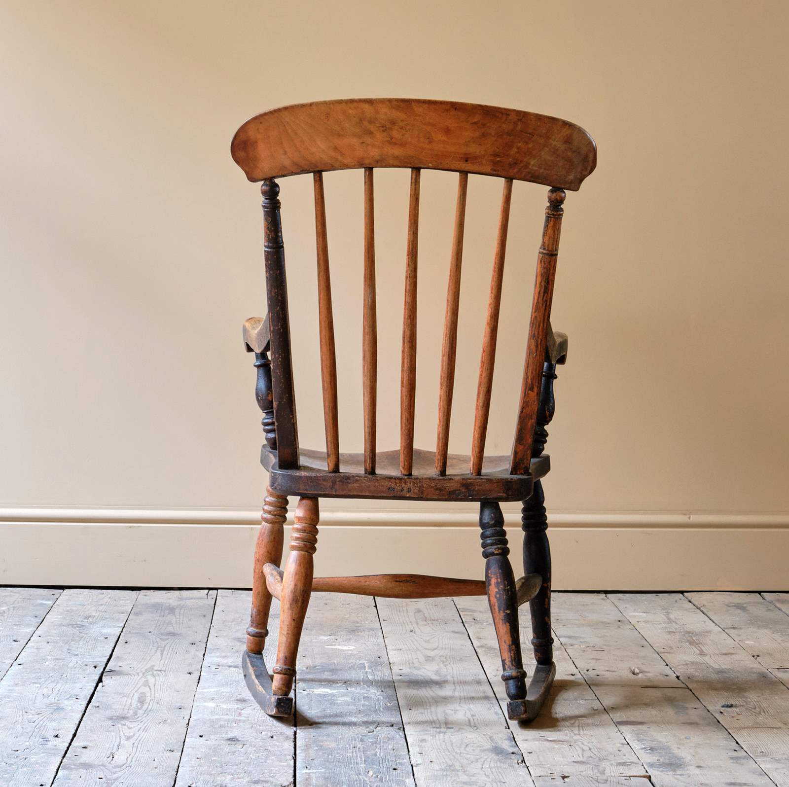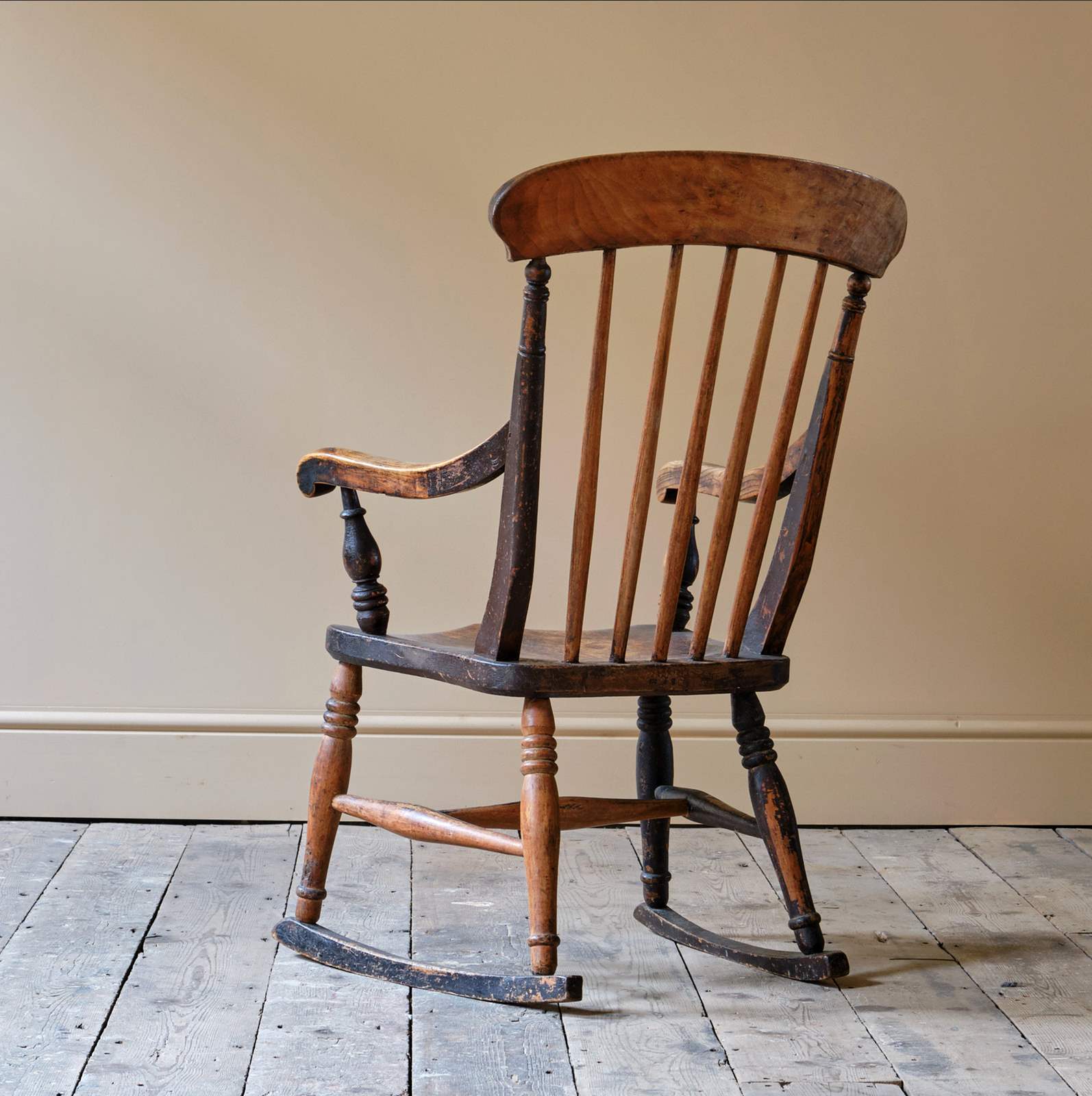 A characterful 19th century Ash and Elm Windsor rocking chair. The rockers with flat spots due to use and the timber has taken on quite a nice dry surface patina with remnants of its original crusty paint.