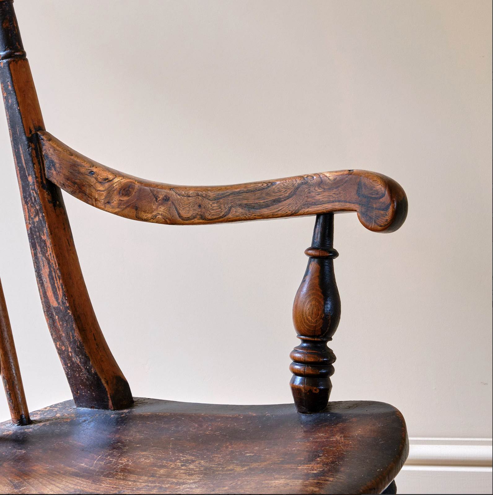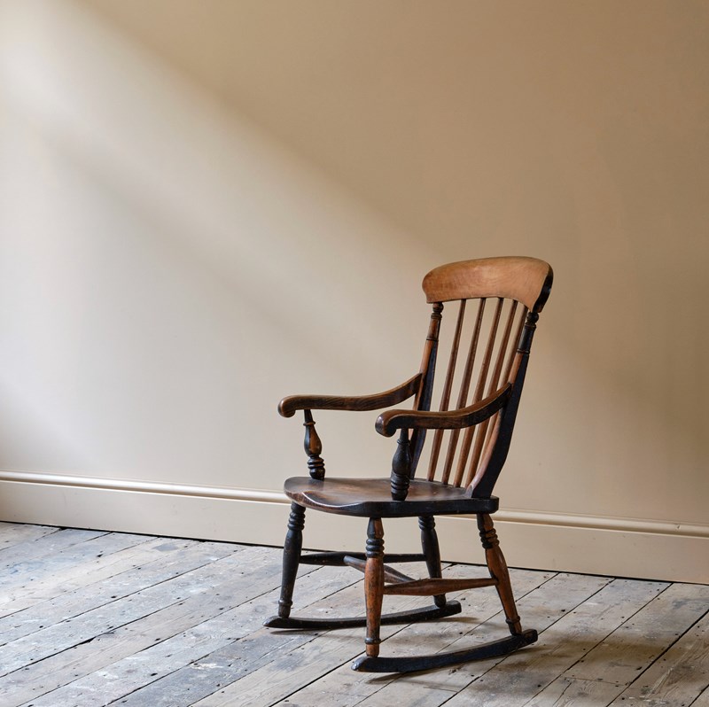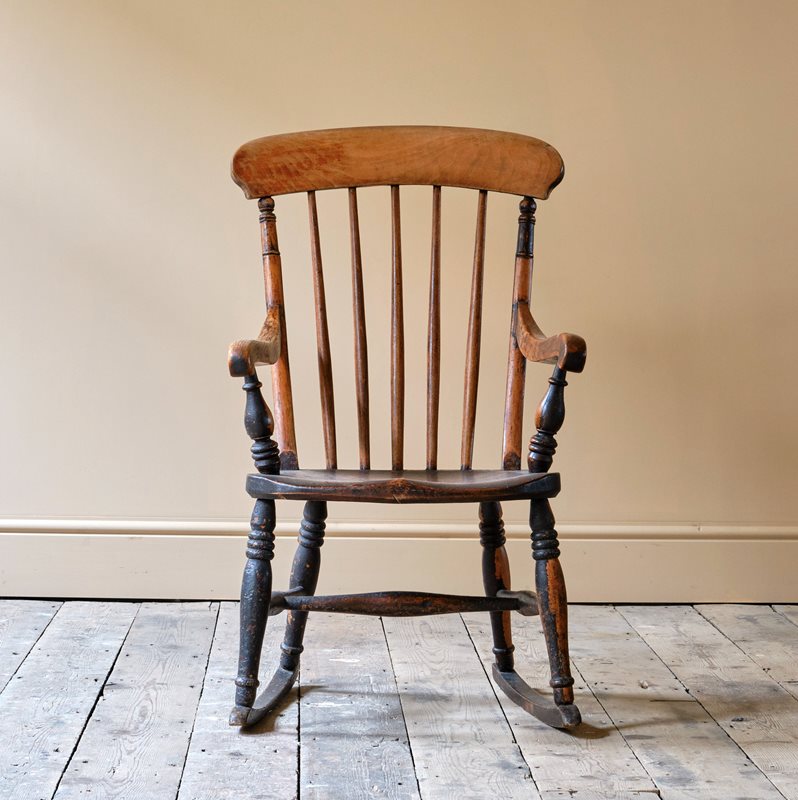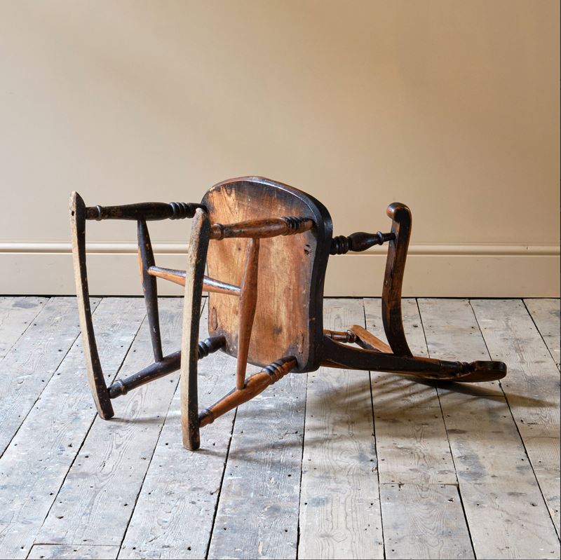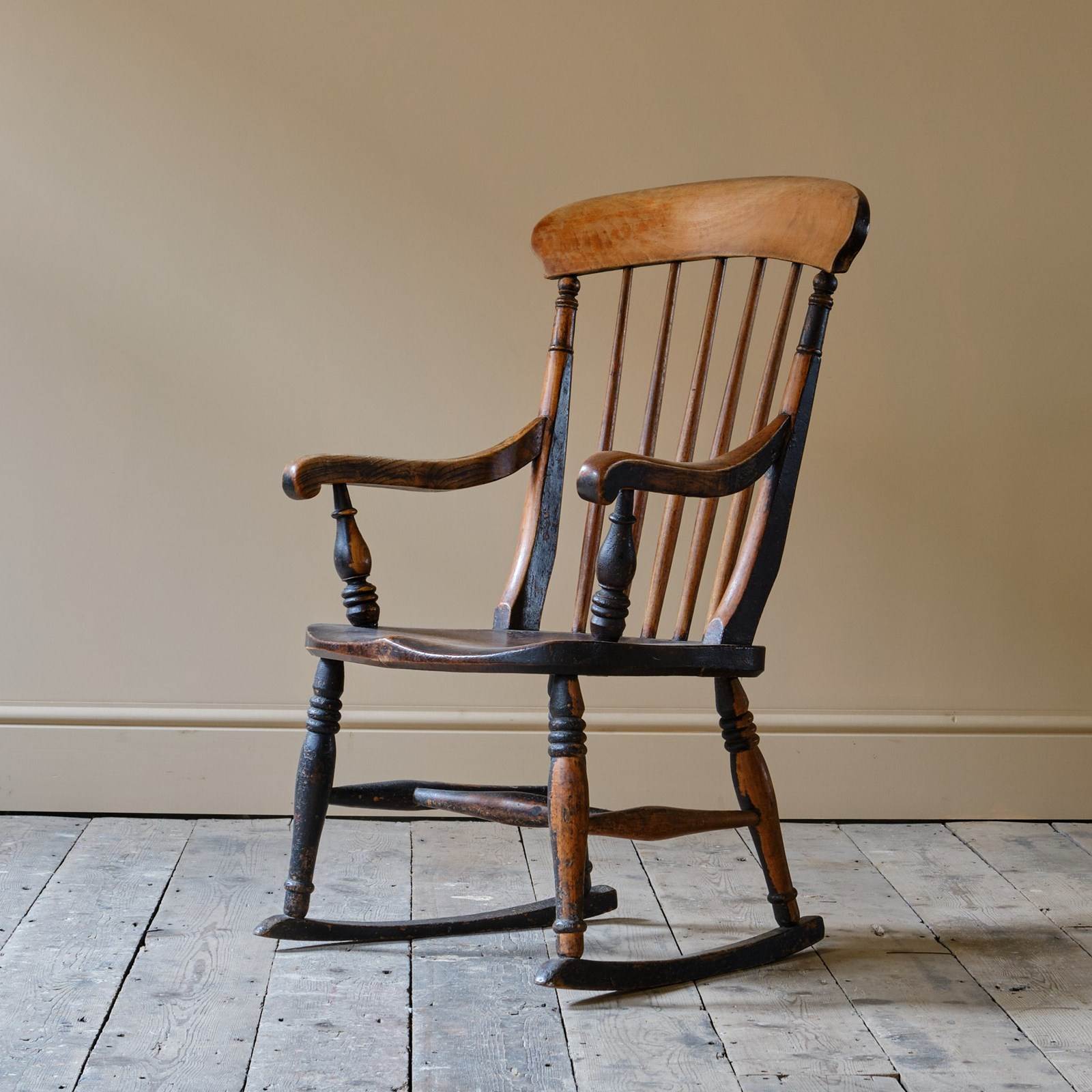 A characterful 19th century Ash and Elm Windsor rocking chair. The rockers with flat spots due to use and the timber has taken on quite a nice dry surface patina with remnants of its original crusty paint.