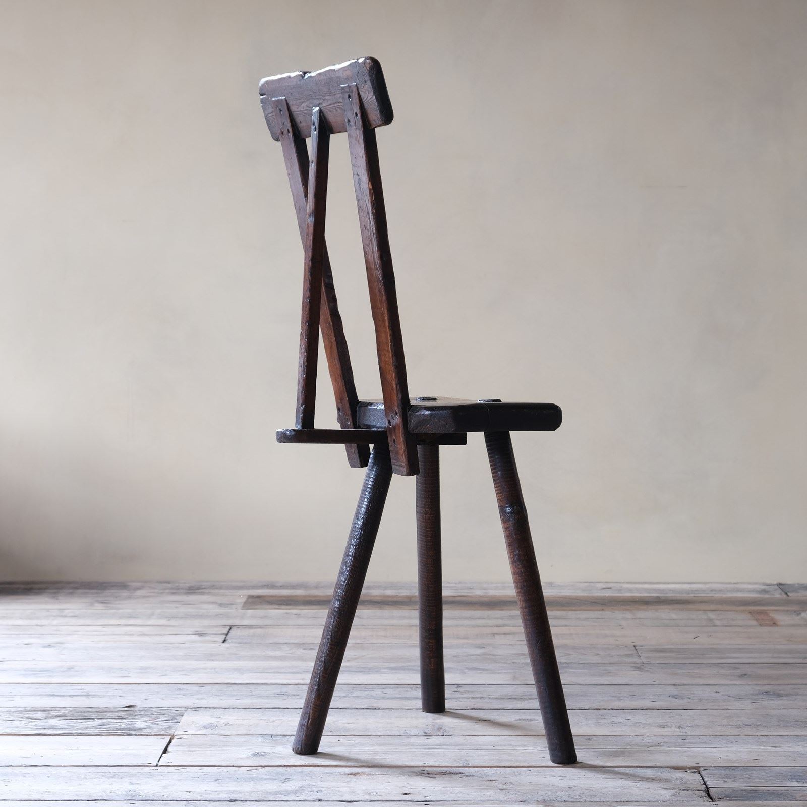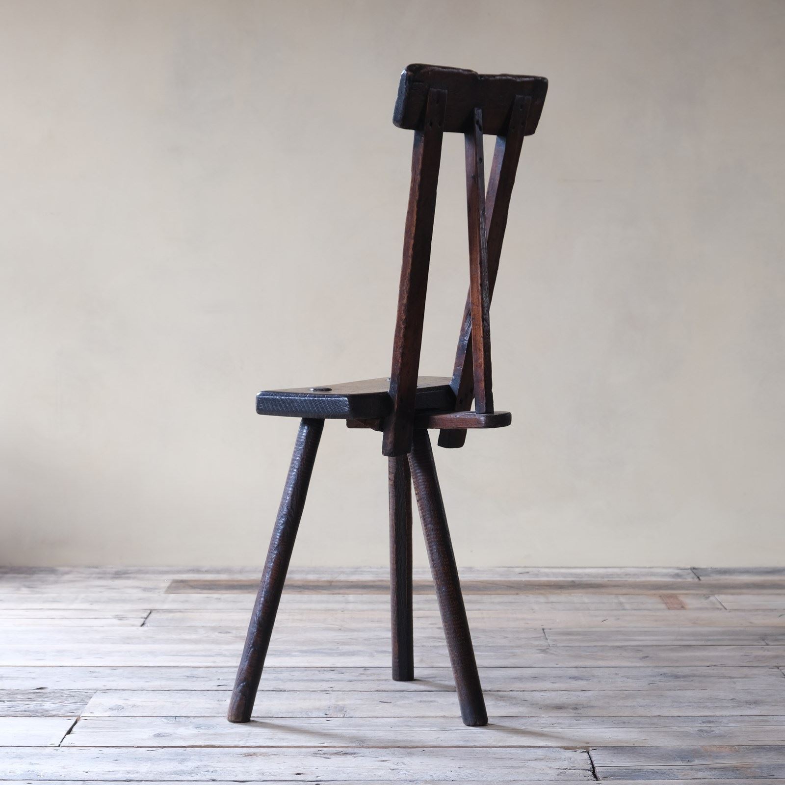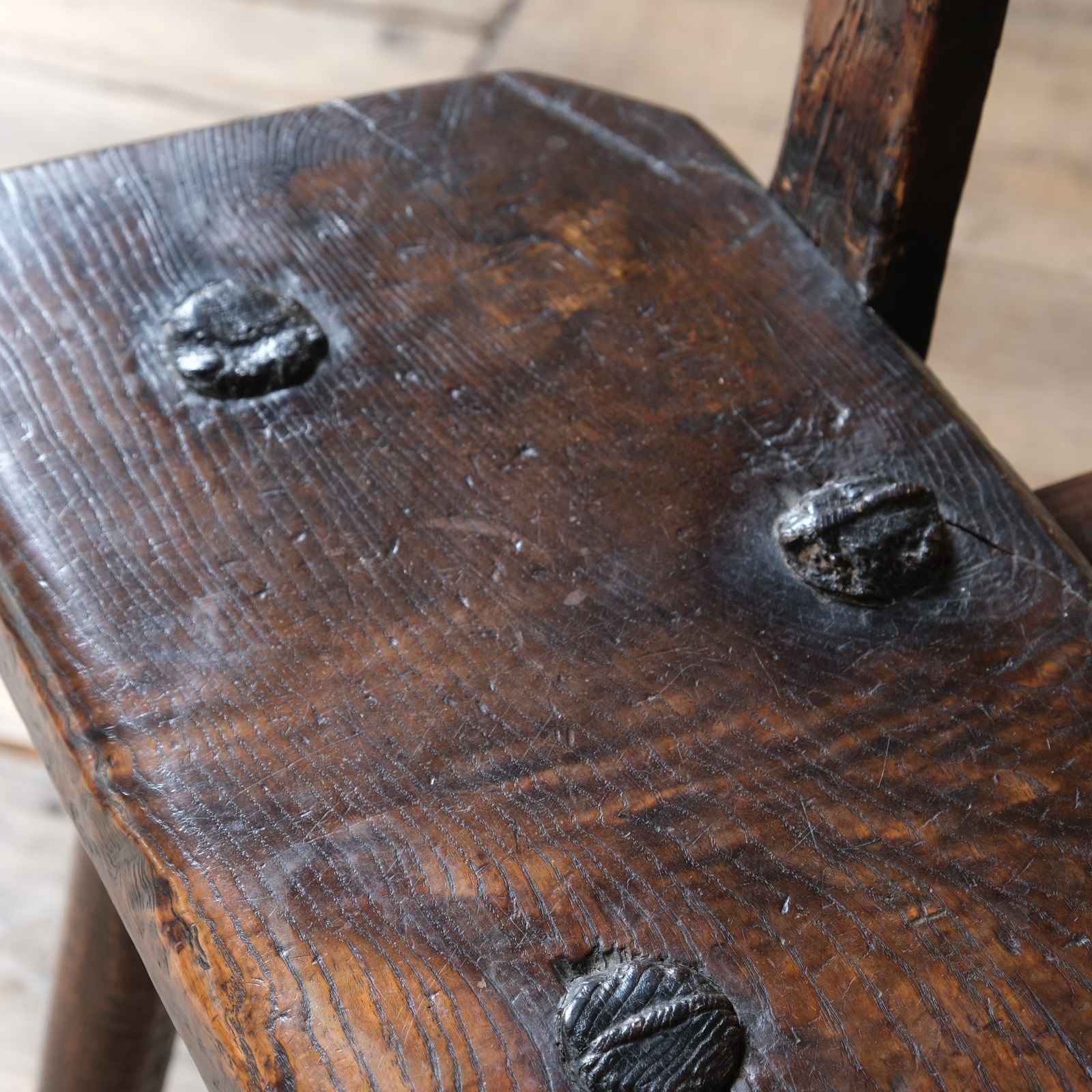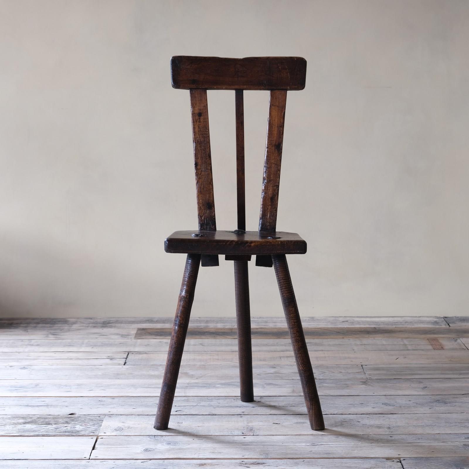 A wonderful and rare 19th century ash and elm cutlers stool with hand turned ribbed legs making this stool specific to Sheffield area. What makes this stool rather unusual is that it appears to have a period modification and fitted with a pine back support. I have had a couple of these stools in the past and have never seen one with this design. A nice attractive tone and wear throughout with no signs of repair.