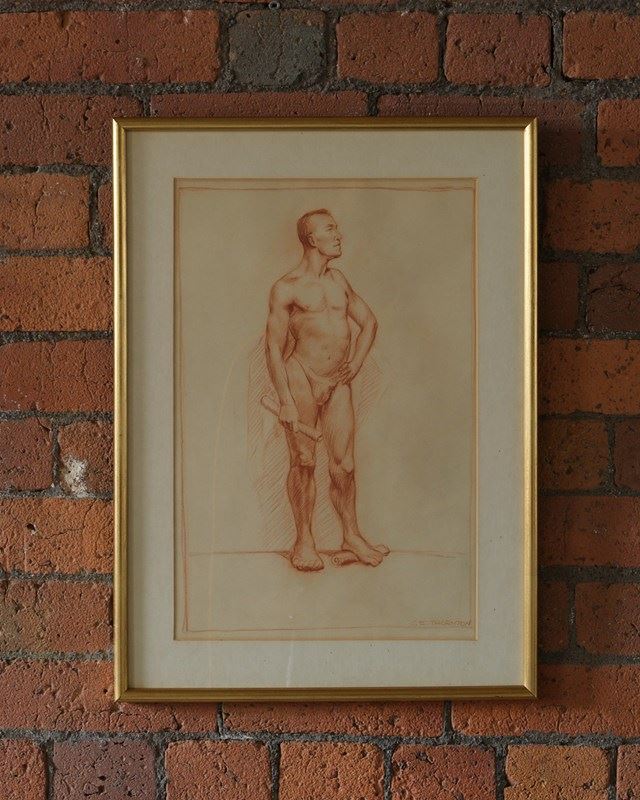 A mid 20th century male nude study in chalk on paper with a contemporary frame.