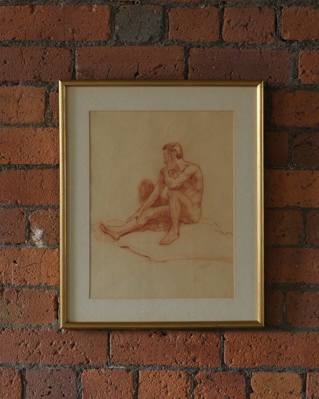 A mid 20th century male nude study in chalk on paper with a contemporary frame.