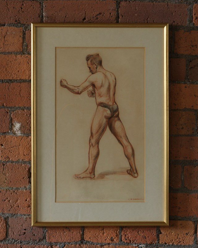 A mid 20th century male nude study in chalk and pencil on paper with a contemporary frame.