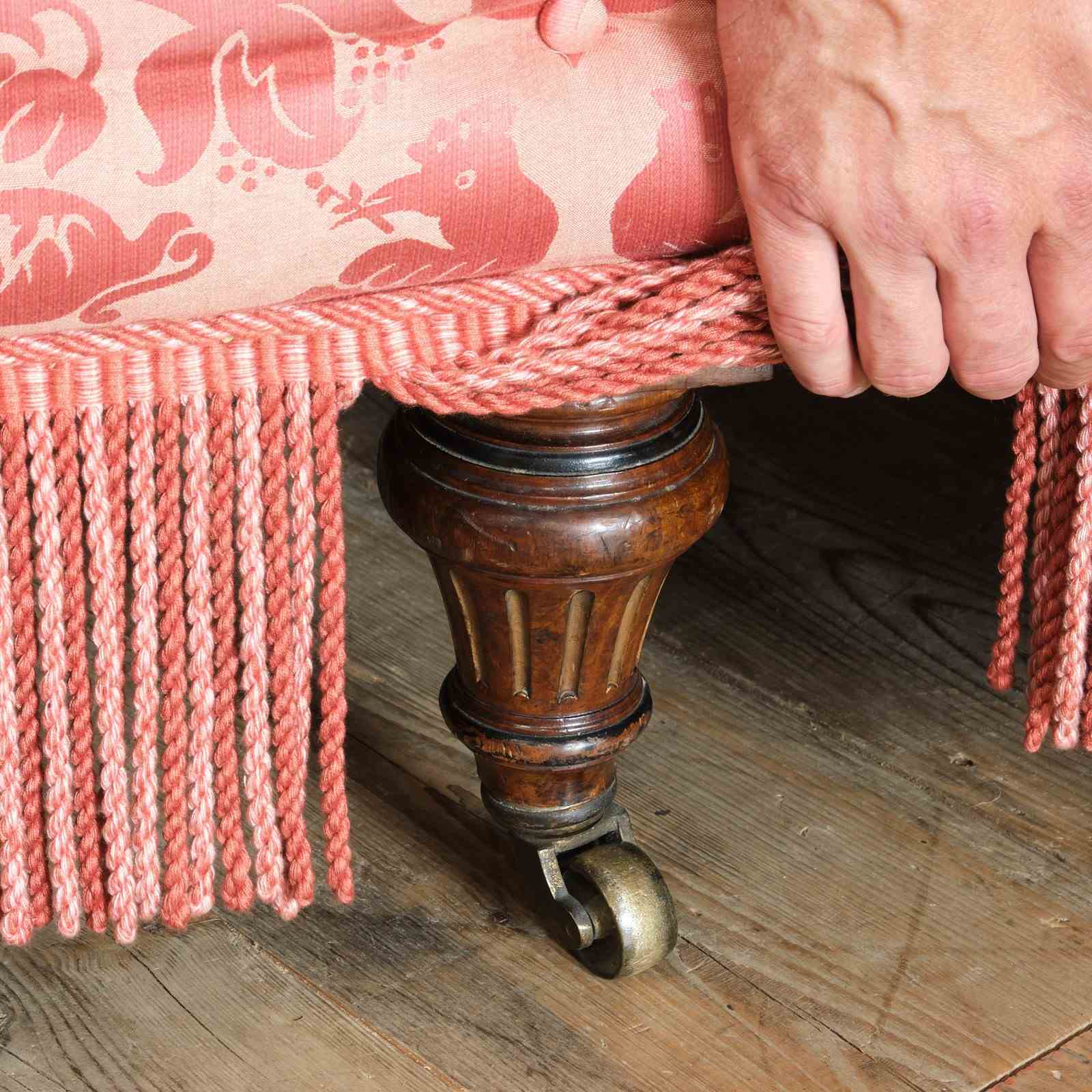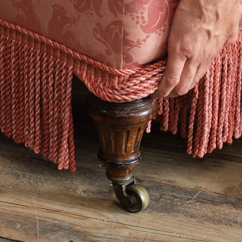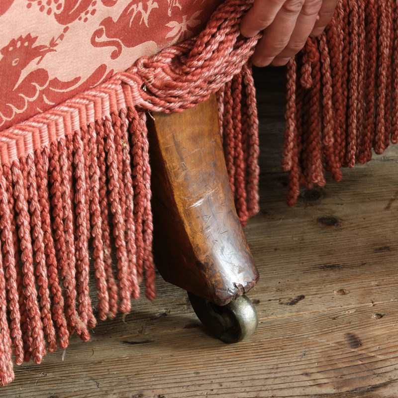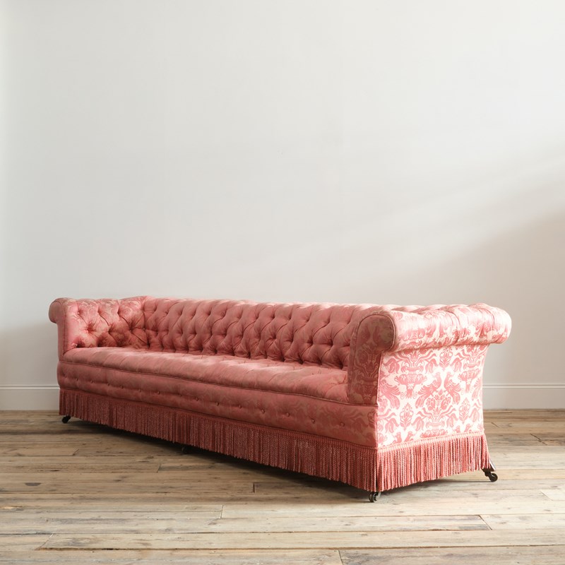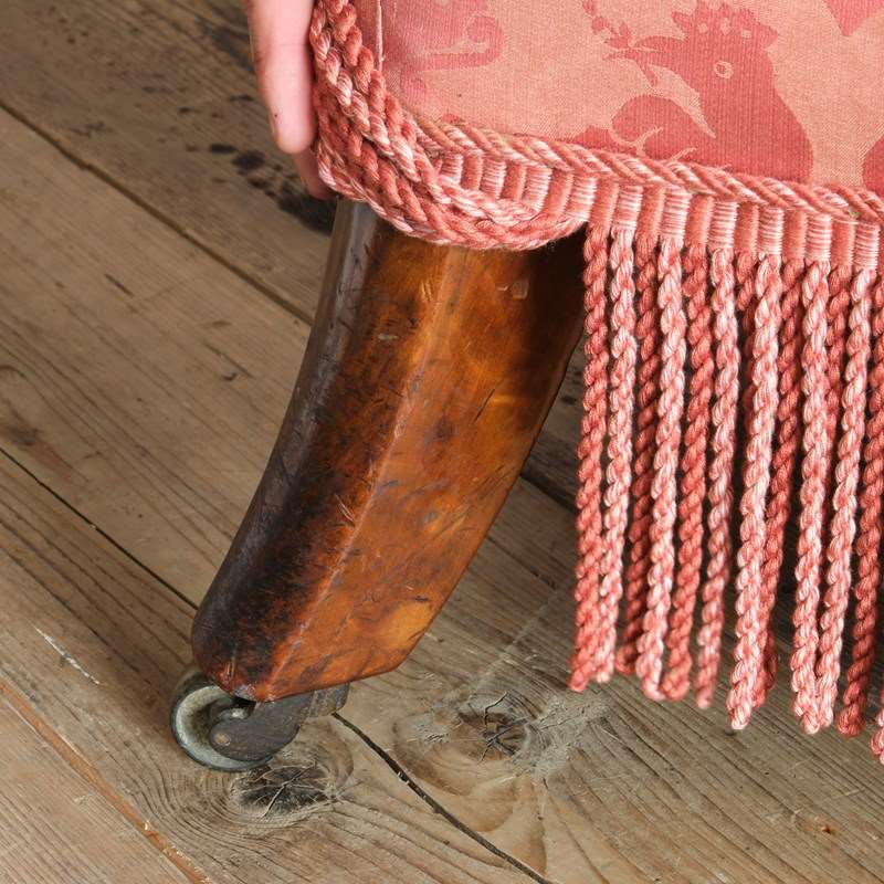 Currently upholstered in a pink demask satin silk which is in ready to condition and in our opinion really suits the sofa. Its not perfect and does have minimal wear as you may expect.