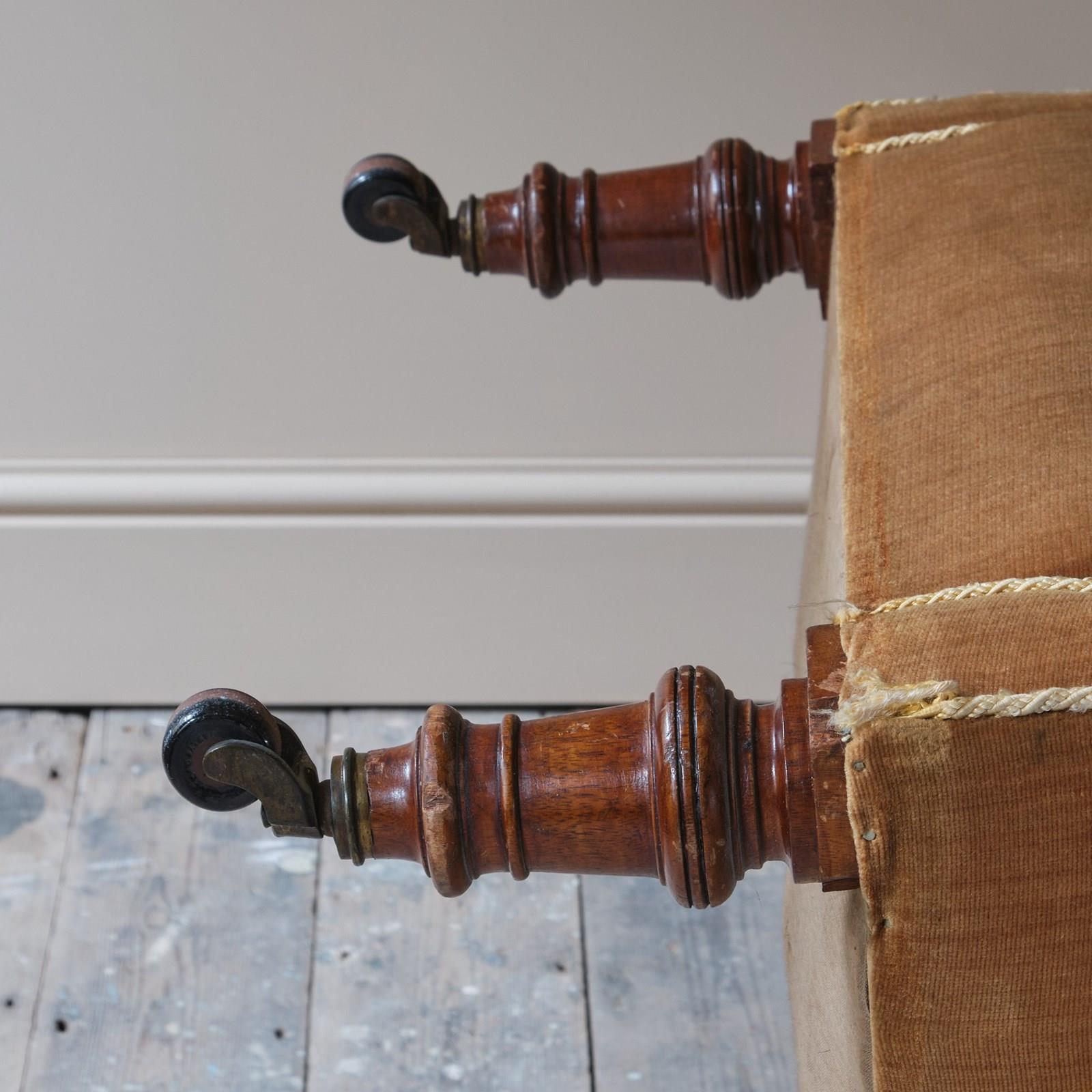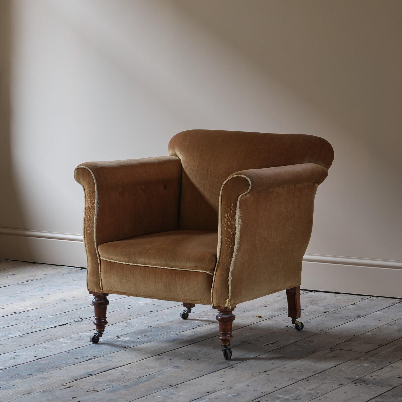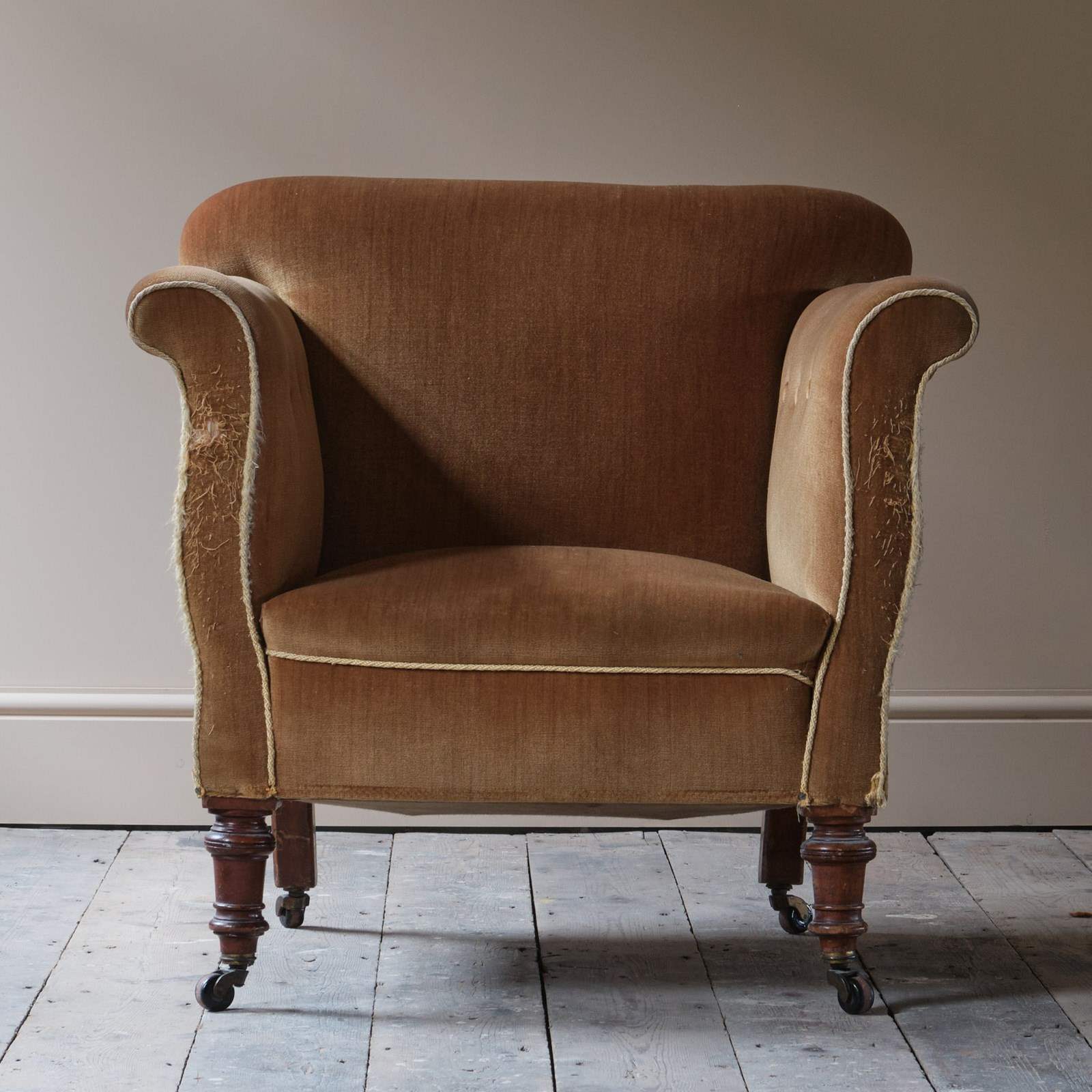 A well drawn late 19th century country house armchair. Raised on turned walnut front legs and splayed rear legs. English c1880