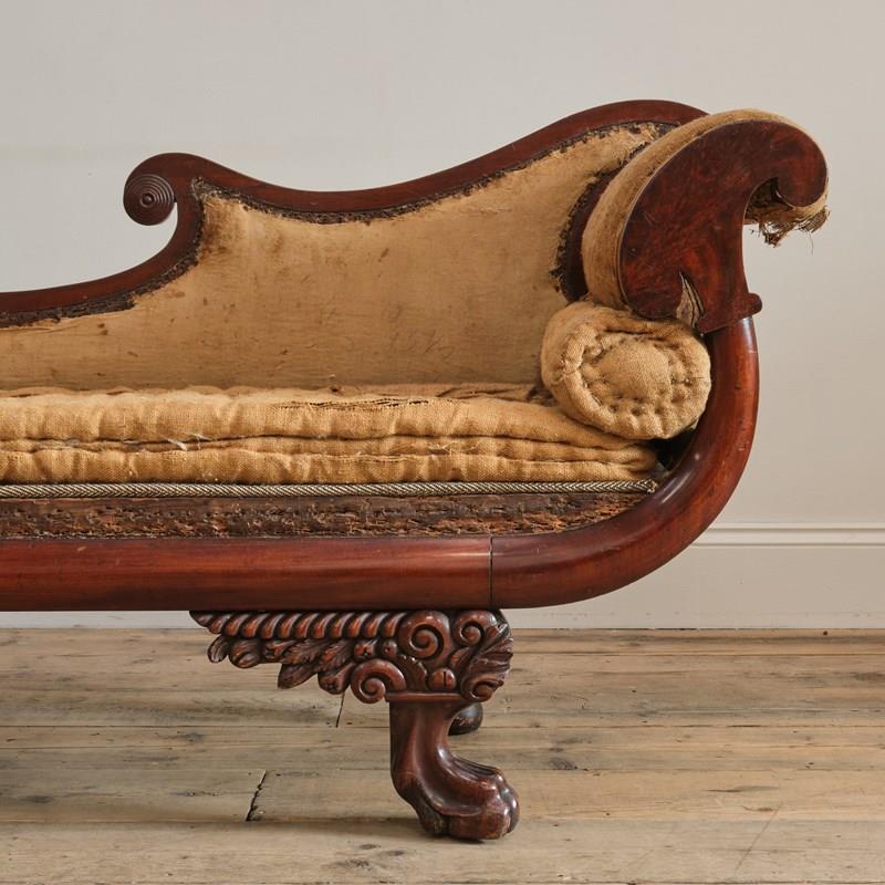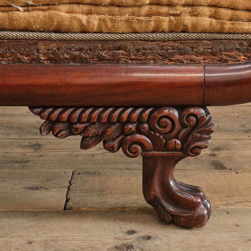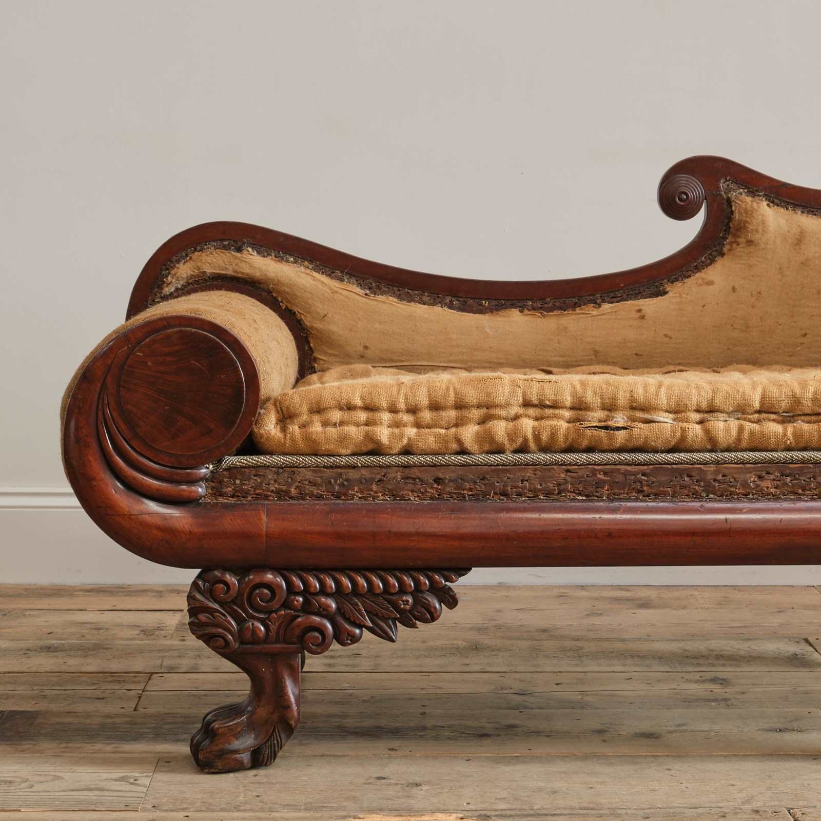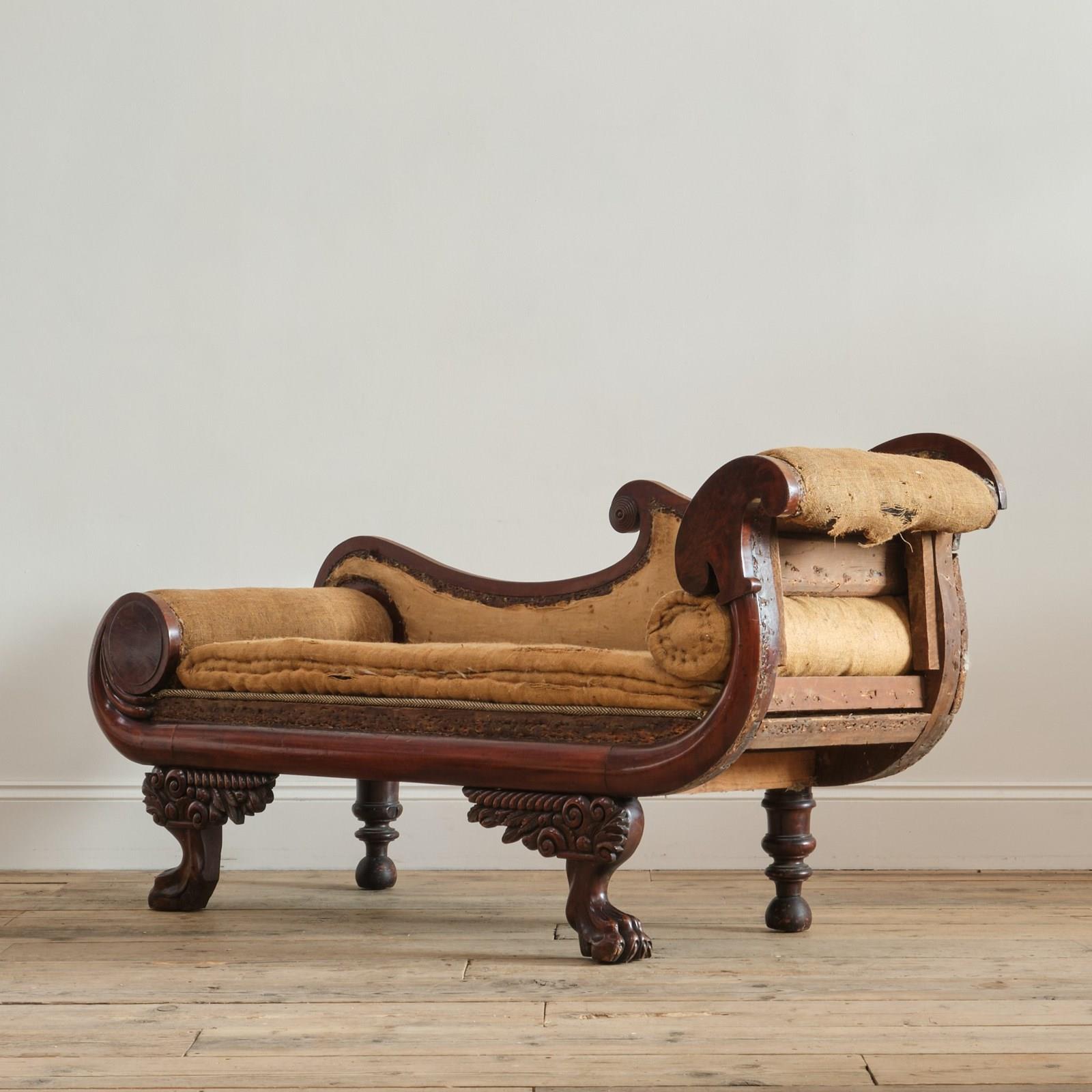 A diminutive American Regency period Recamier Chaise Longue. Raised on Carved paw front feet and turned back legs. Nicely figured mahogany front show wood and with a pine frame. The rear of the piece has an inscription which we believe reads 'H Shmidt - Boston Massachusetts 1762' The 1762 possibly refers to an address and not the date it was manufactured.