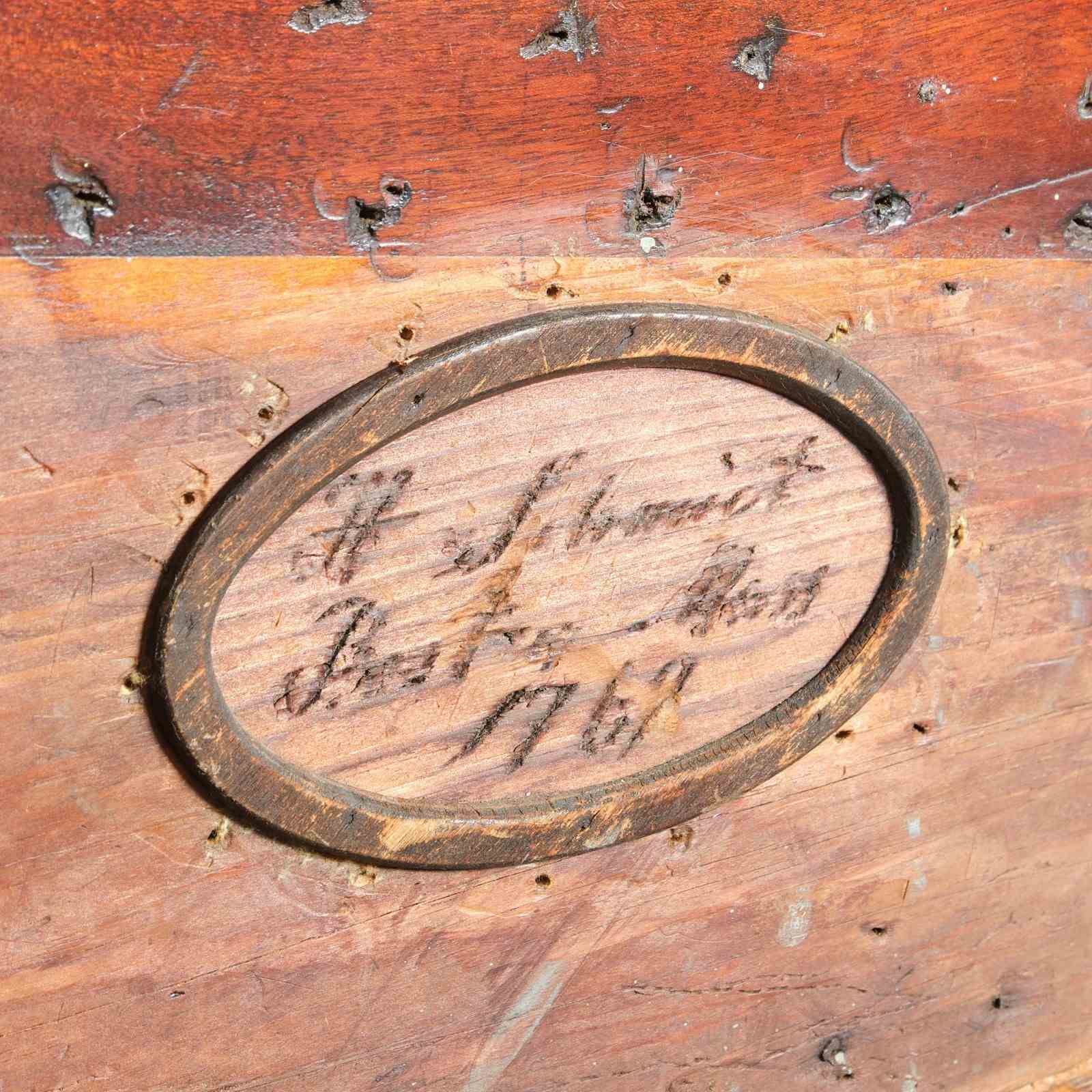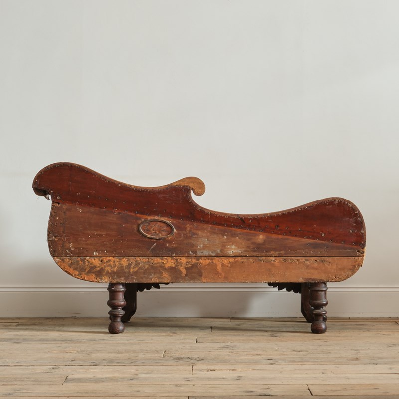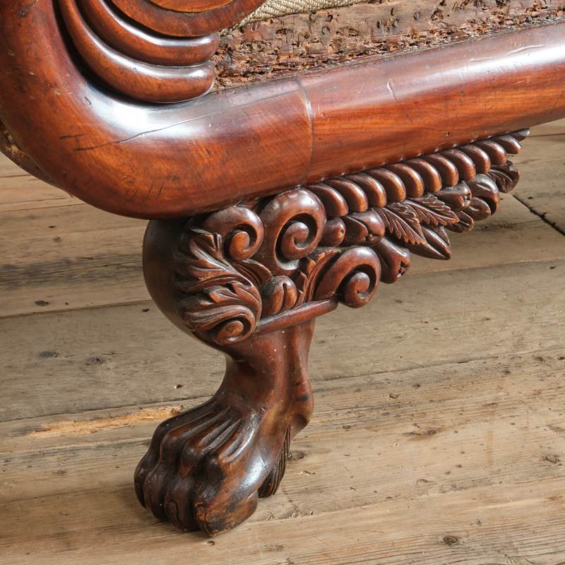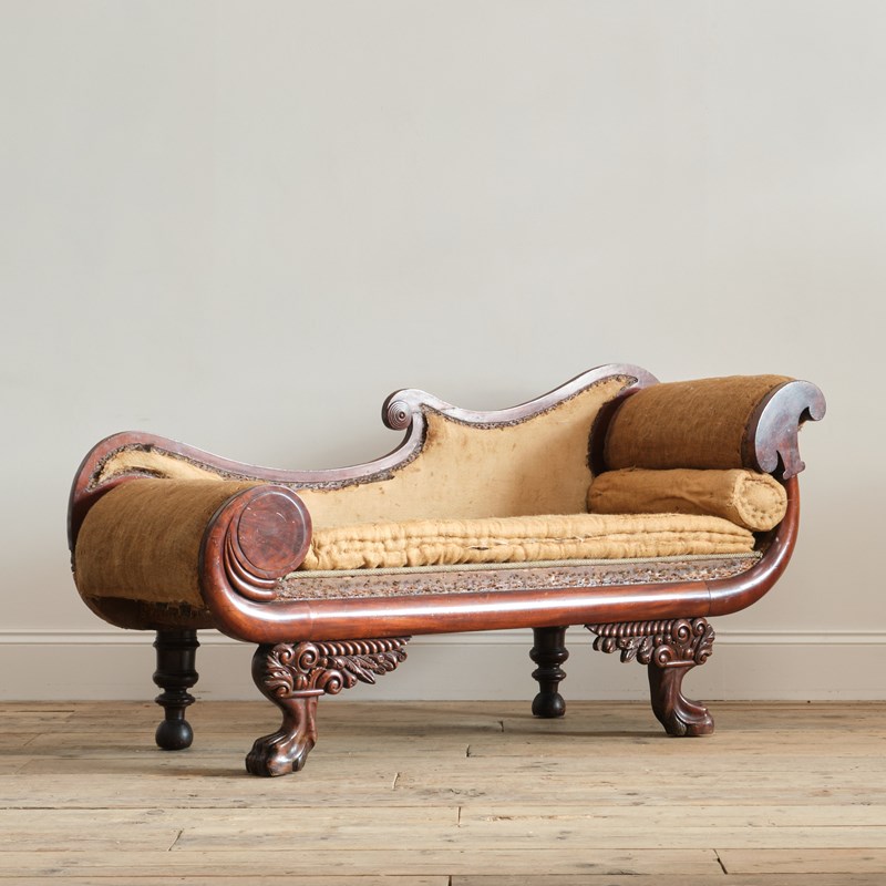 A diminutive American Regency period Recamier Chaise Longue. Raised on Carved paw front feet and turned back legs. Nicely figured mahogany front show wood and with a pine frame. The rear of the piece has an inscription which we believe reads 'H Shmidt - Boston Massachusetts 1762' The 1762 possibly refers to an address and not the date it was manufactured.
