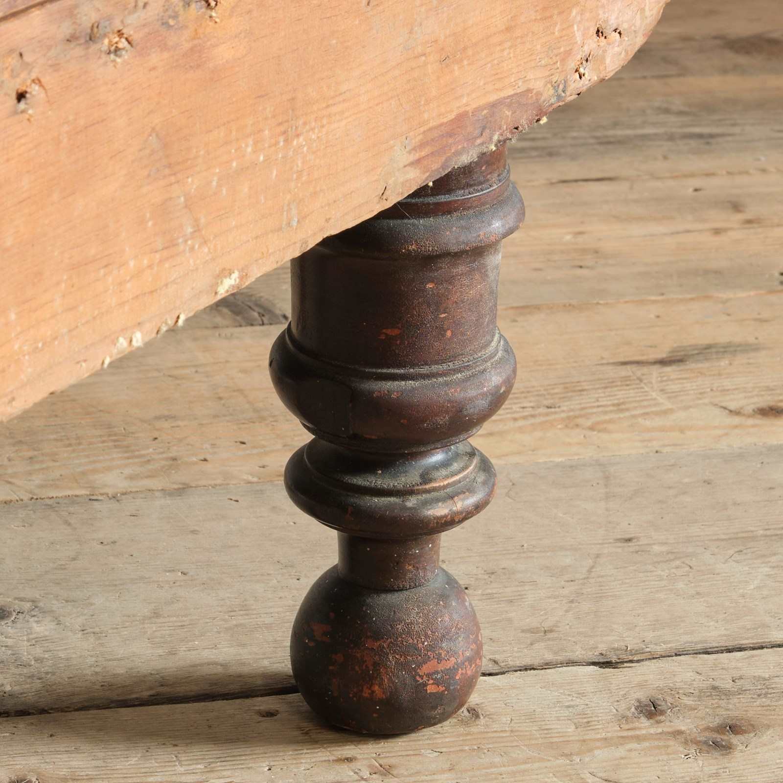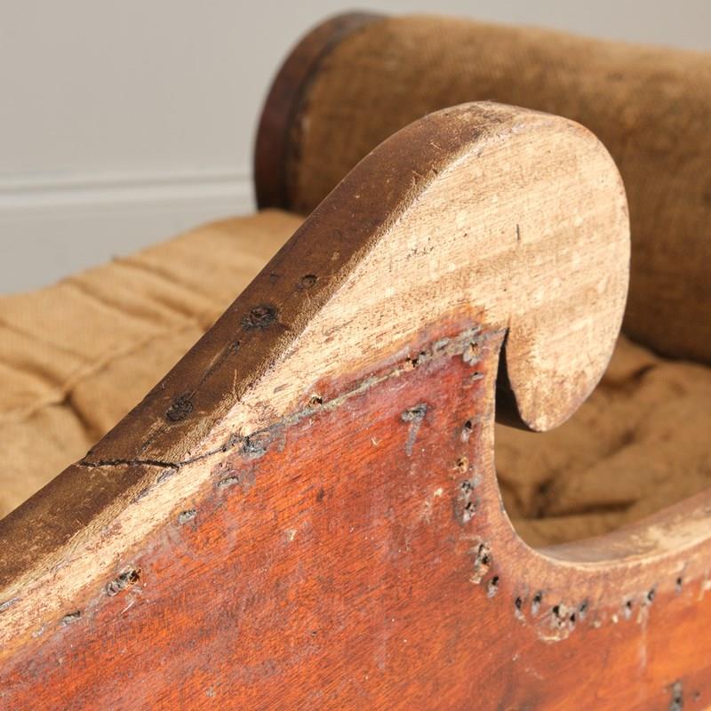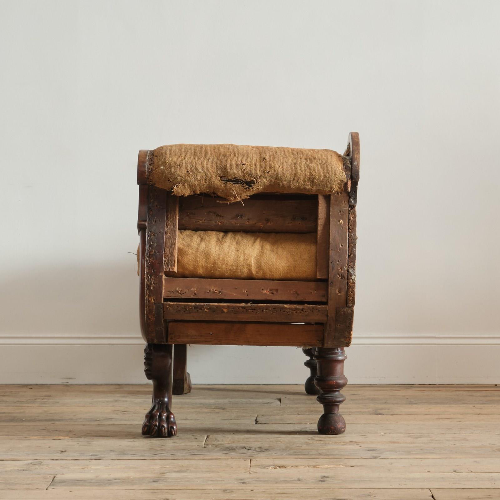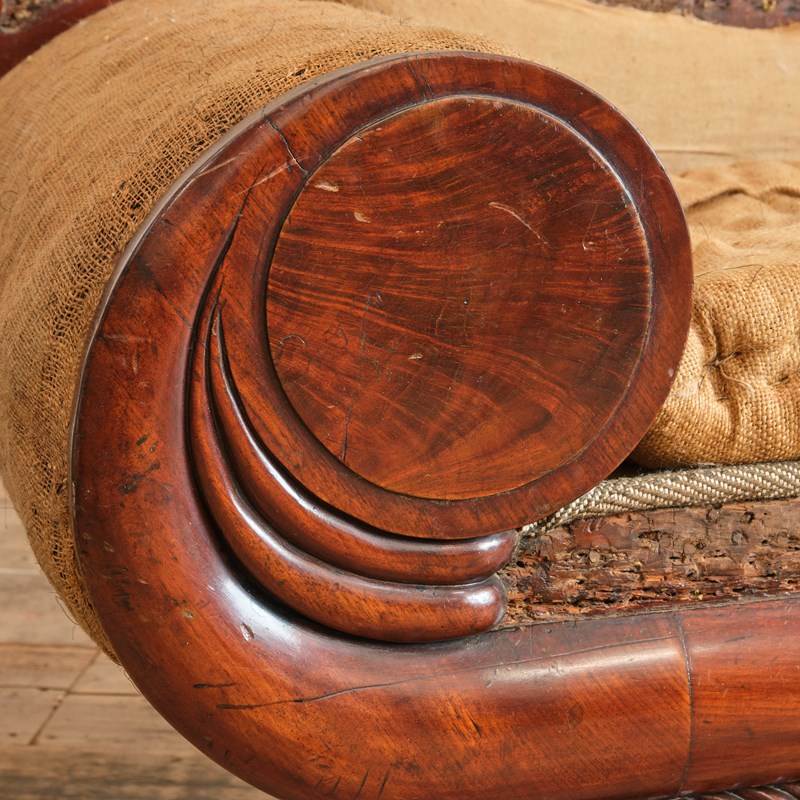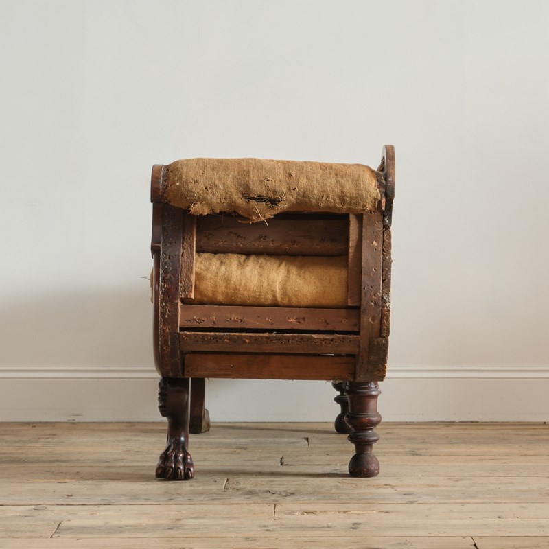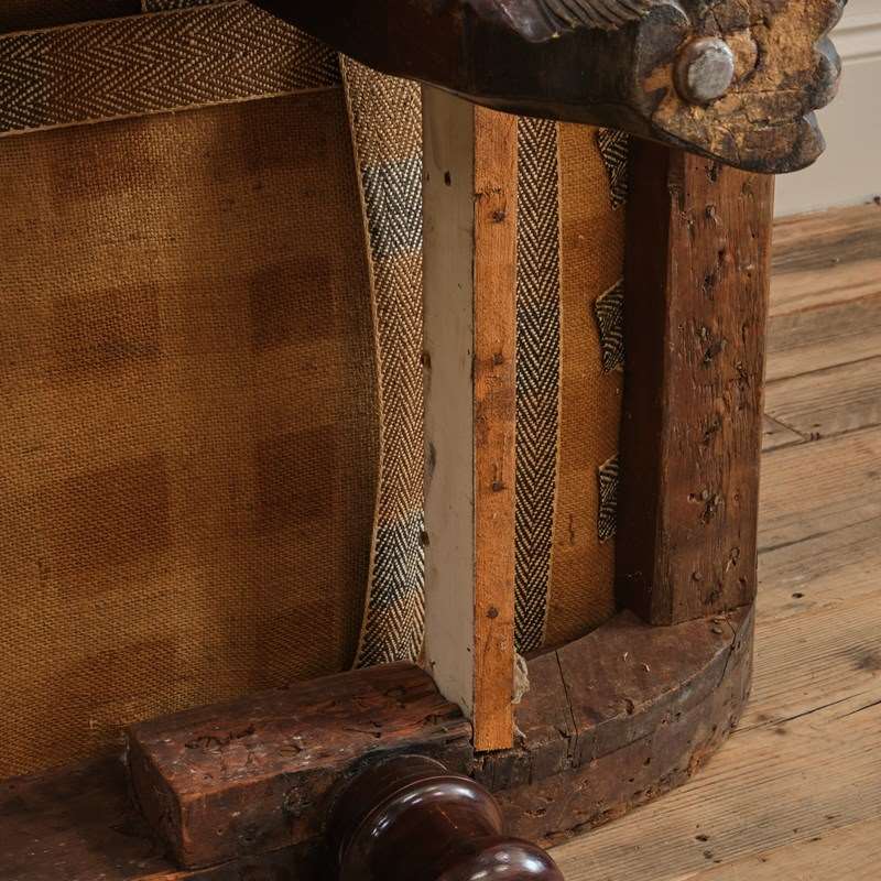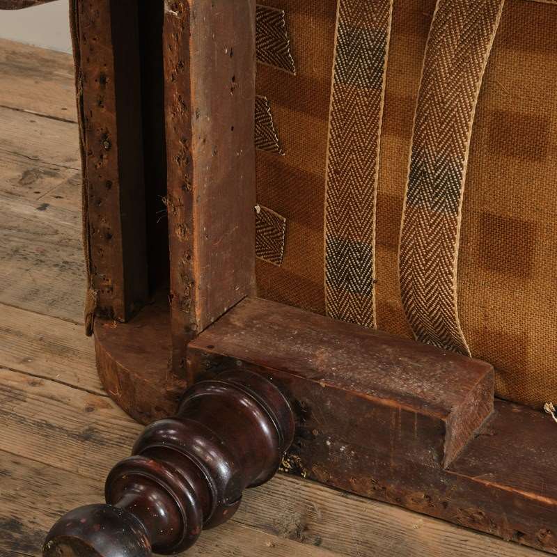 The overall structure of the piece is sound. It does have some historic restorations and 1 stretcher to the base has been replaces, likely when it was last recovered. The seat needs re-webbing. The he seat and bolster cushions are horsehair filled and probably original with newer re-worked hessian covers.