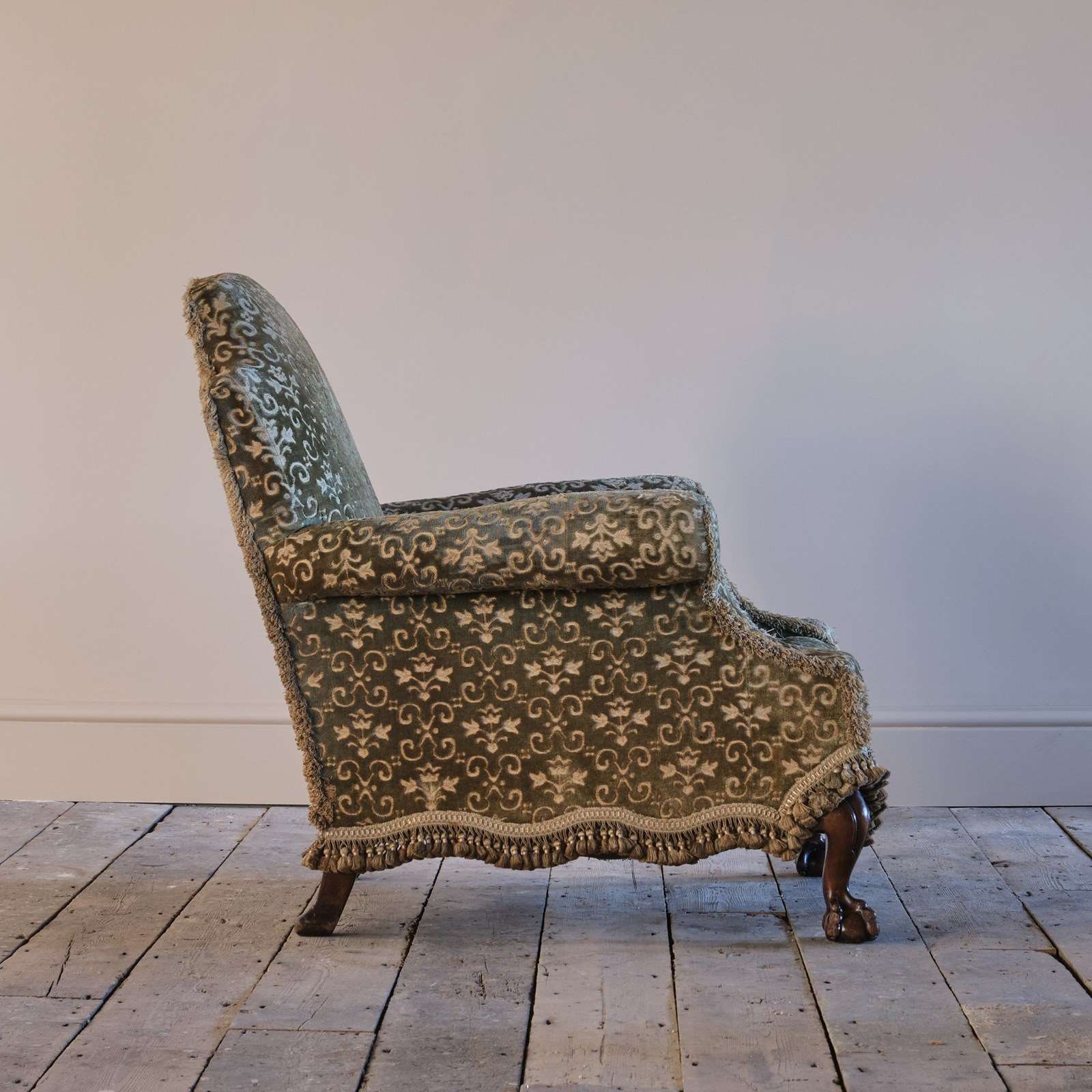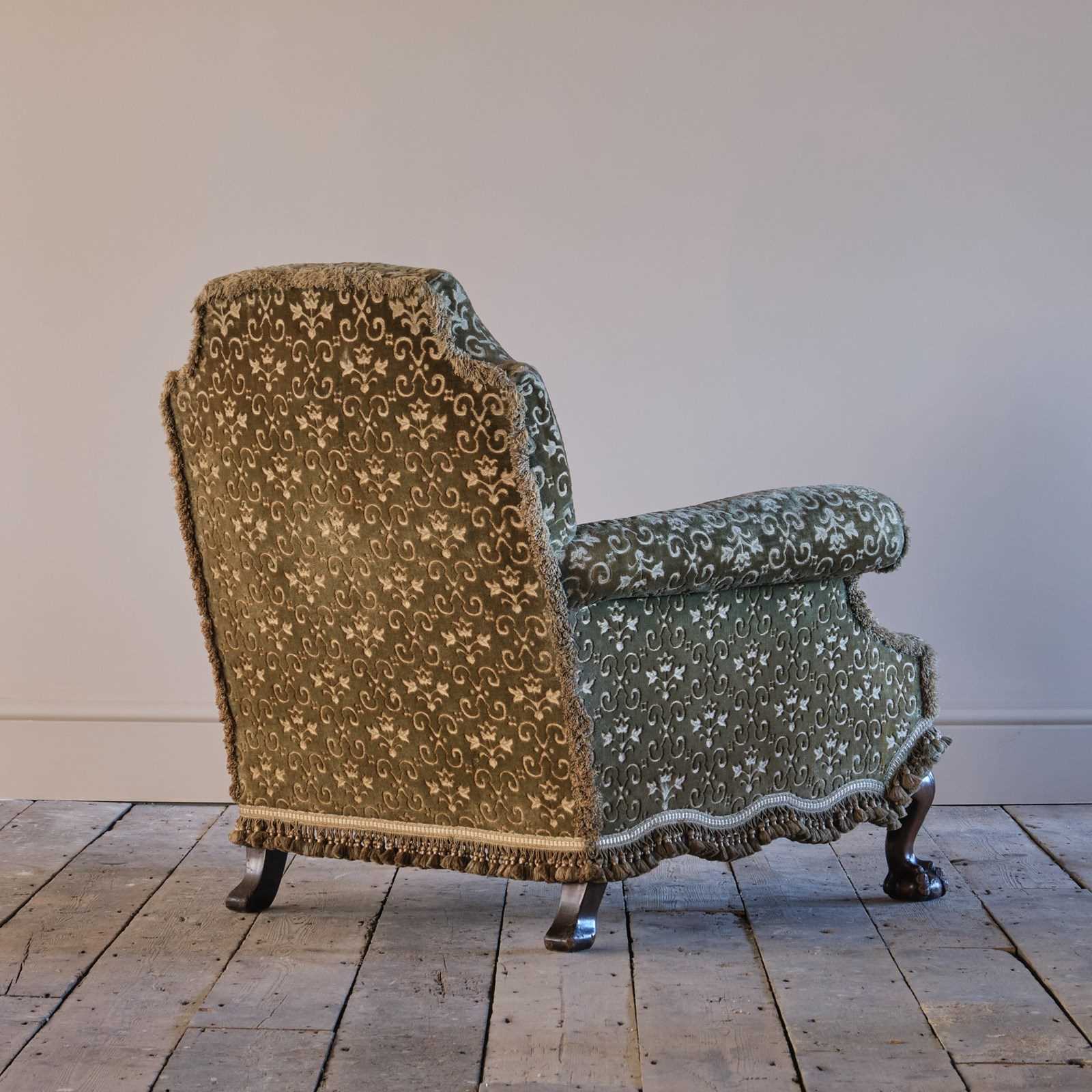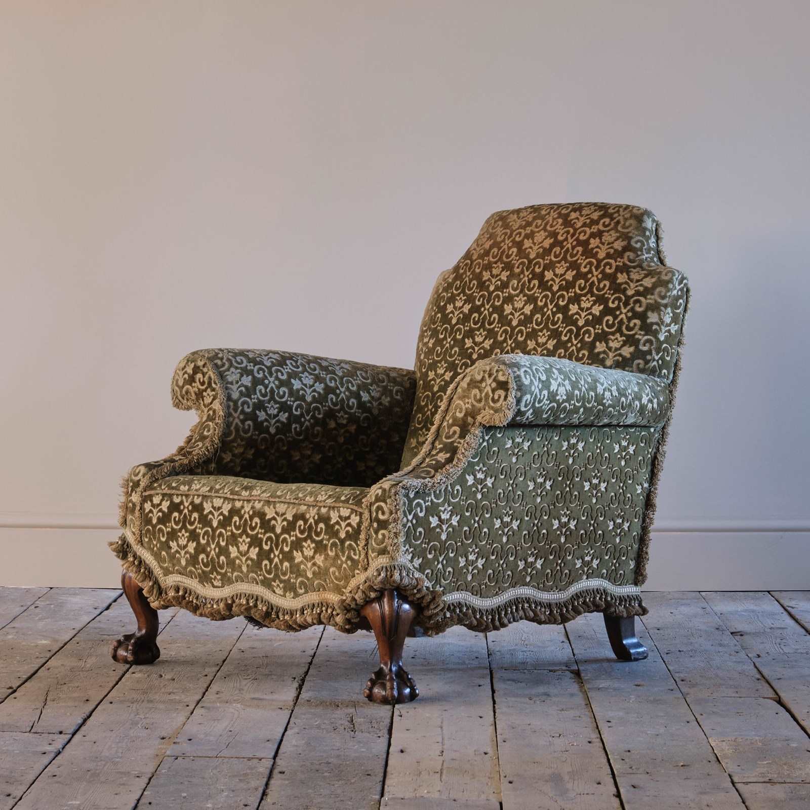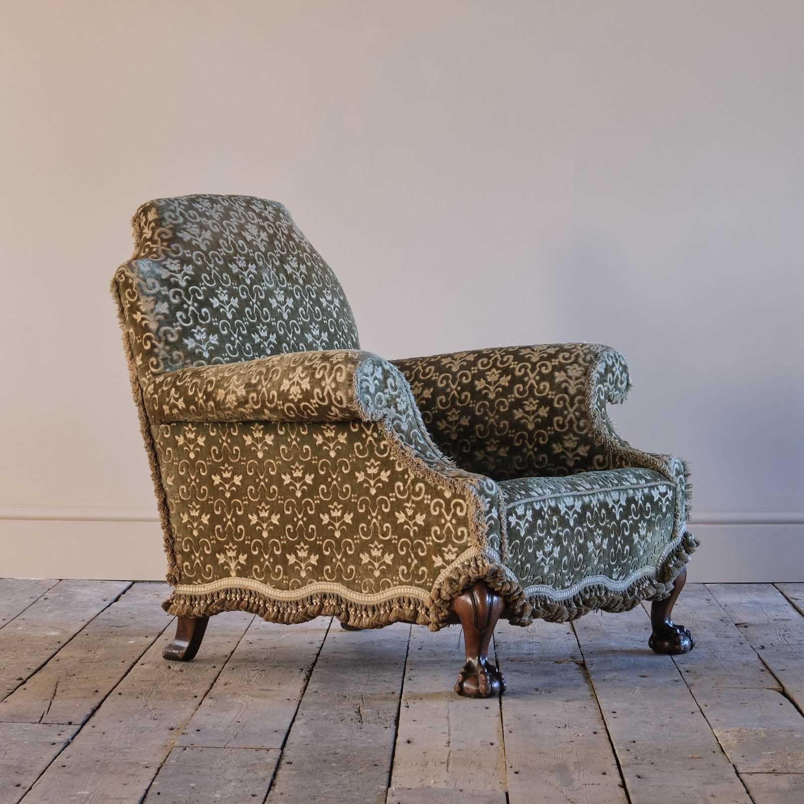 A deep seated country house armchair. Raised on nicely carved ball and claw walnut front legs. English c1900