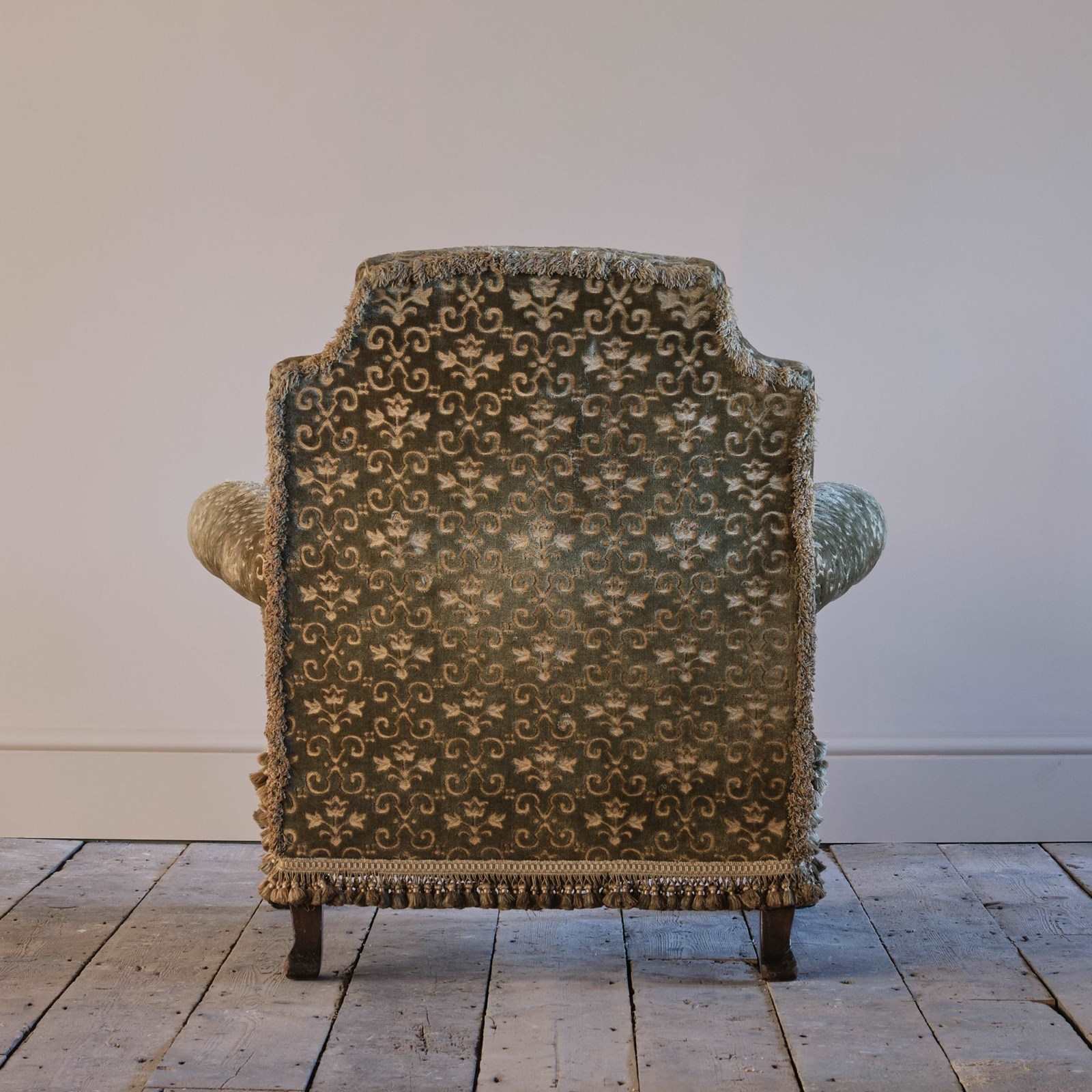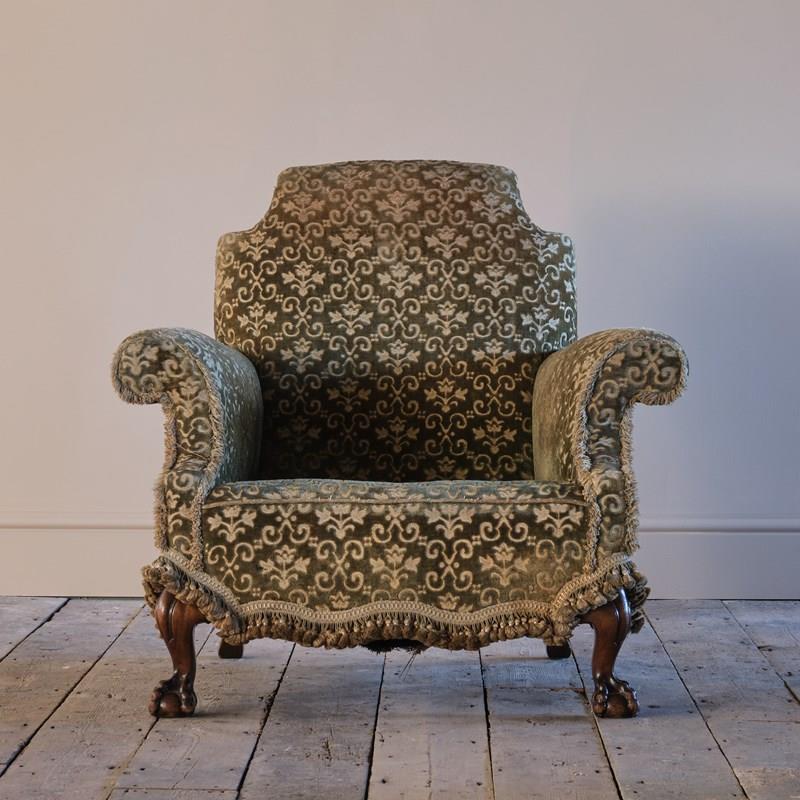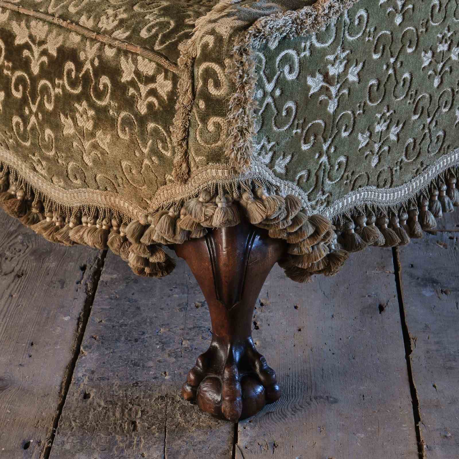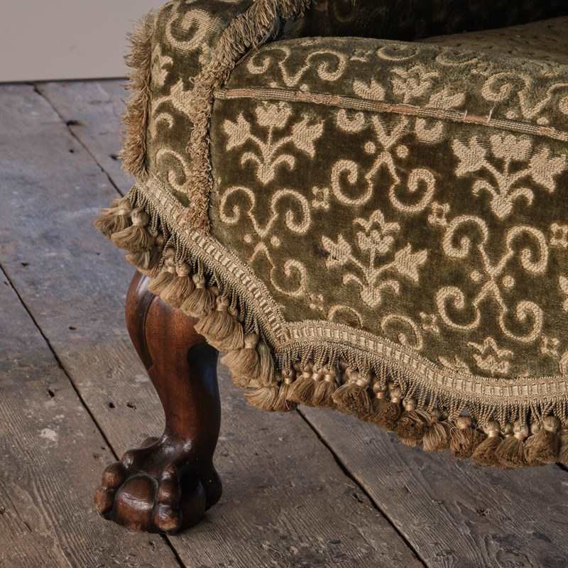A deep seated country house armchair. Raised on nicely carved ball and claw walnut front legs. English c1900