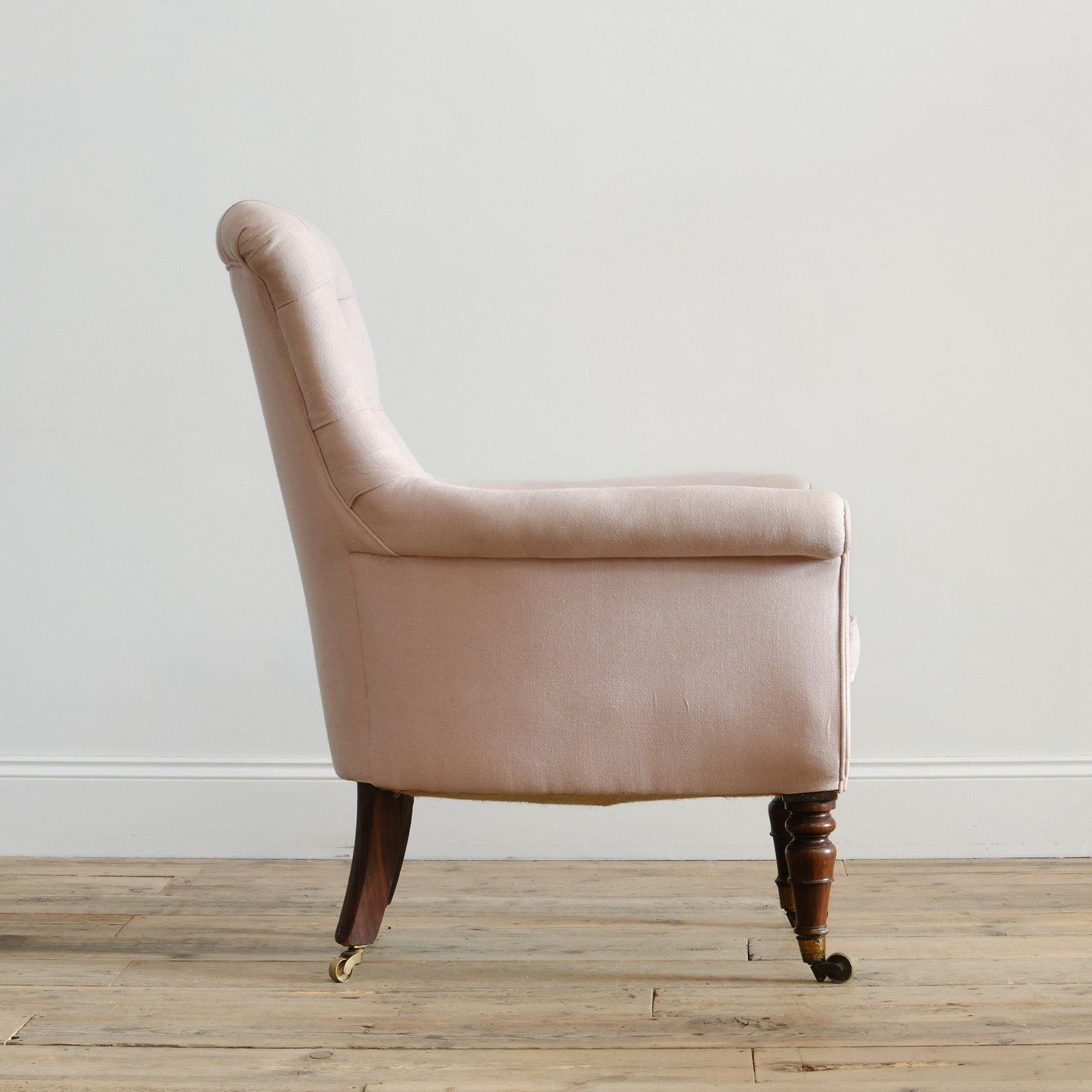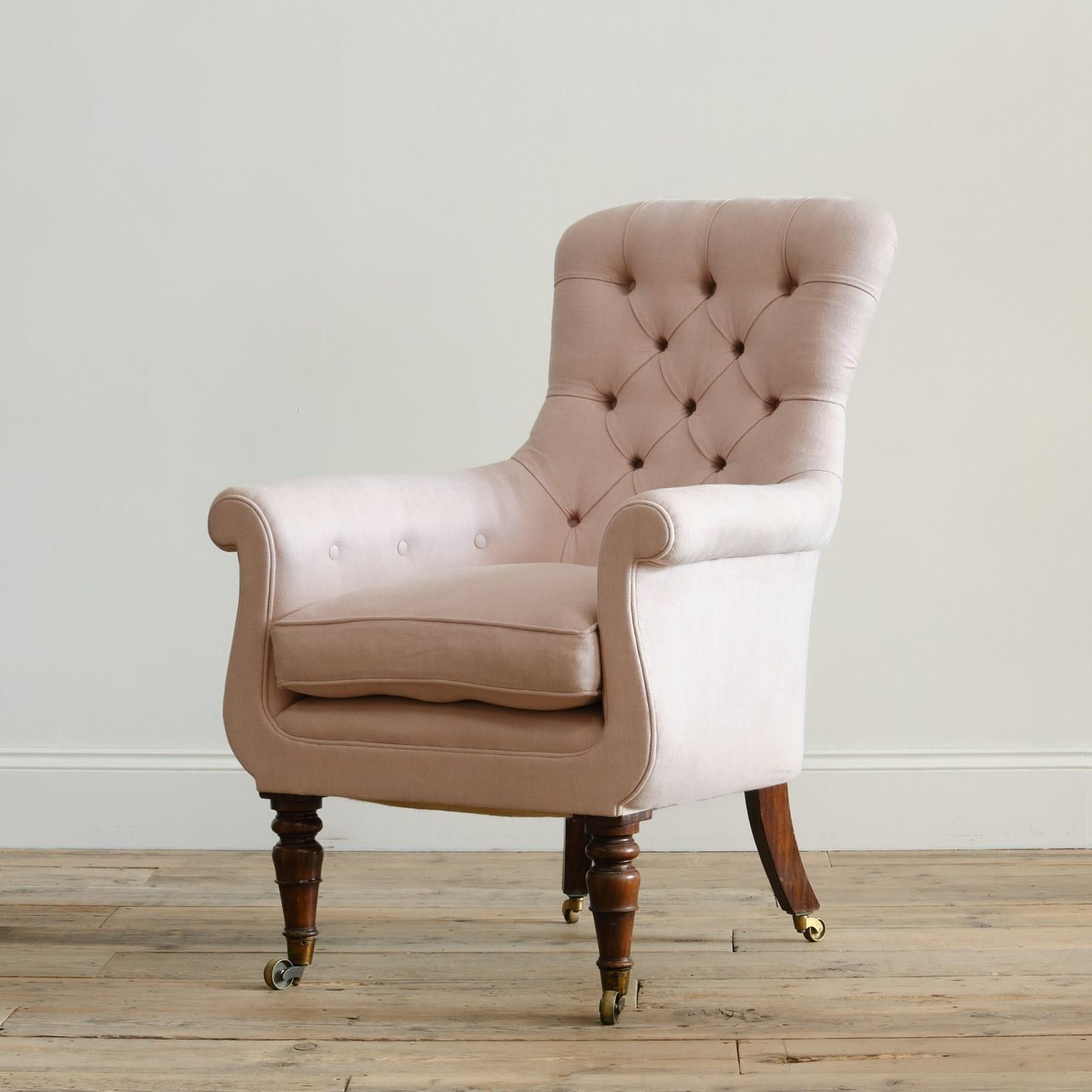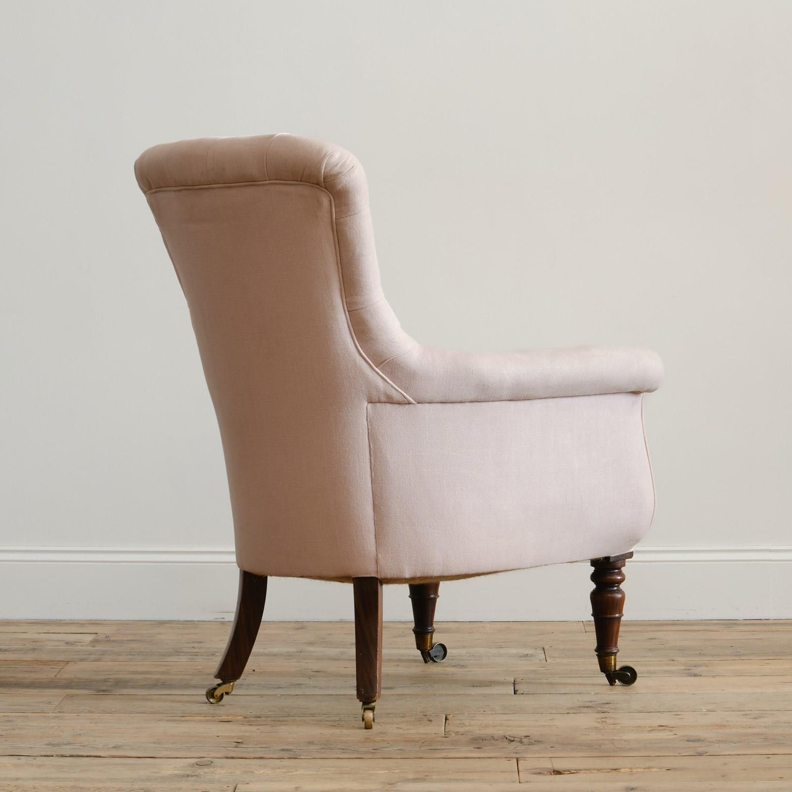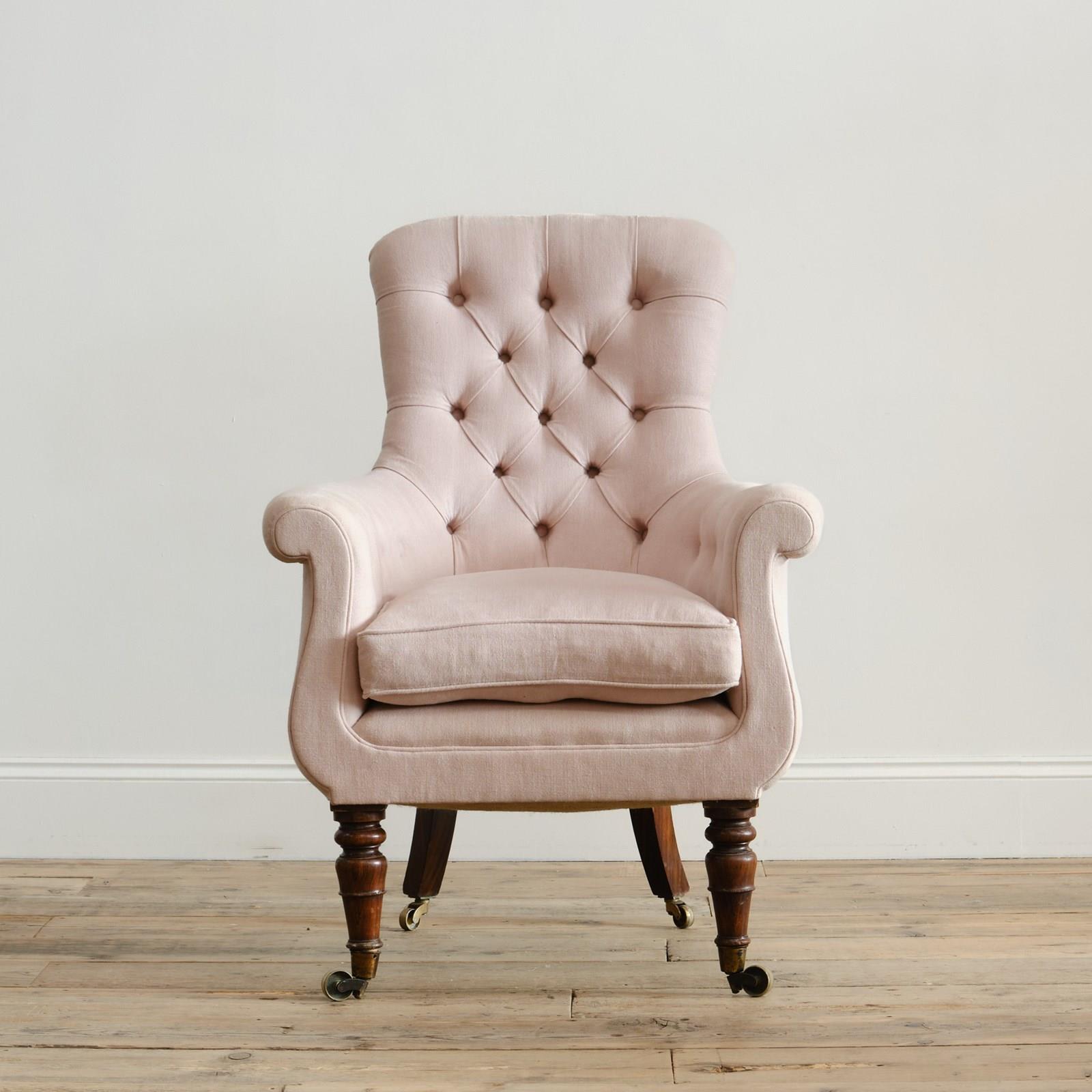A superb English Regency buttoned back armchair. Raised on simulated Rosewood legs with the original brass casters. Currently upholstered to a good standard in pale pink heavy wight linen which is presentable and very much usable with the odd light mark here and there.