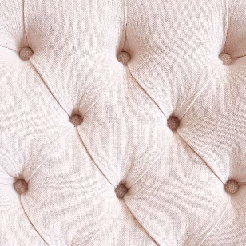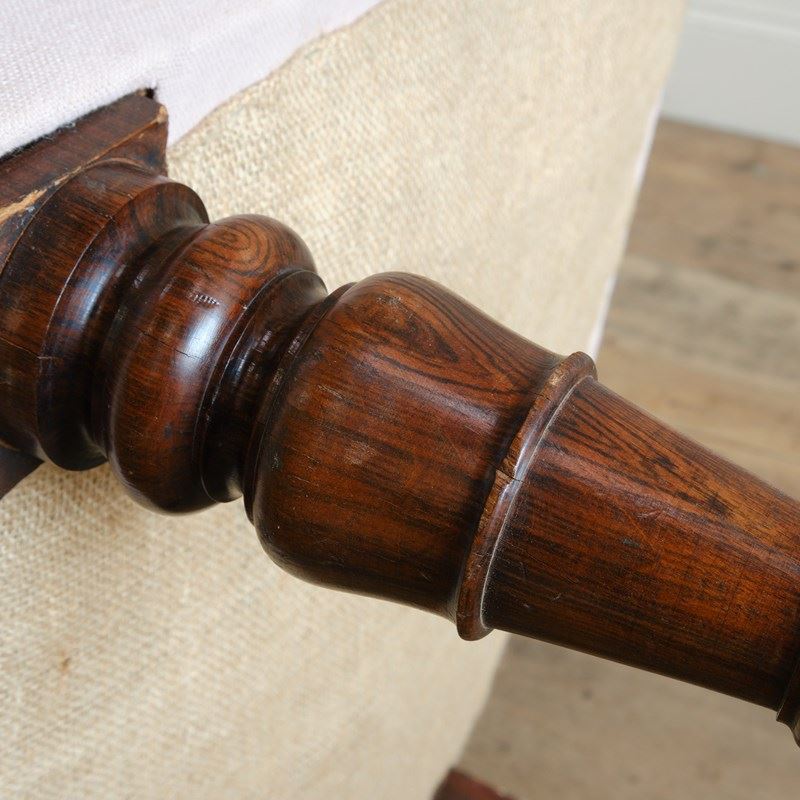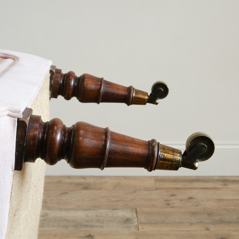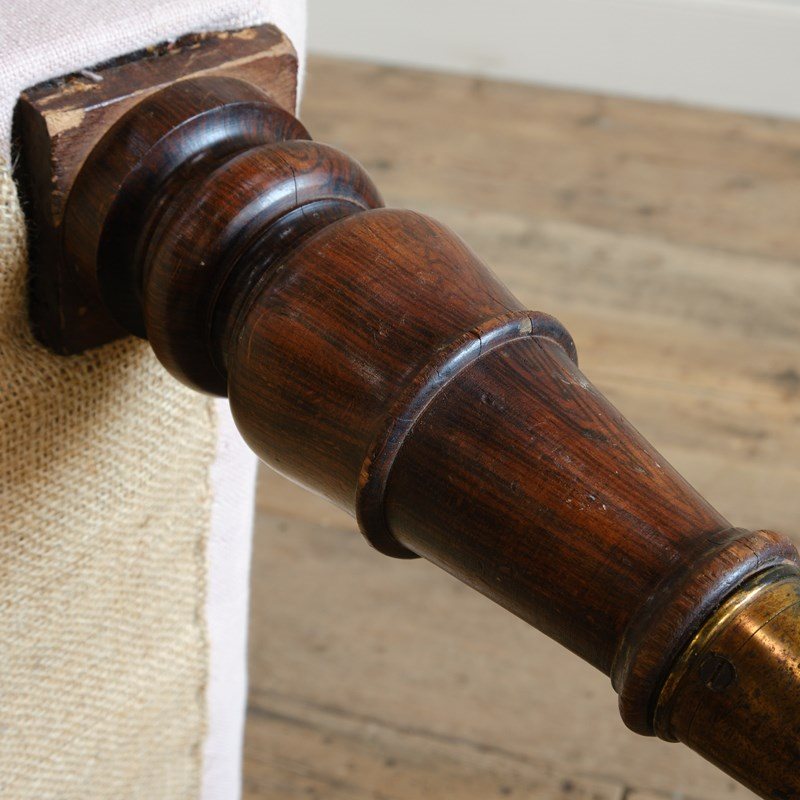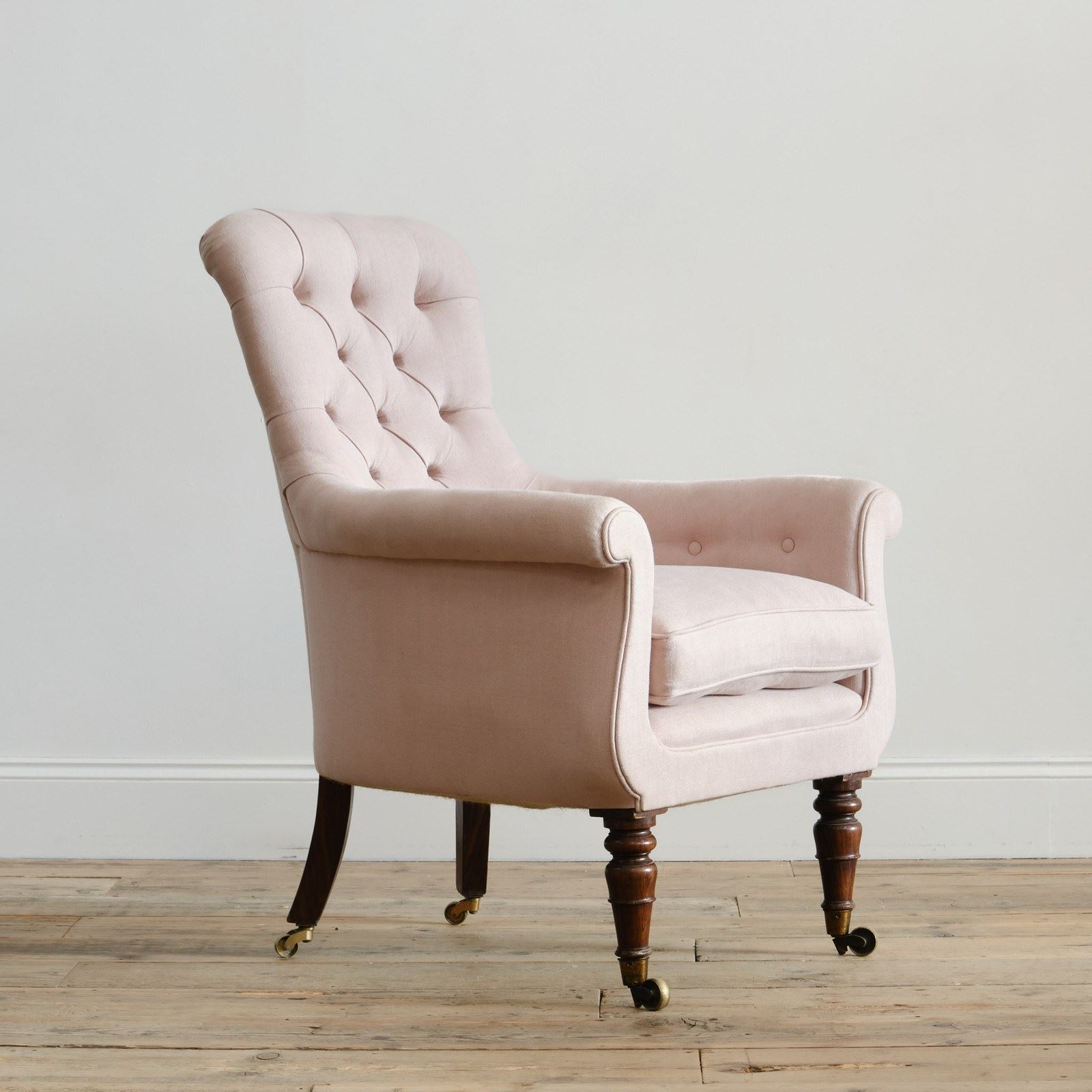 A superb English Regency buttoned back armchair. Raised on simulated Rosewood legs with the original brass casters. Currently upholstered to a good standard in pale pink heavy wight linen which is presentable and very much usable with the odd light mark here and there.