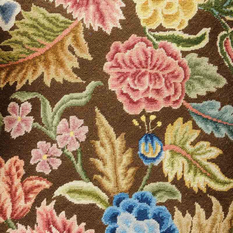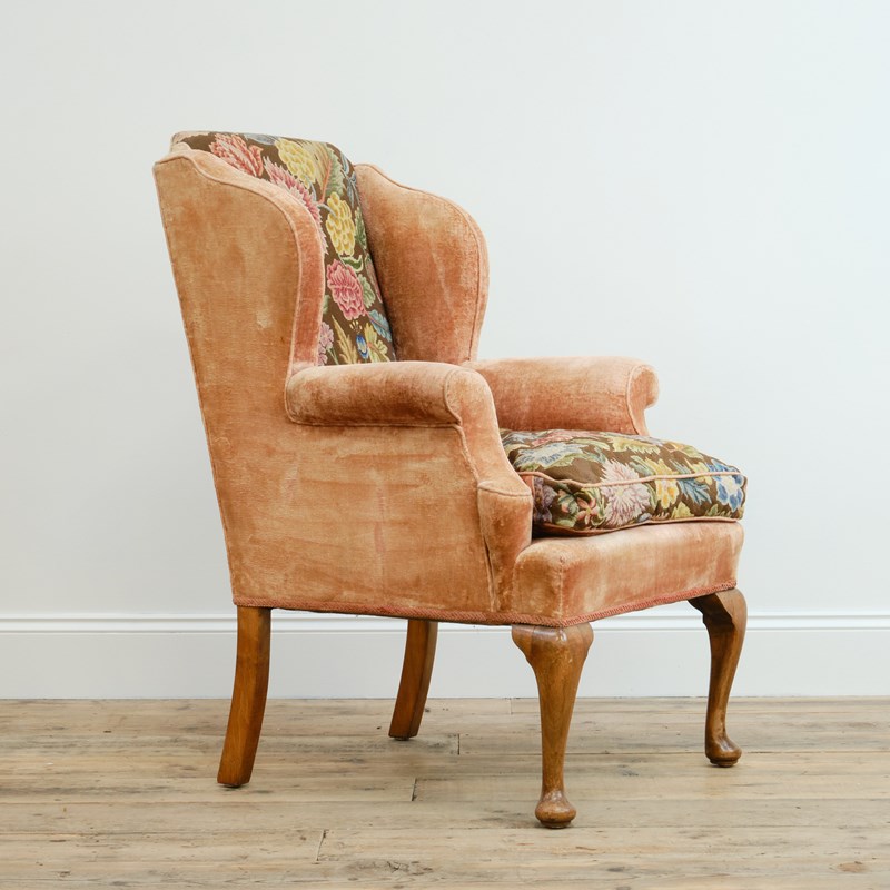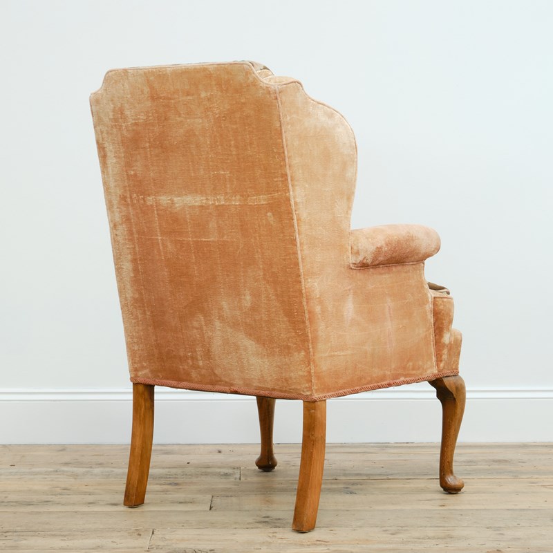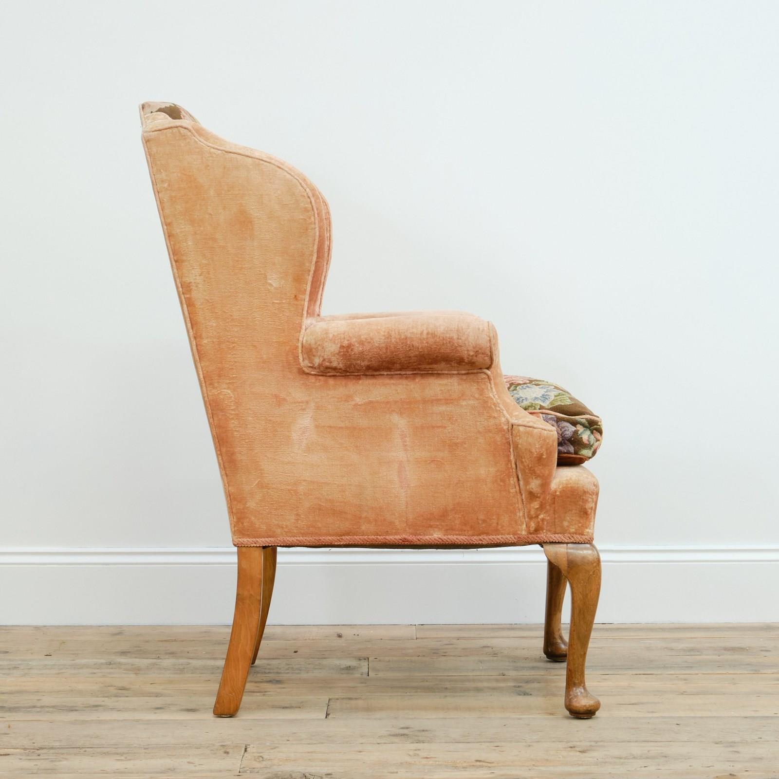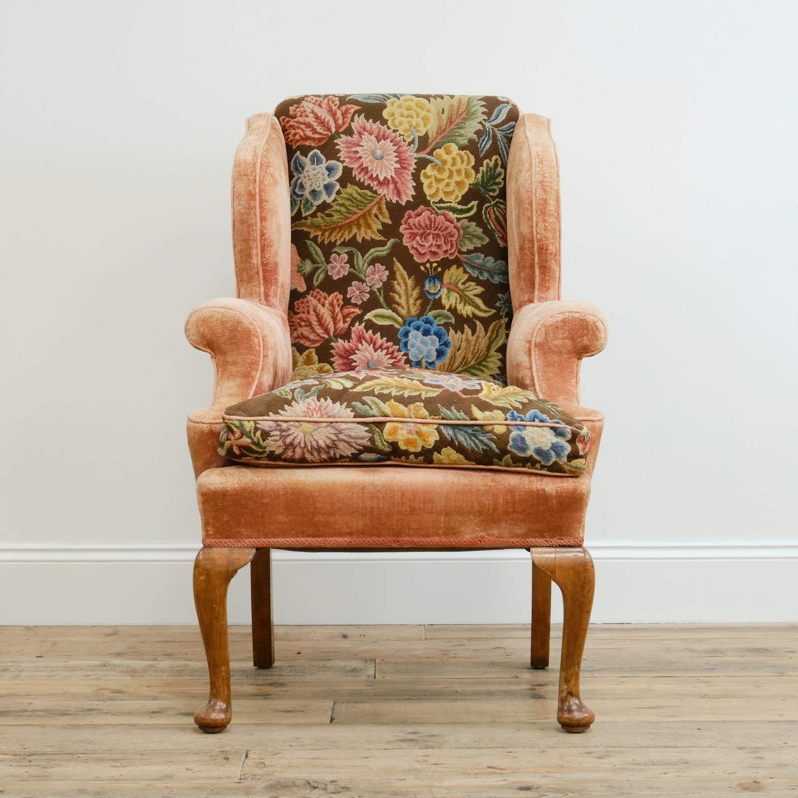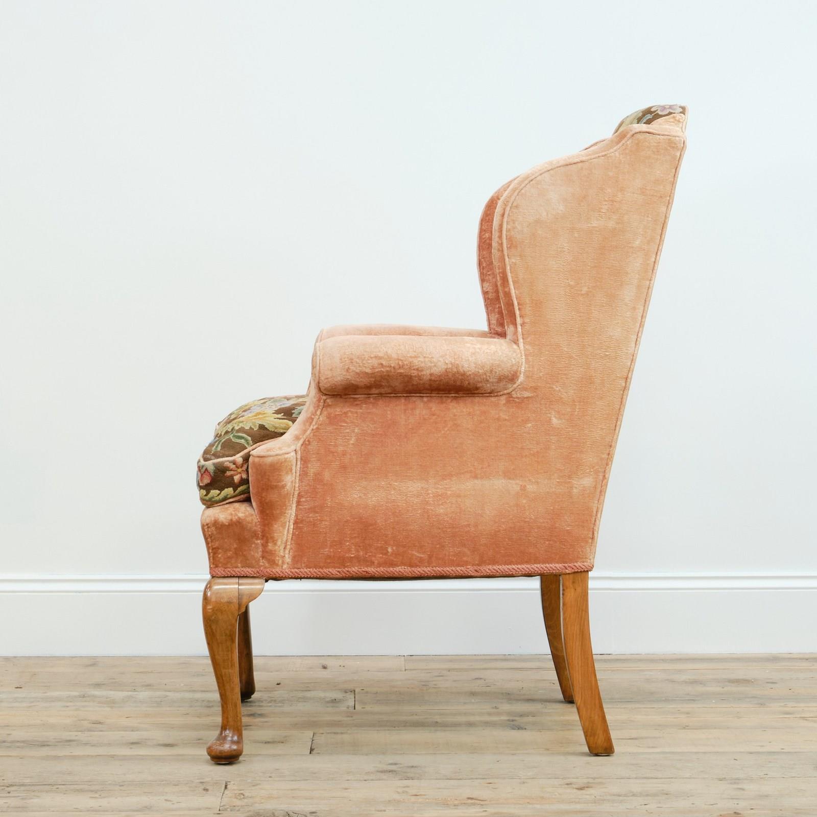 An attractive early 20th century wingback armchair in its original threadbare velvet and needlework back and seat cushion. Raised on tall beech legs and structurally in good order.
