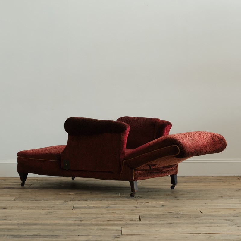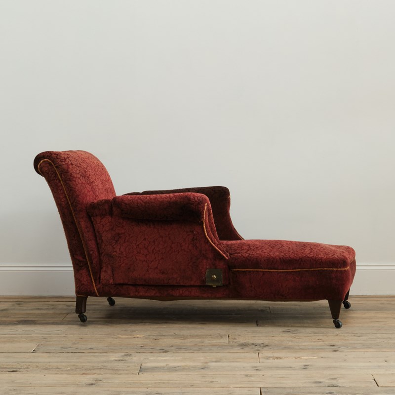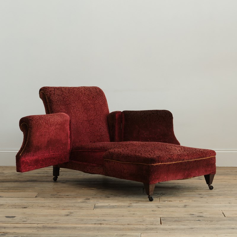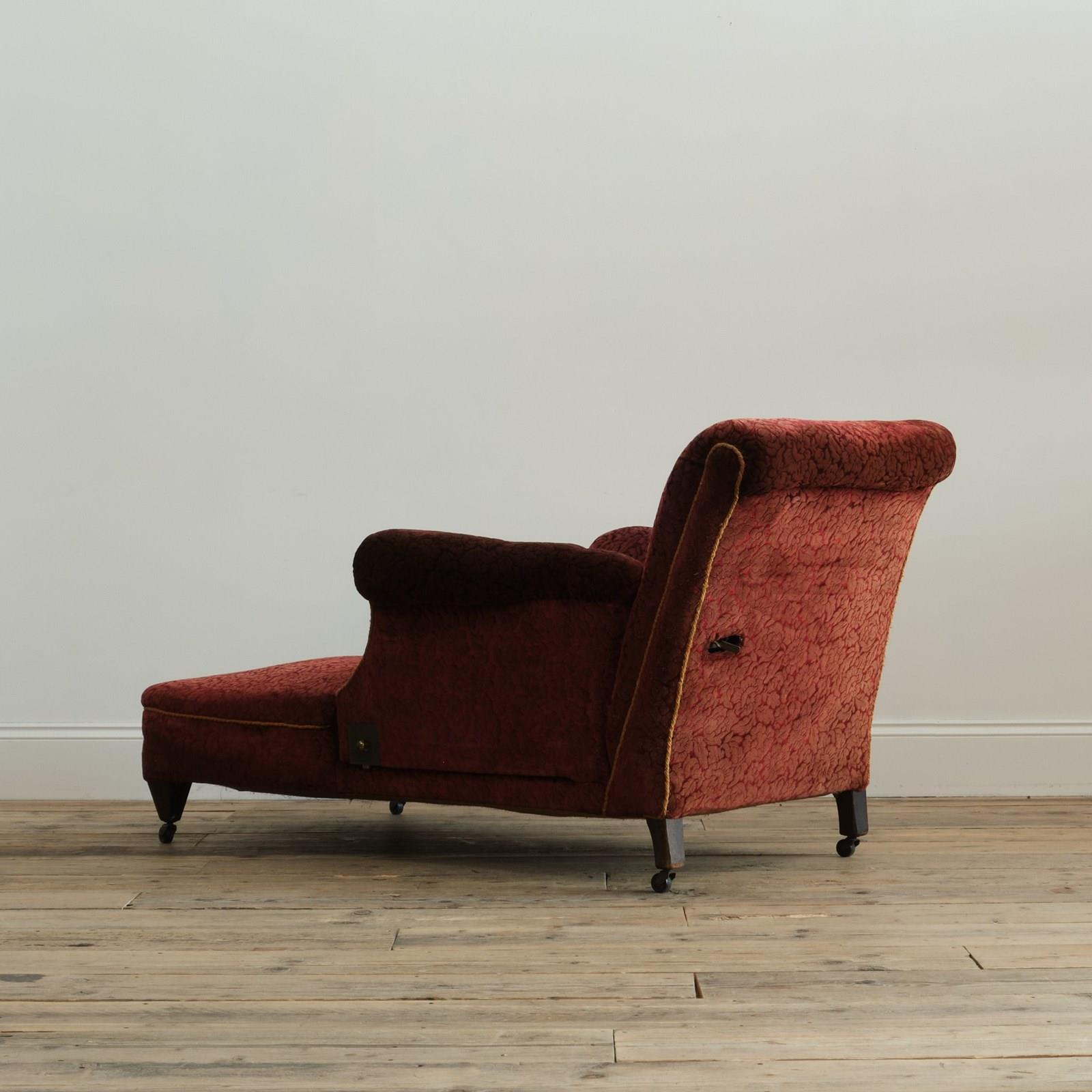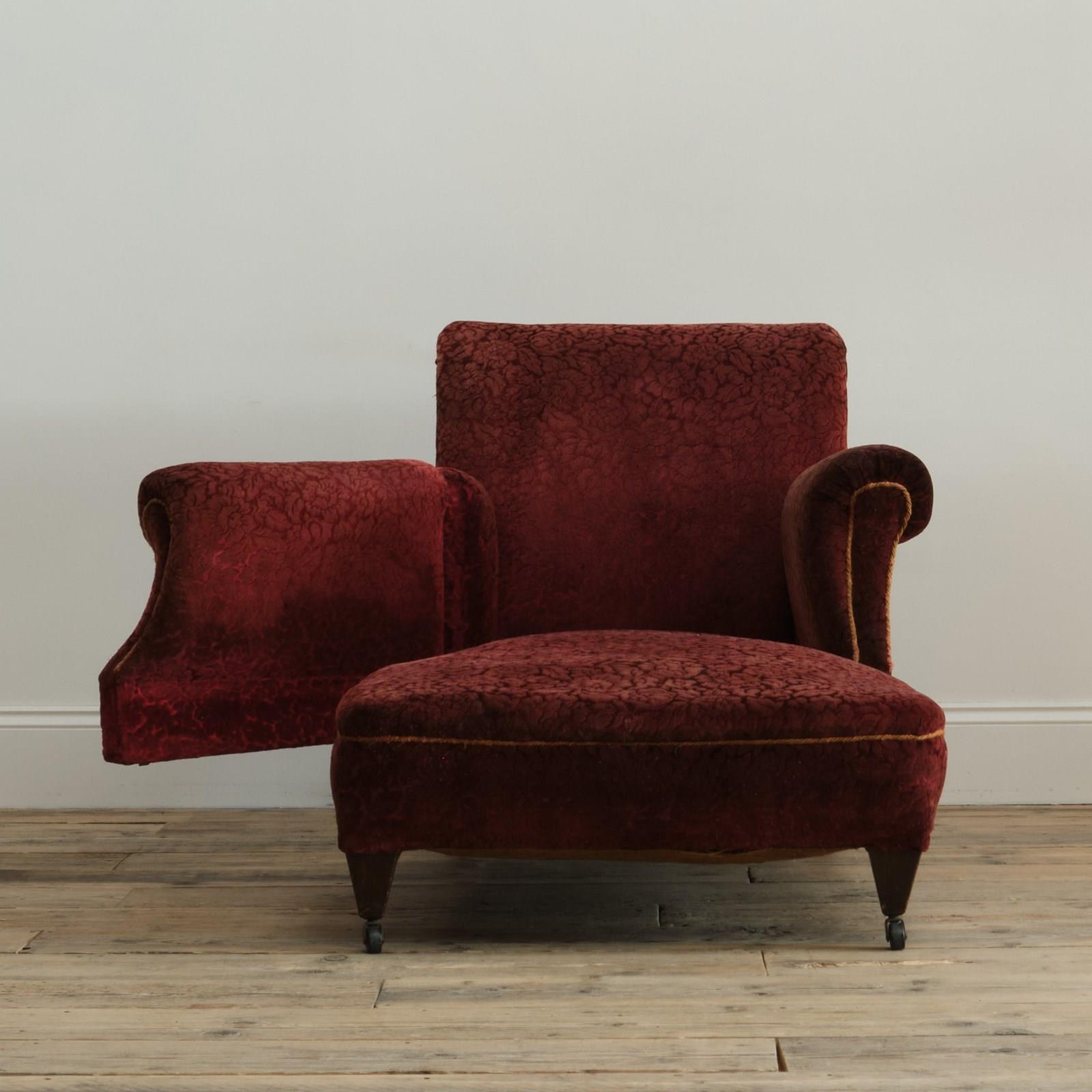 An antique country house daybed of unusual form. The back reclines and both arms open outwards for ease of getting into and out of. Raised on square tapered legs. English c1900