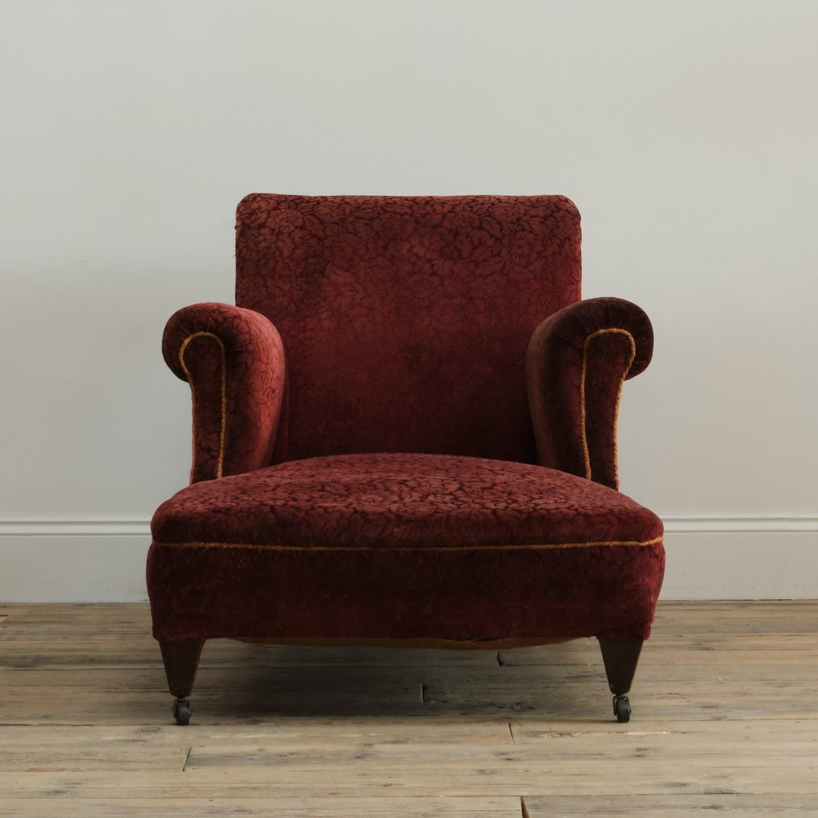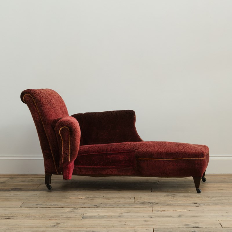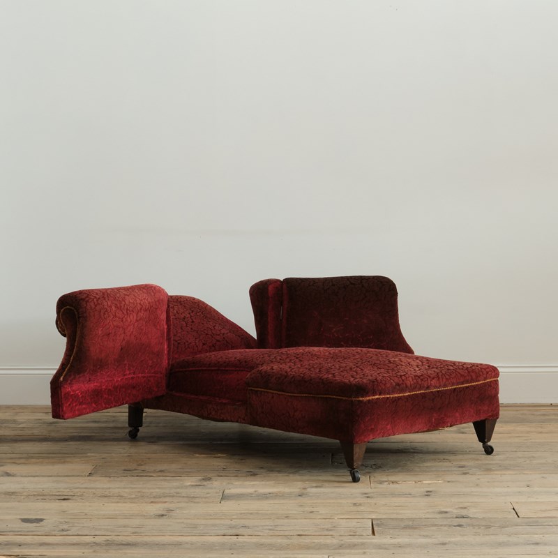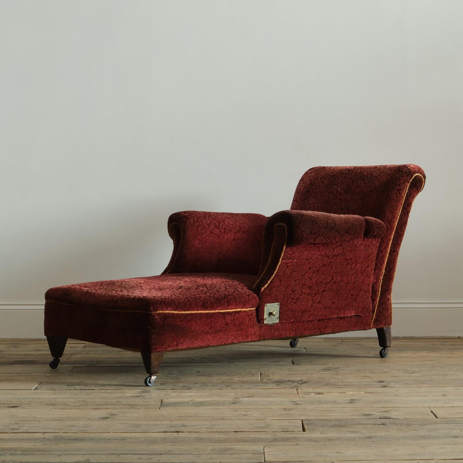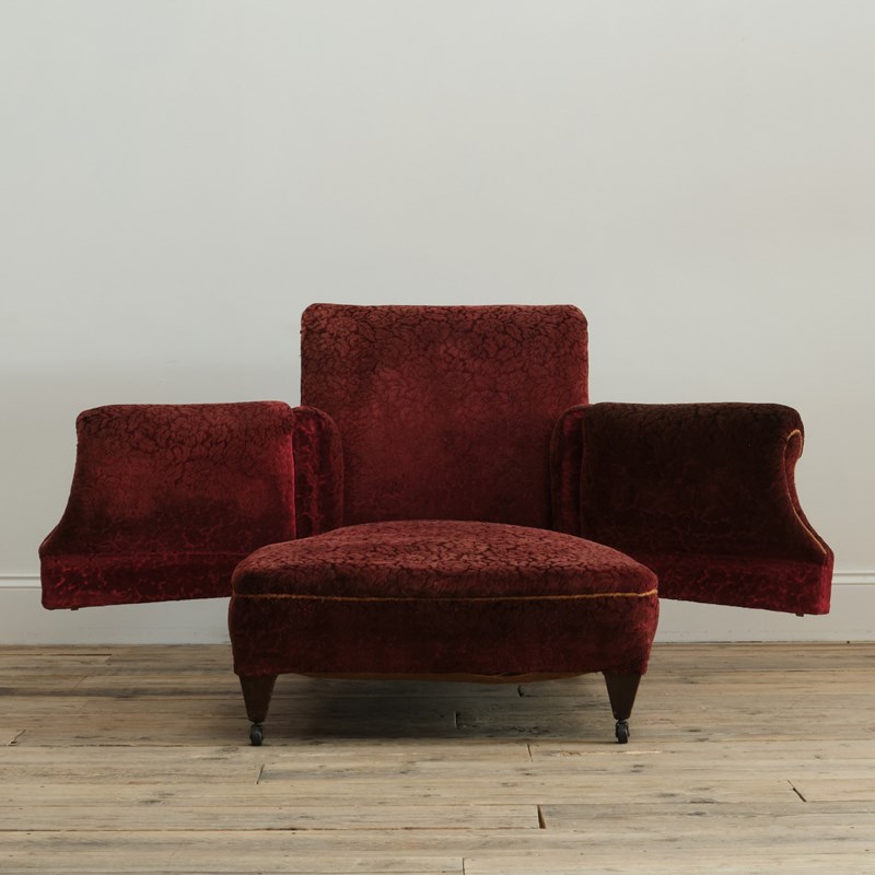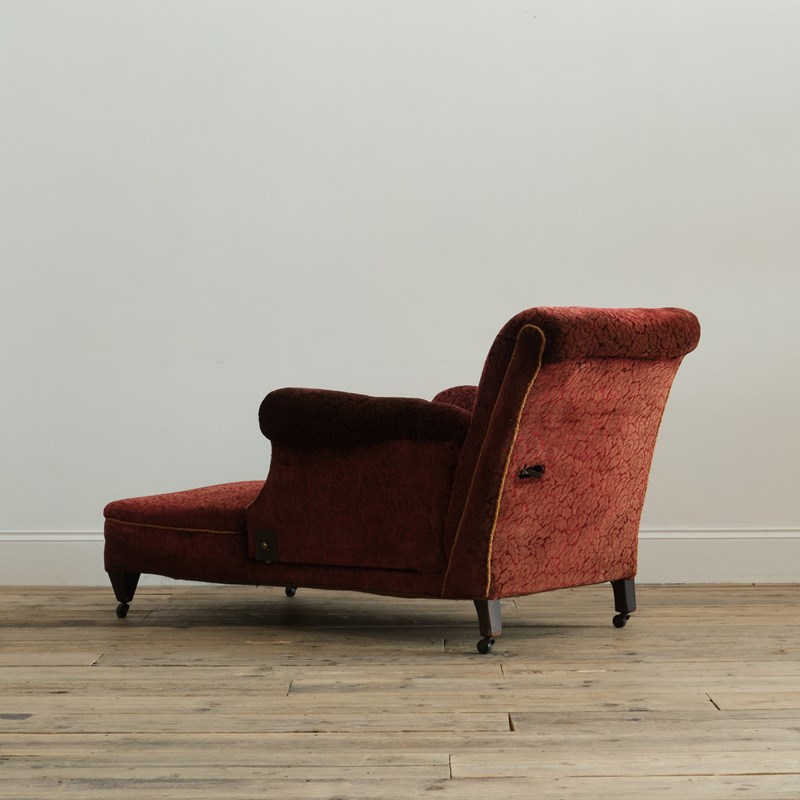 An antique country house daybed of unusual form. The back reclines and both arms open outwards for ease of getting into and out of. Raised on square tapered legs. English c1900