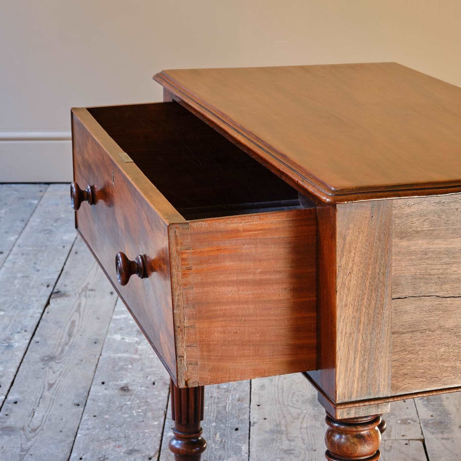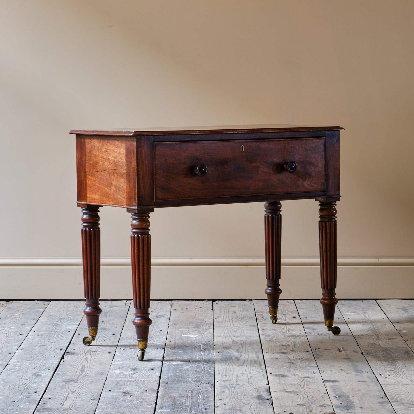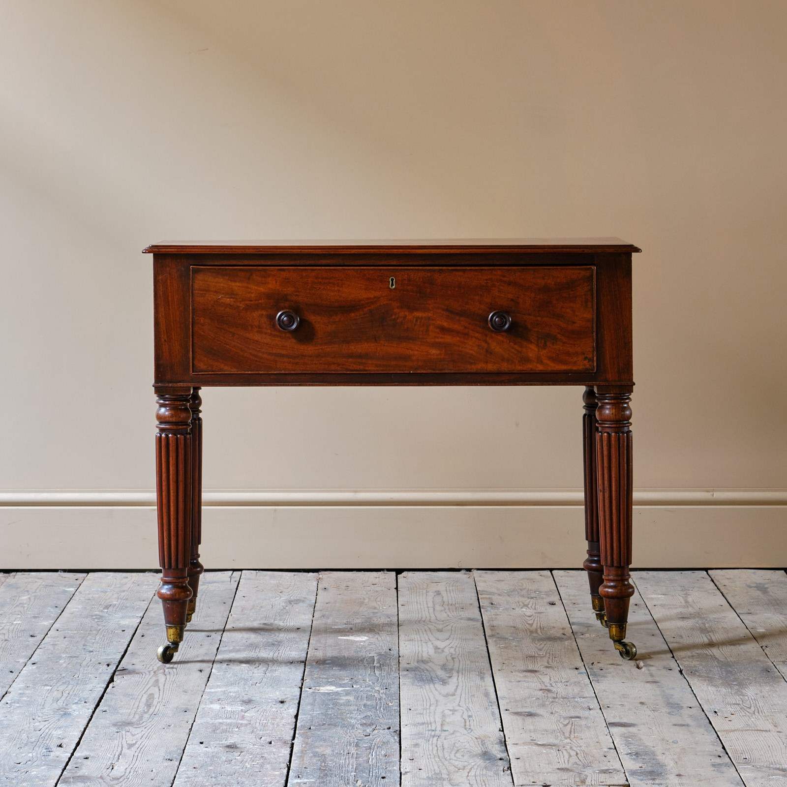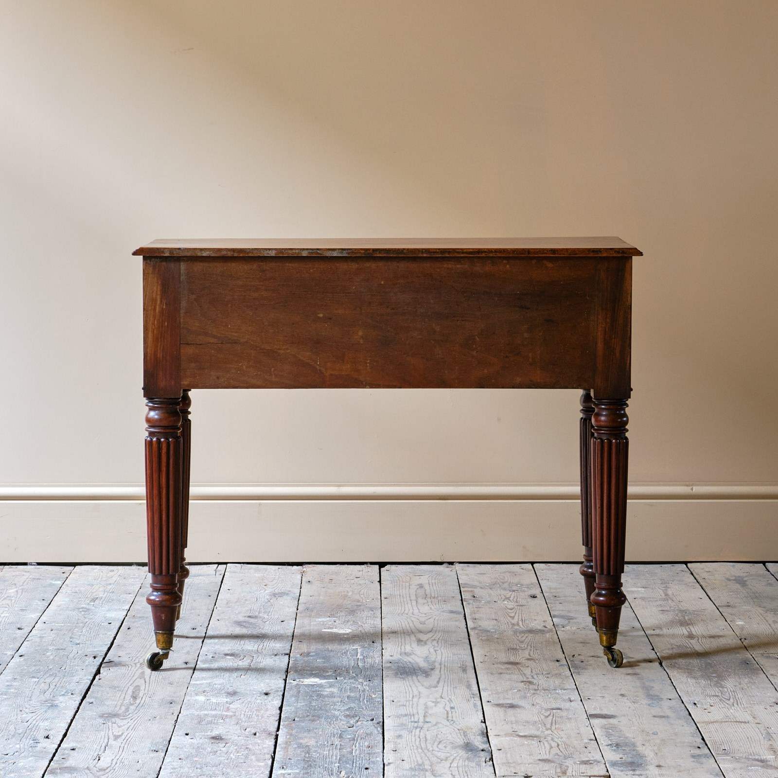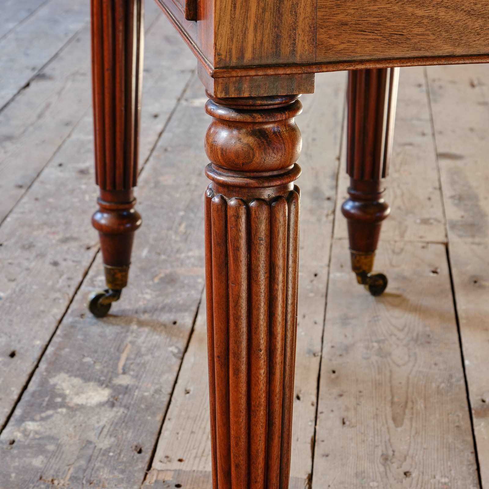 Stands on 4 elegant turned and reeded legs that culminate in brass castors.