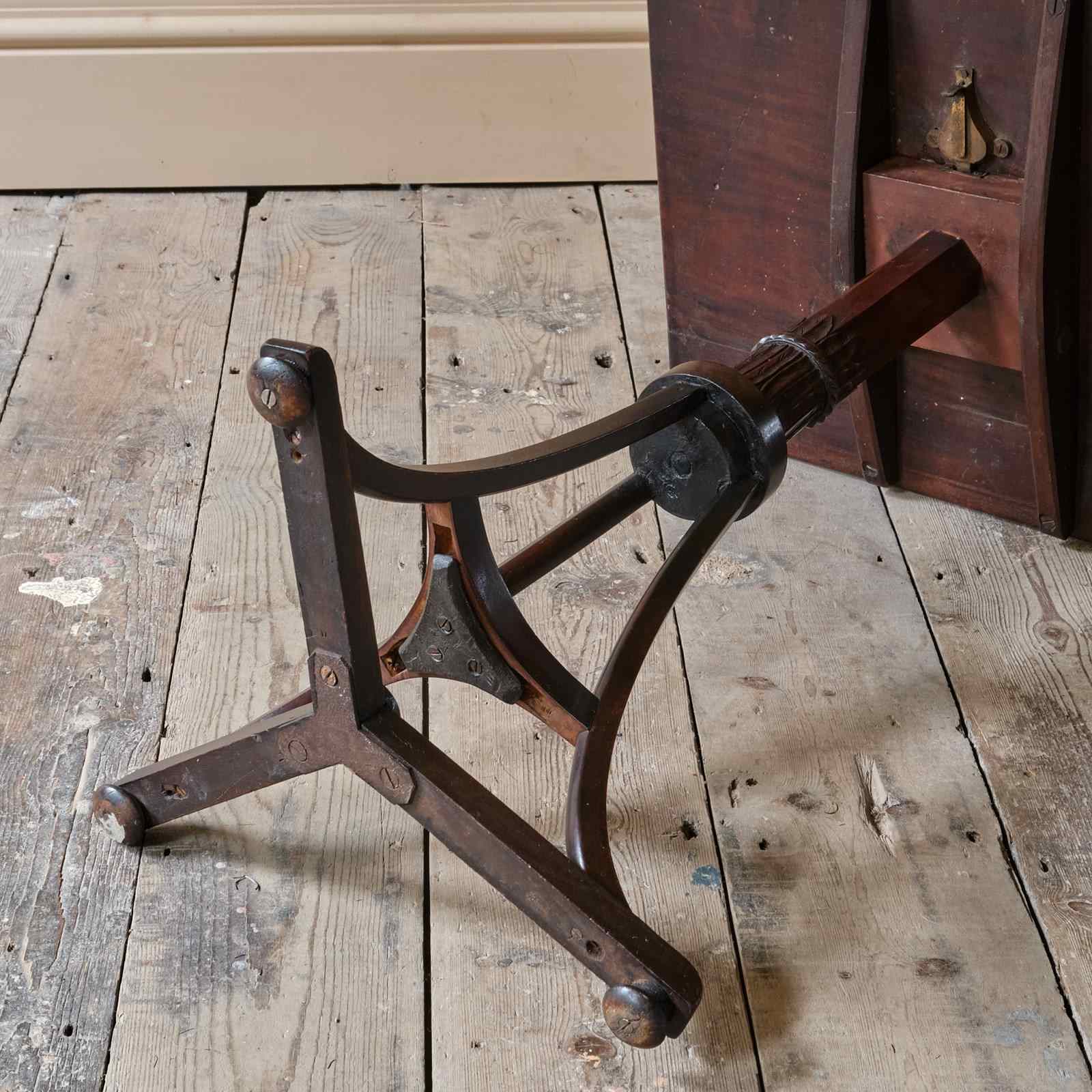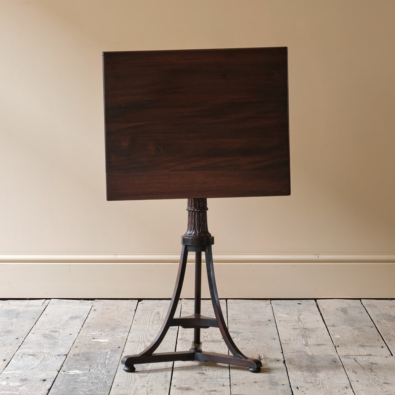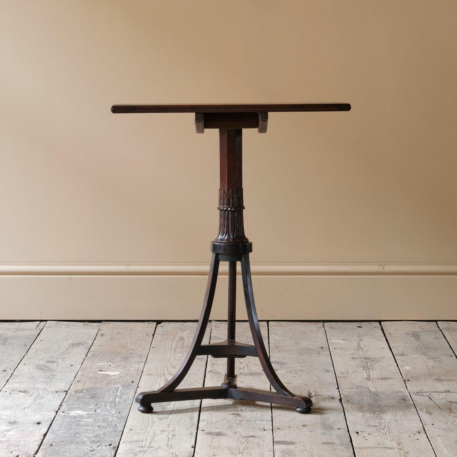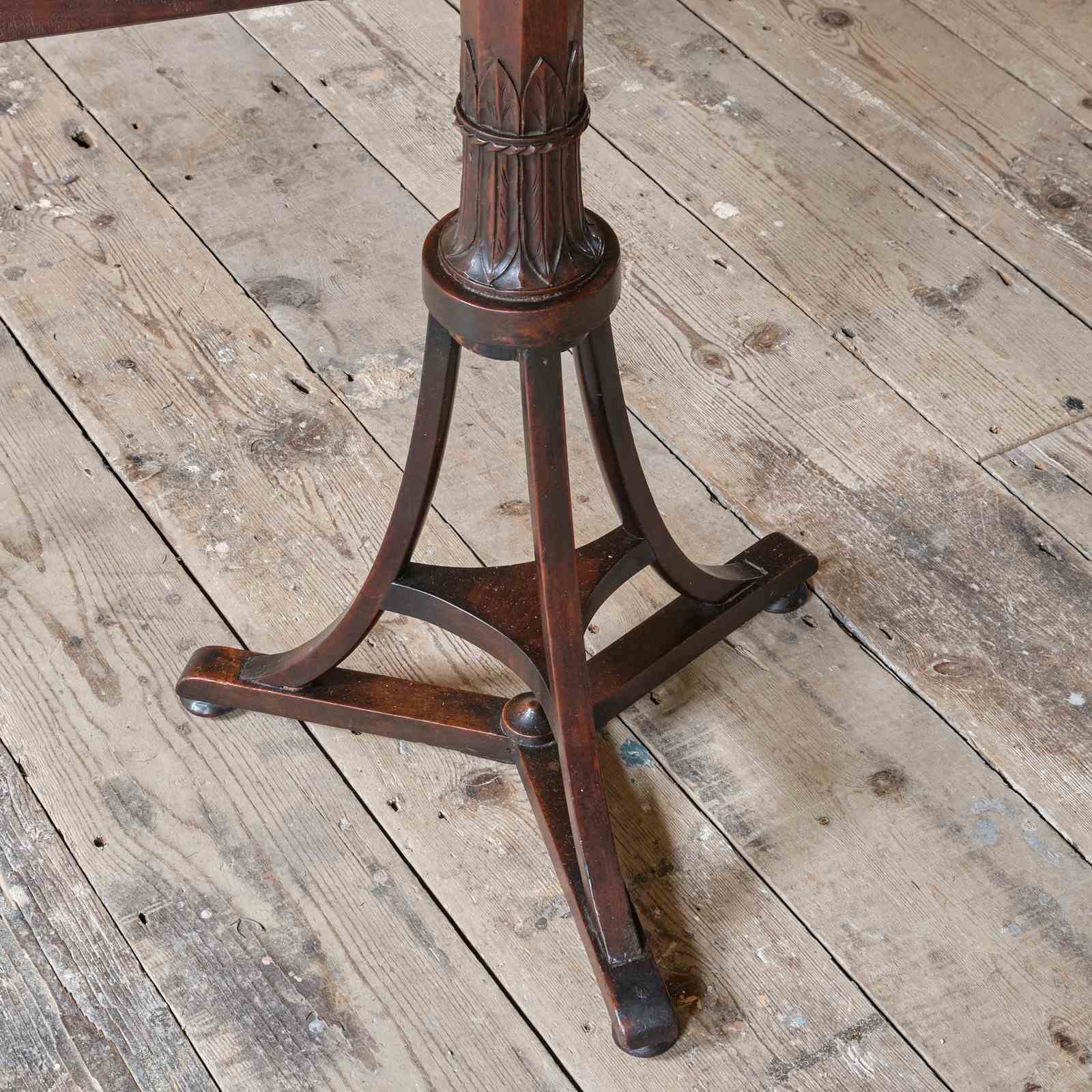 An Early 19th century tilt top table. The wonderfully carved and chamfered stem on a tripod base. The top seems to be a later addition with the base possibly having been converted into a table base.