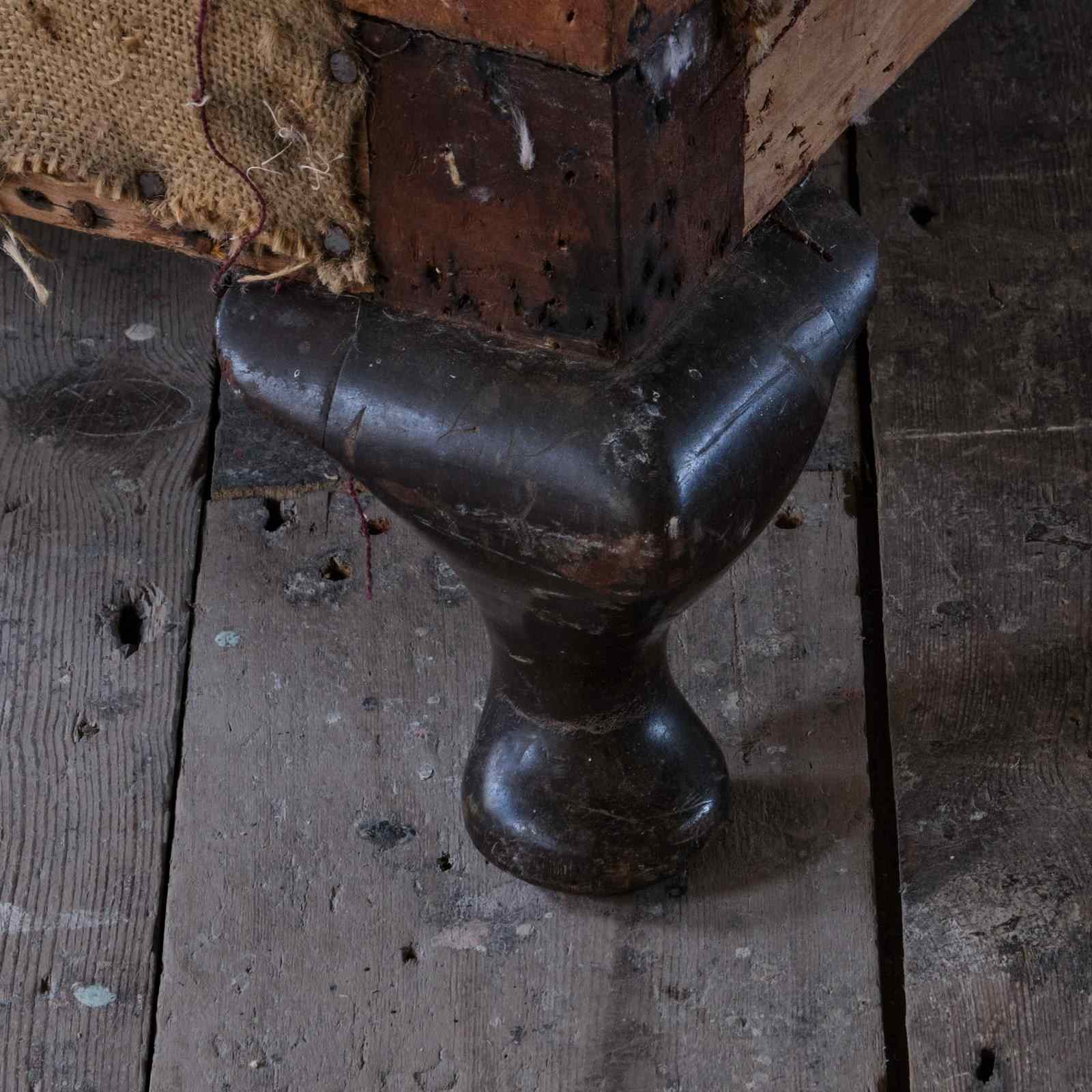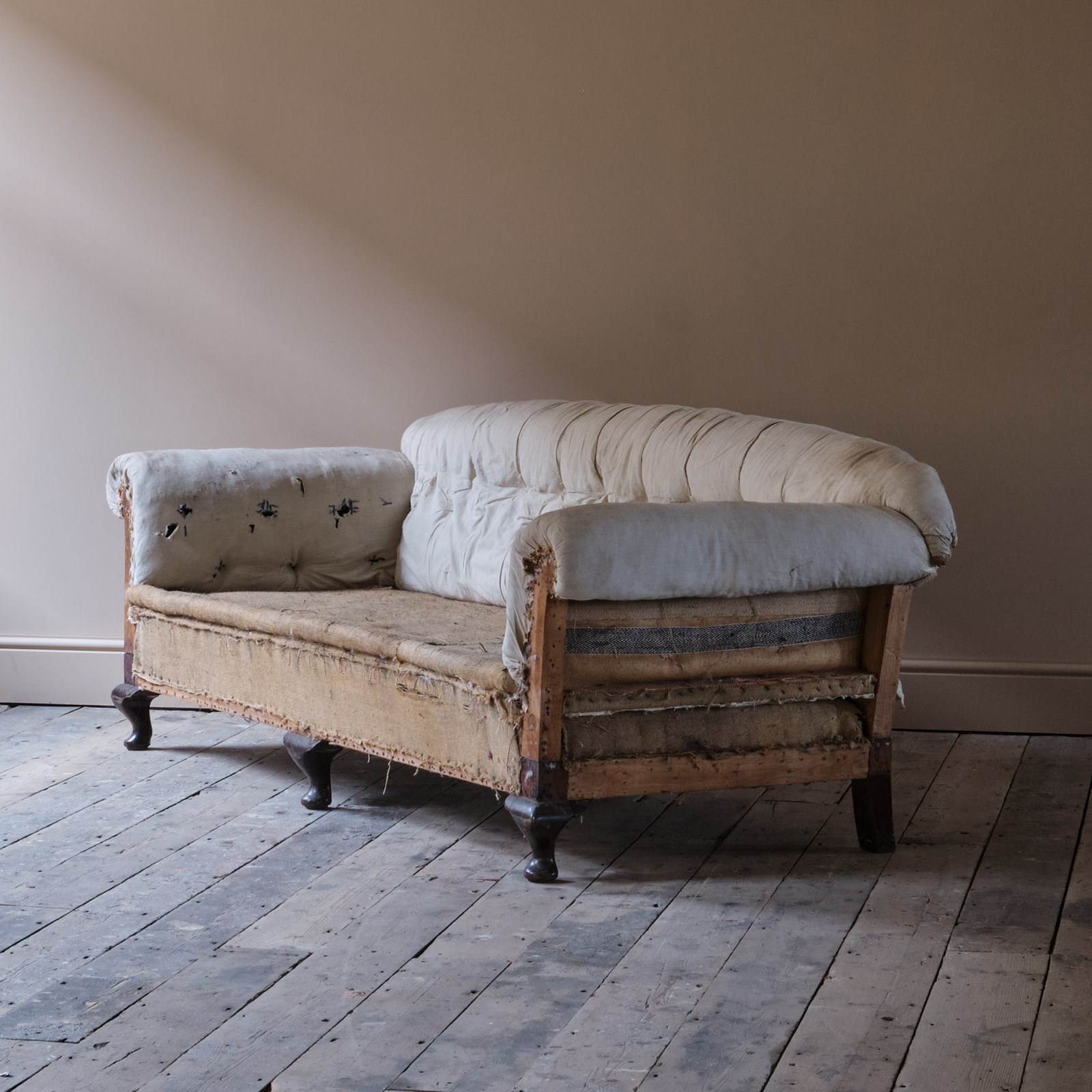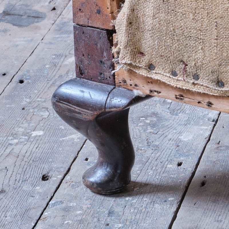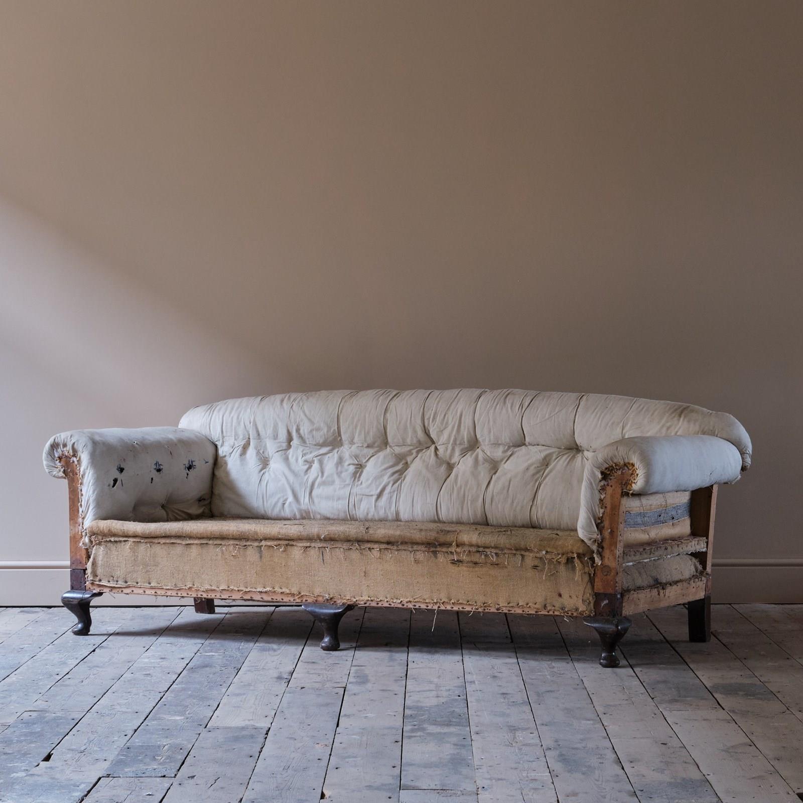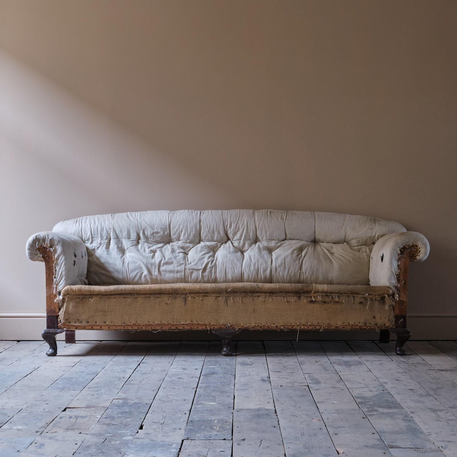 An early 20th century country house sofa. Raised on 3 front cabriole legs. The sofa retains its original horse hair buttoned fillings to the arms back and seat.