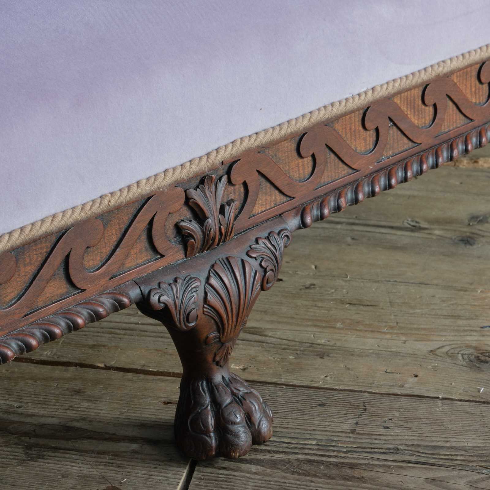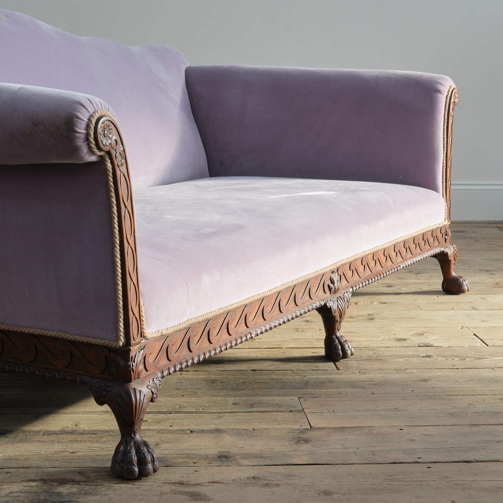 A deep seated country house camel back 2 seater sofa. English c1900. Raised on 3 carved hairy paw front feet with splayed shaped rear legs.