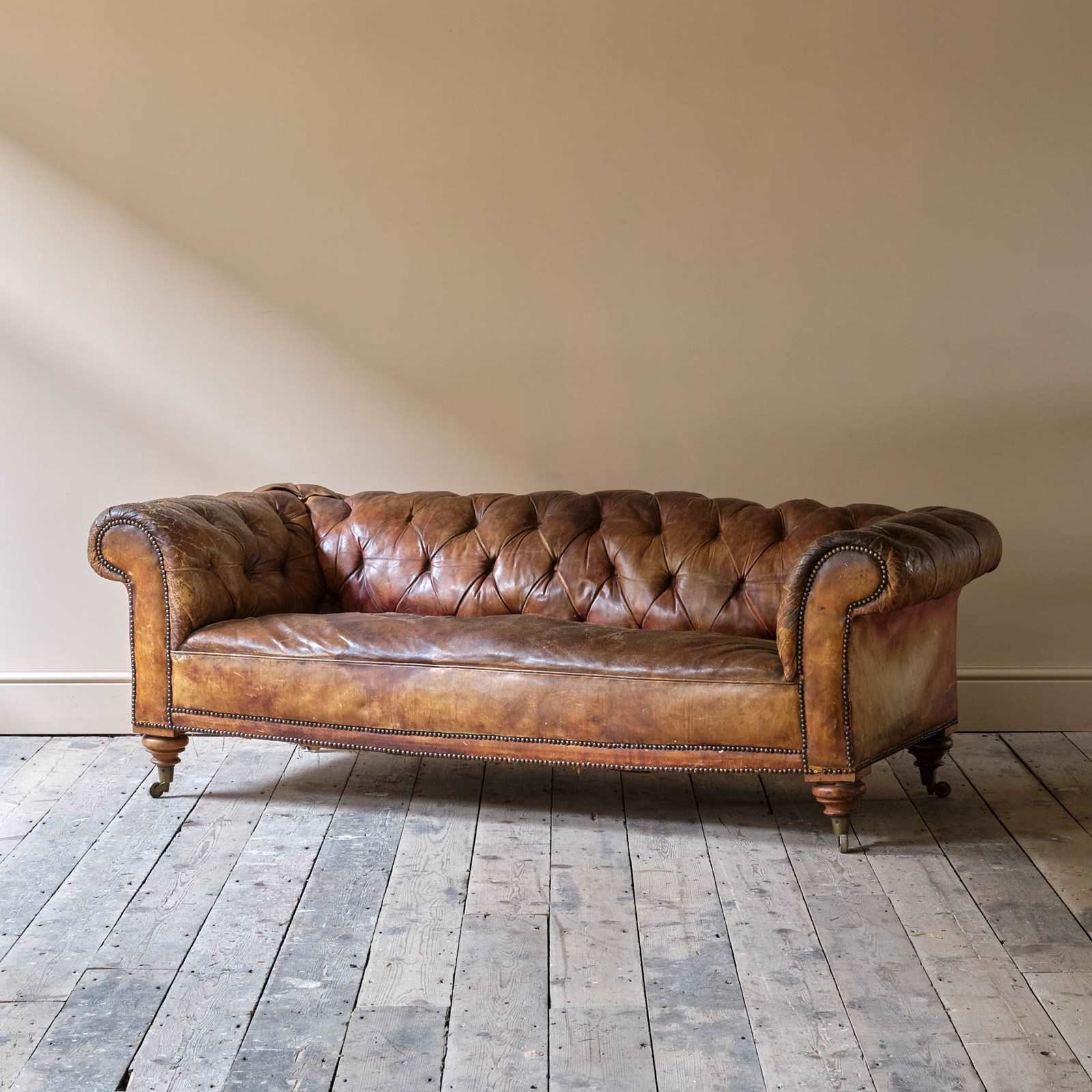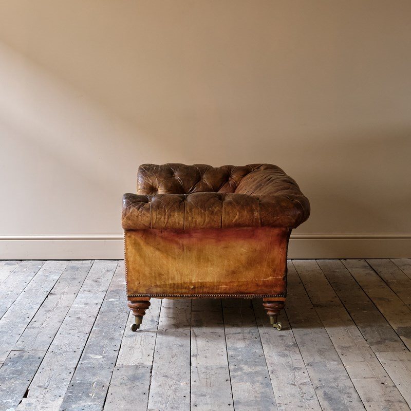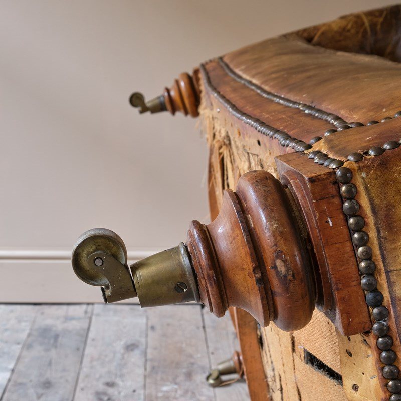 Structurally in good solid order. The buttoned leather back is nicely worn with the seat having a tear to the leather but we believe this is salvageable whist the seat is being replaced.
