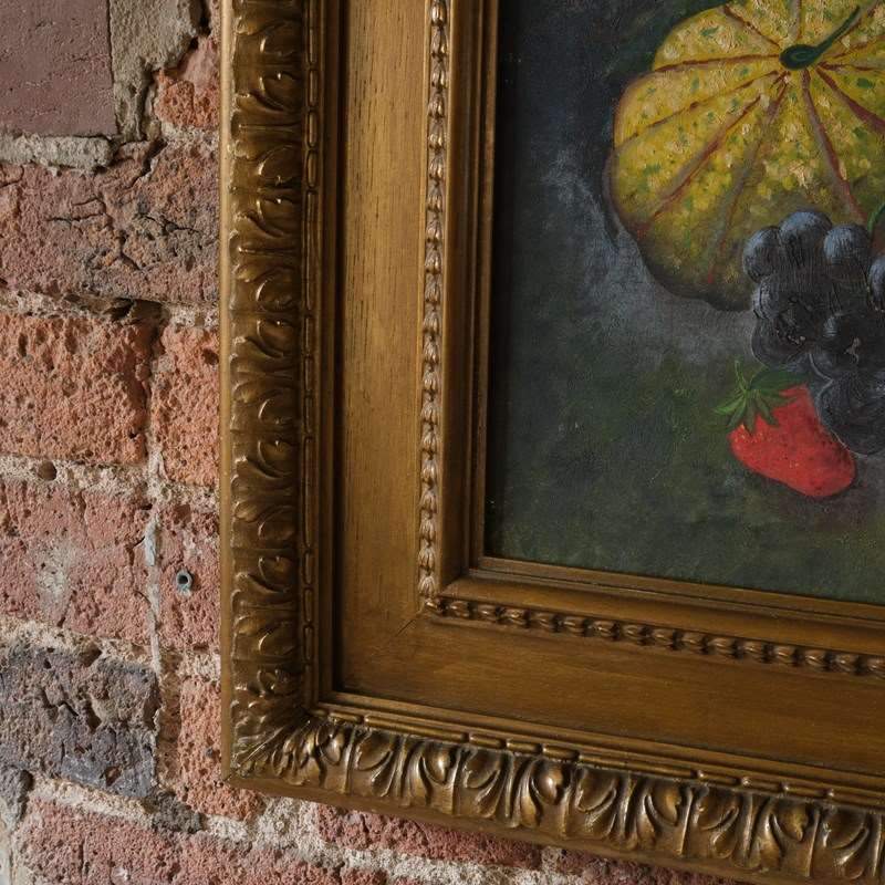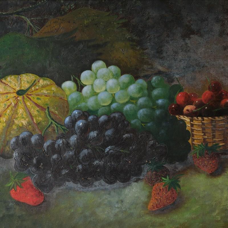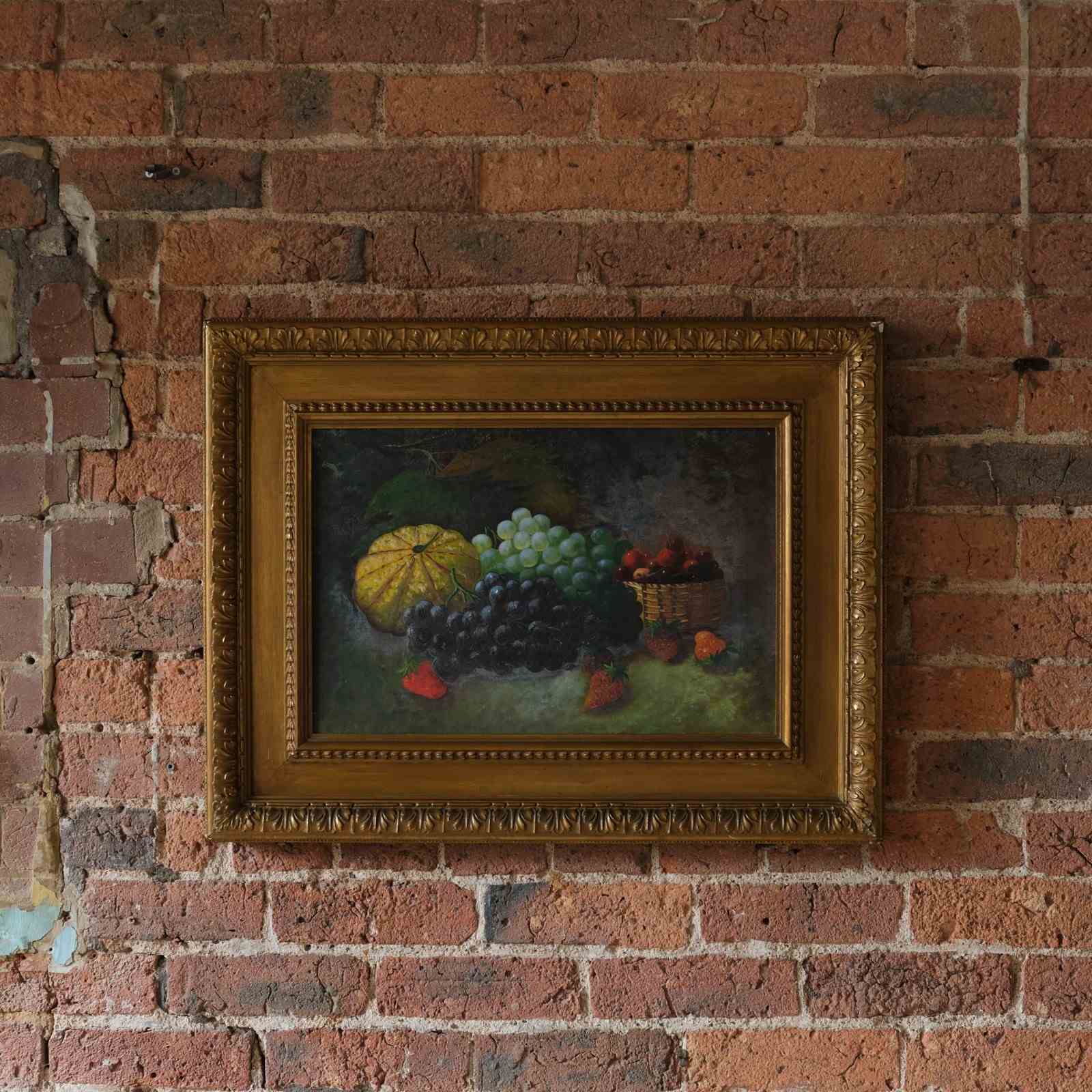 A vibrant early 20th century still life oil on canvas. Depicting a table with fruit in thick applied paint.