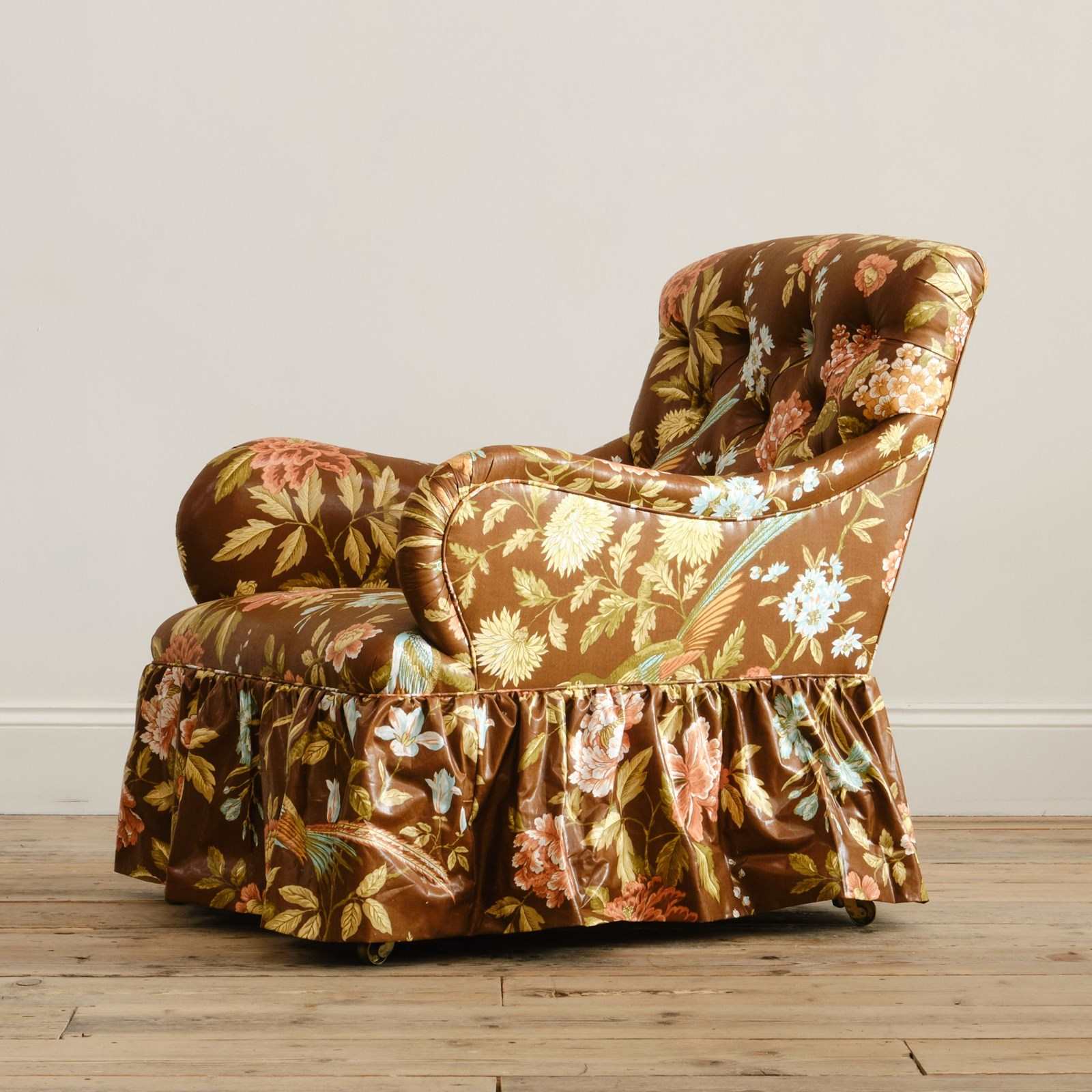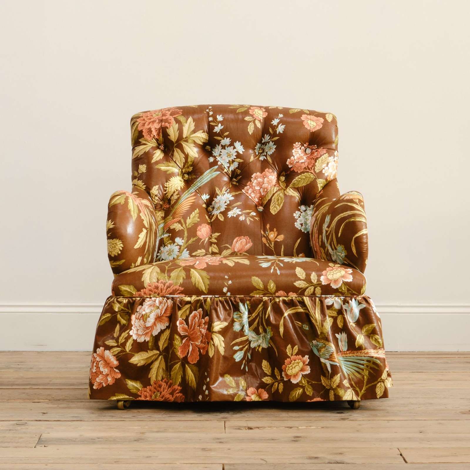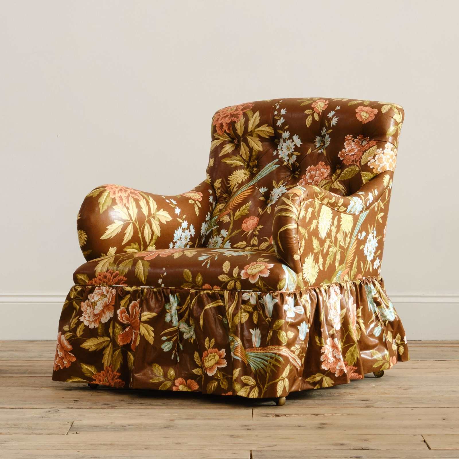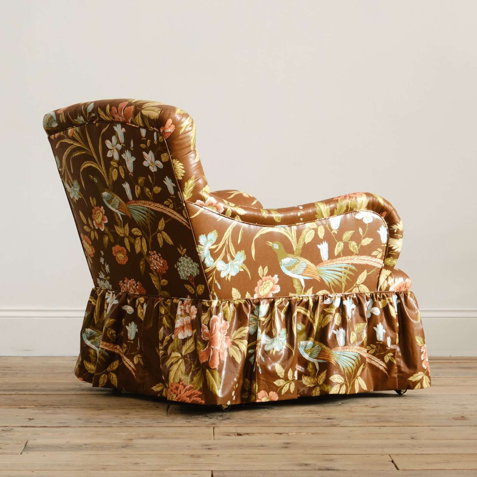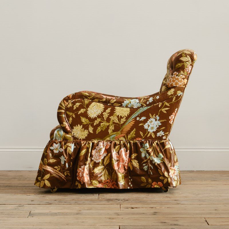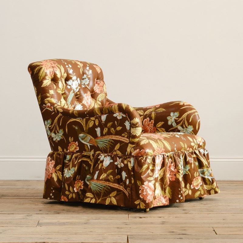 A 19th century Country house armchair by Whytock & Reid of Edinburg. Upholstered by us in vintage Sanderson "Birds & Peony" floral chintz cotton. Raised on mahogany legs with the original casters.
