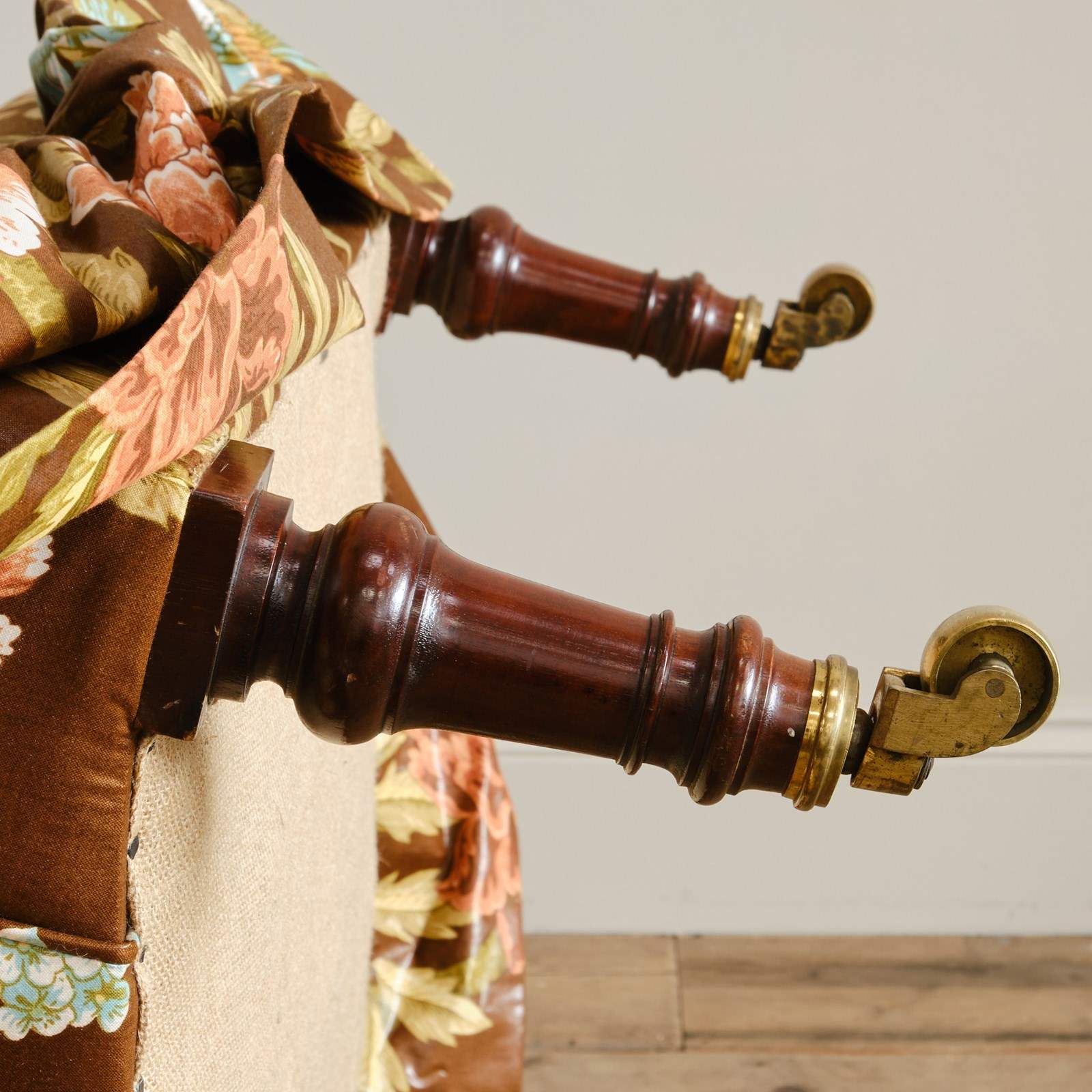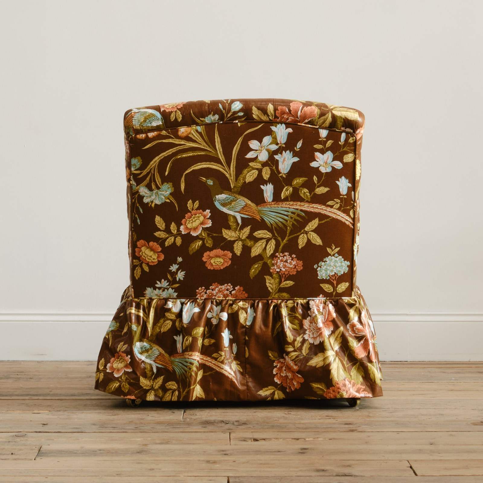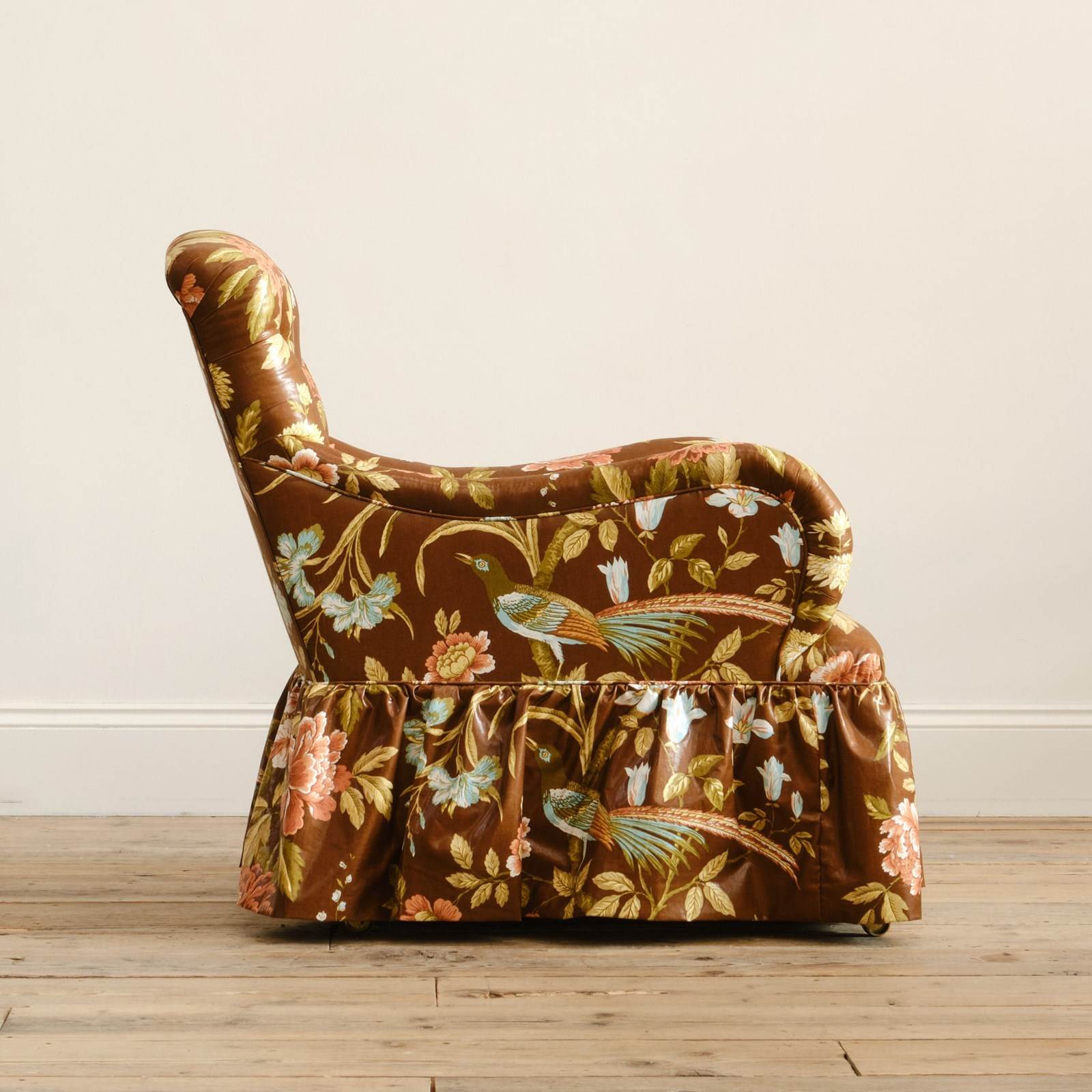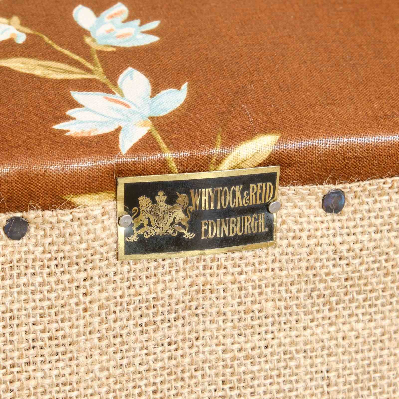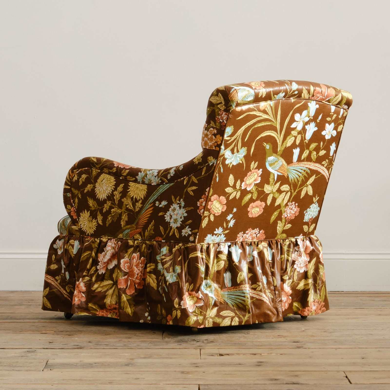 A 19th century Country house armchair by Whytock & Reid of Edinburg. Upholstered by us in vintage Sanderson "Birds & Peony" floral chintz cotton. Raised on mahogany legs with the original casters.