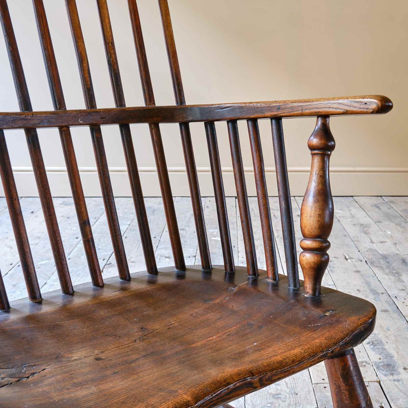 A Georgian comb back Windsor. The single slab elm seat and arm bow joined by ash spindles, the whole raised on turned legs. C1800
