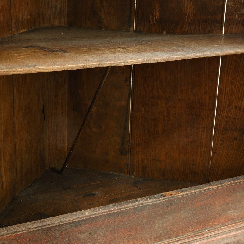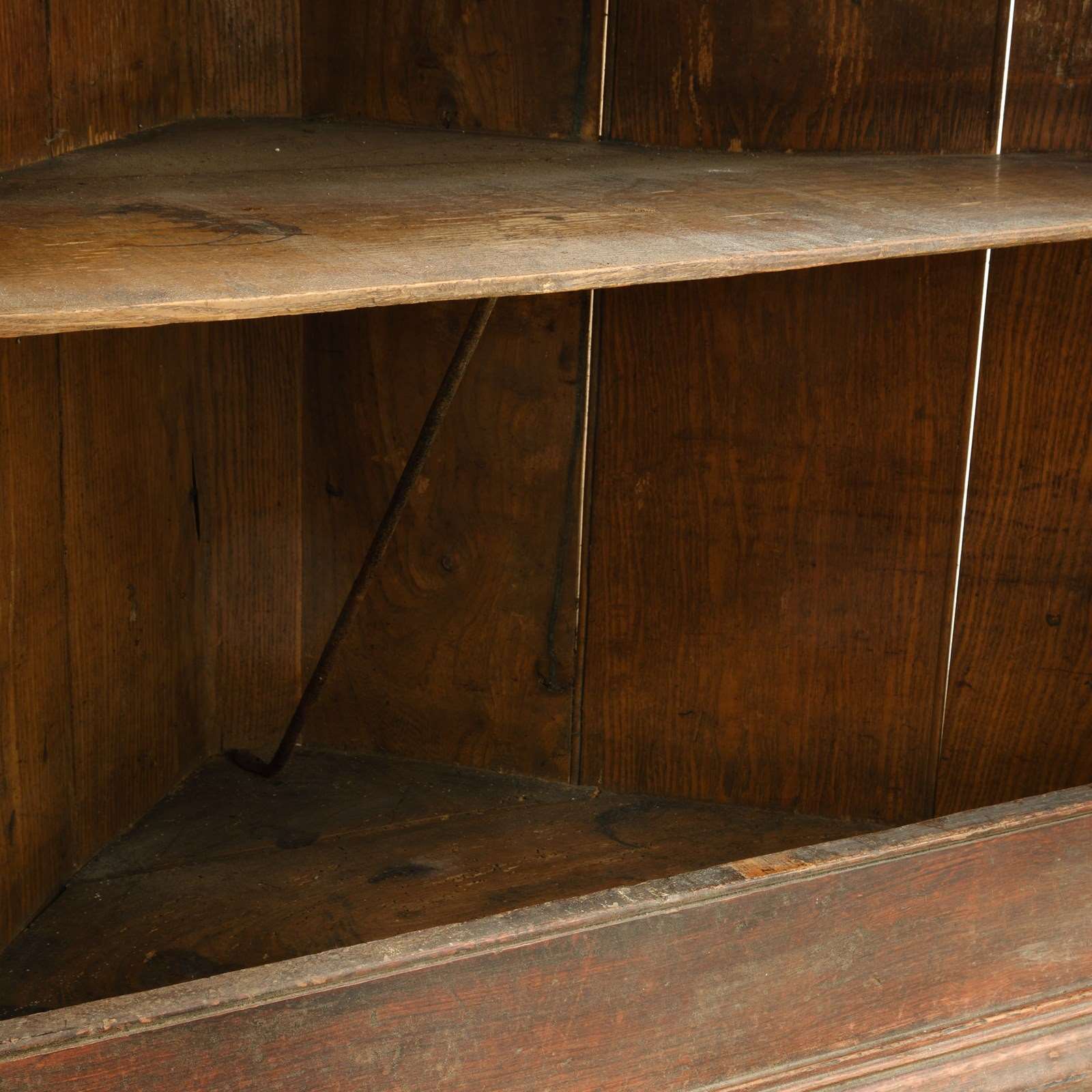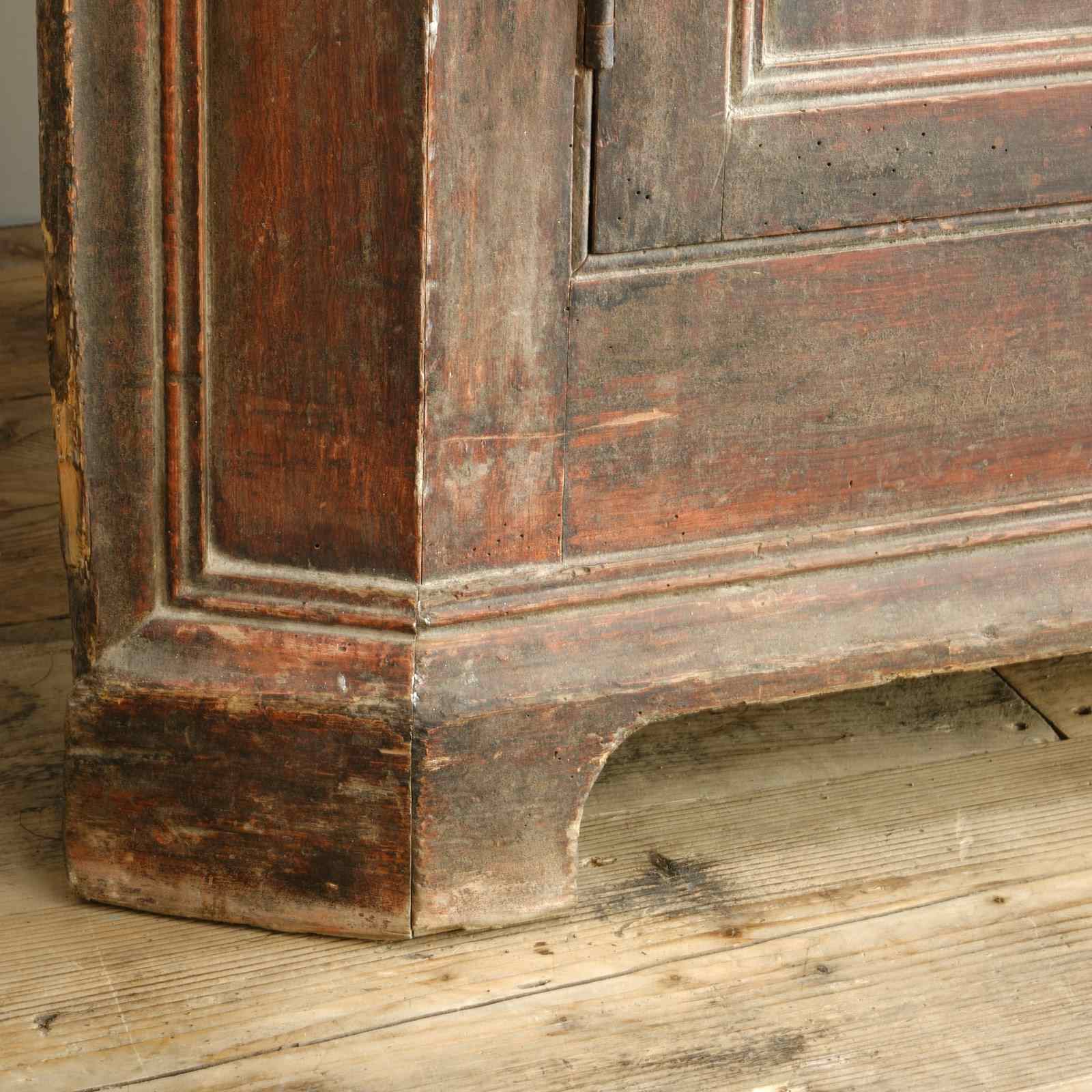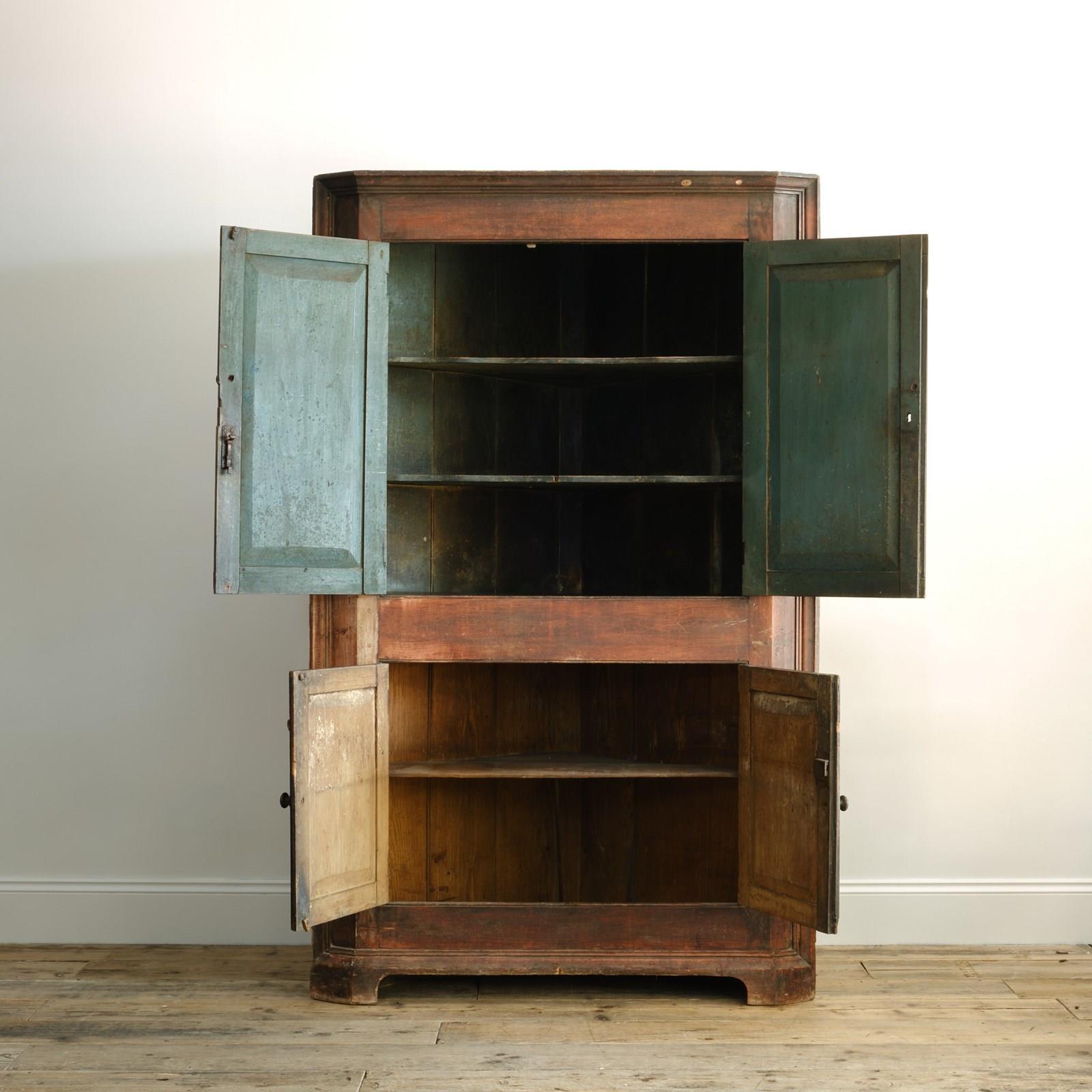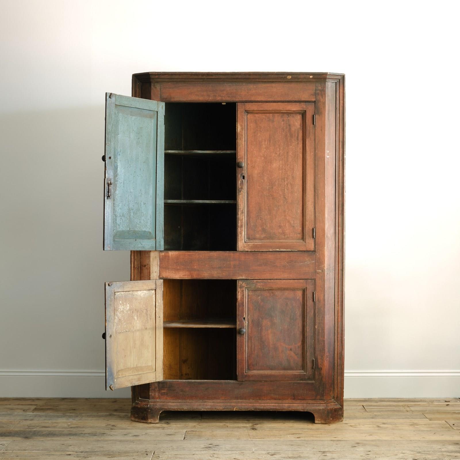 A large Georgian corner cupboard in its characterful original worn crusty paint. Constructed in pine with oak backboards. c1800