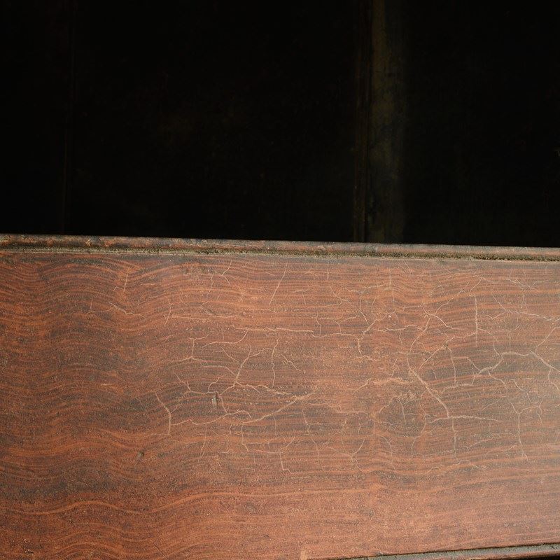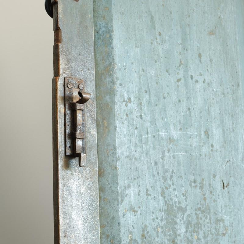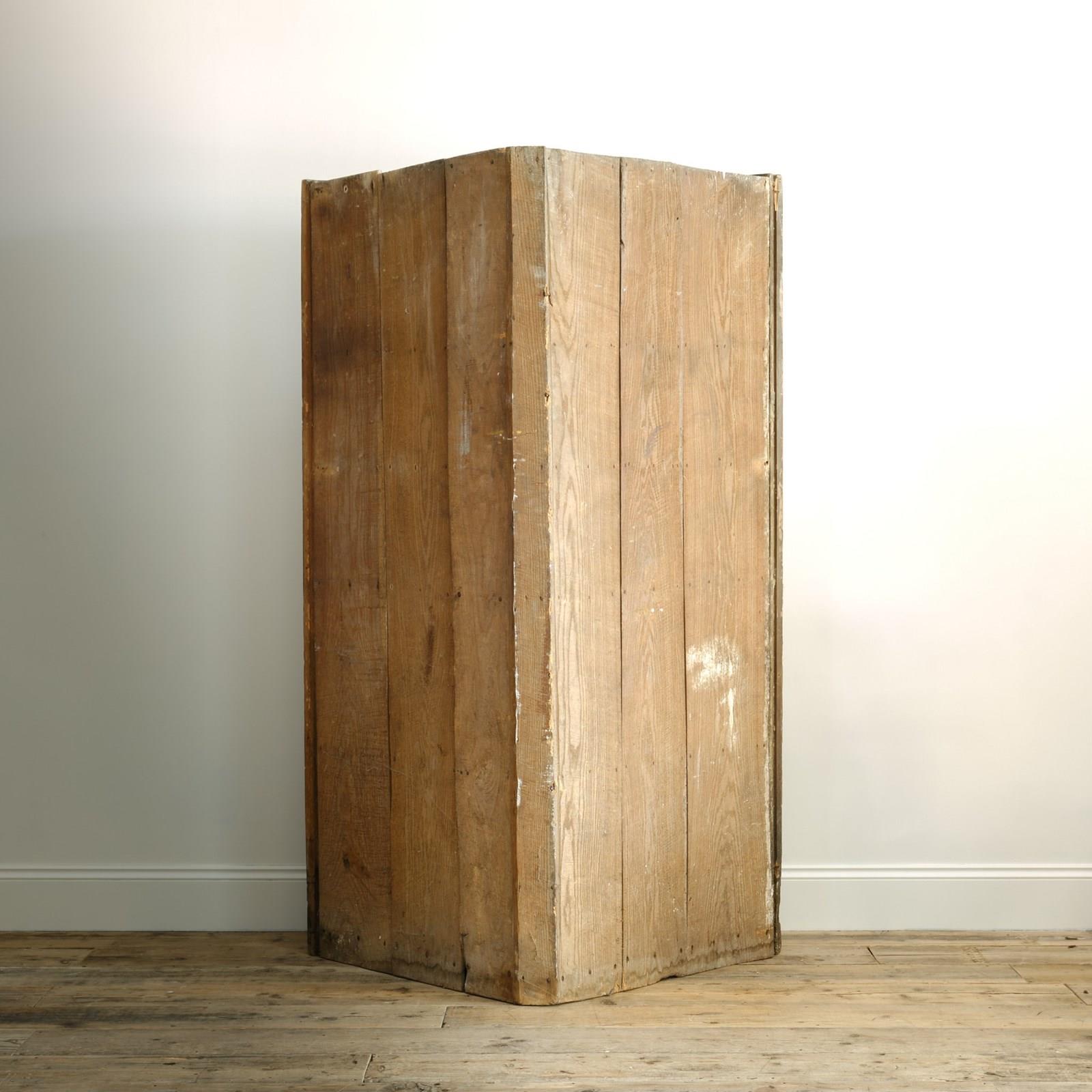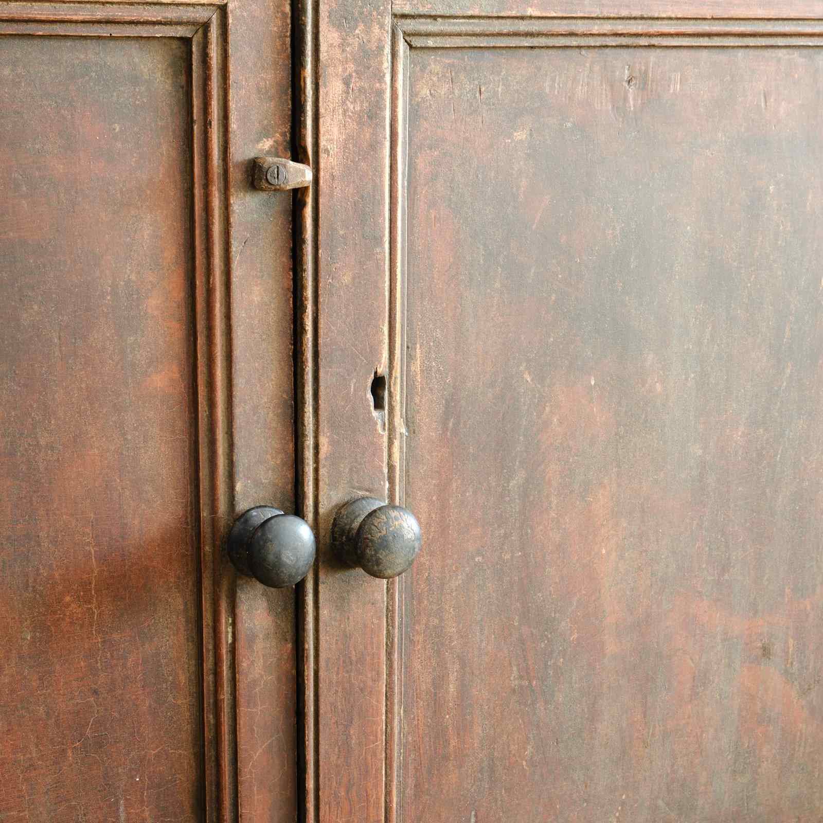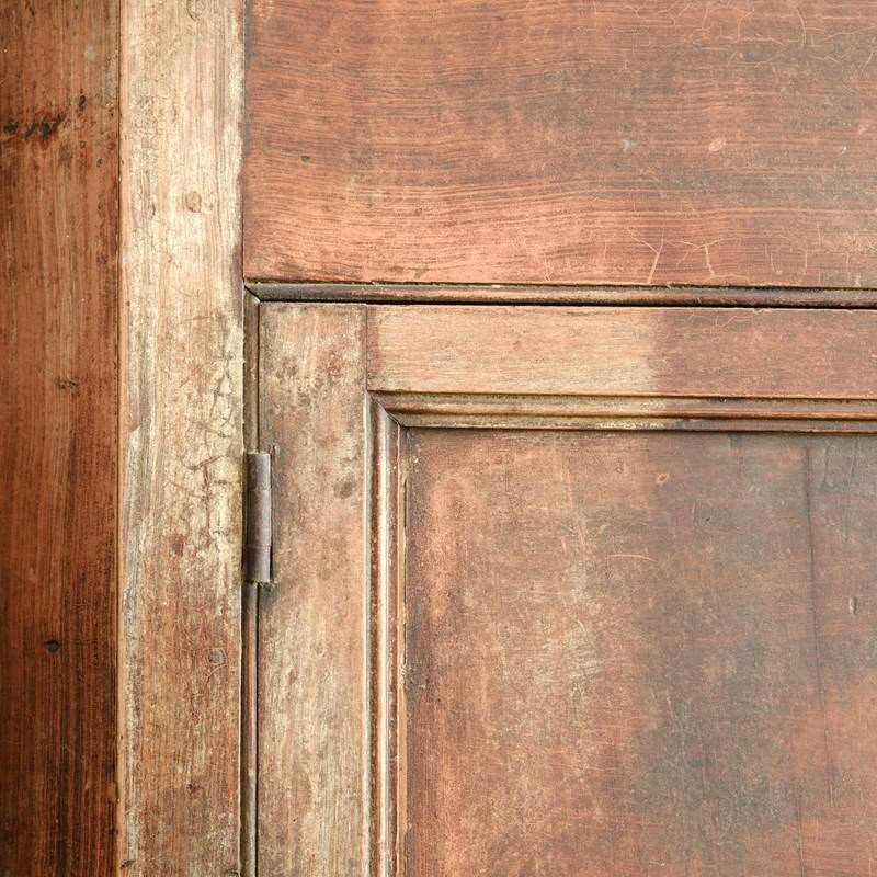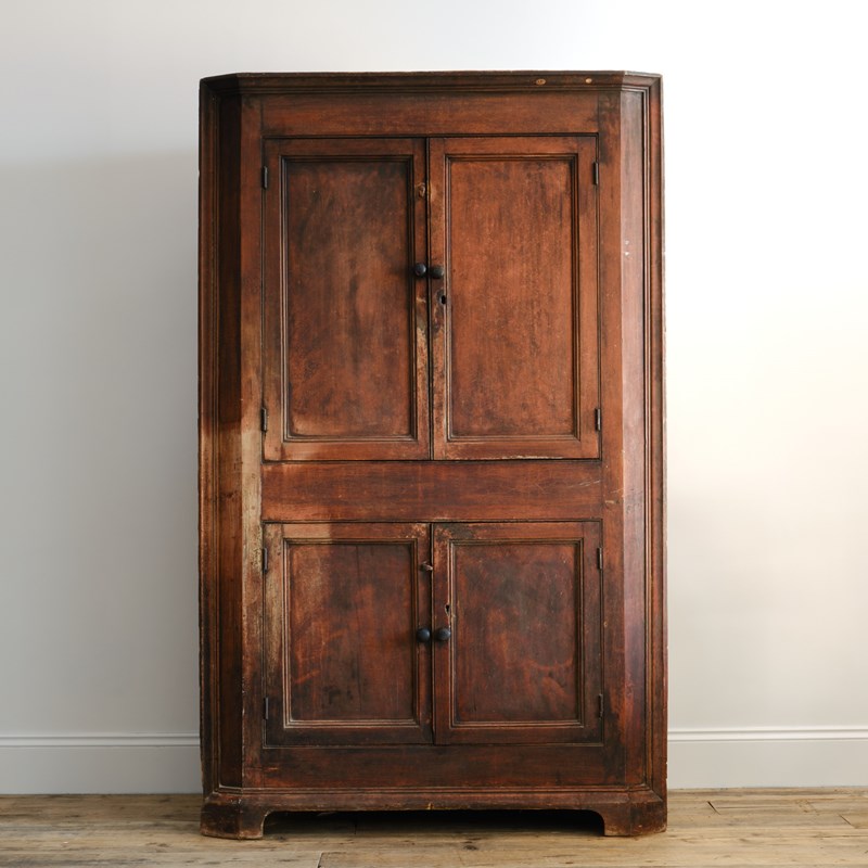 A large Georgian corner cupboard in its characterful original worn crusty paint. Constructed in pine with oak backboards. c1800