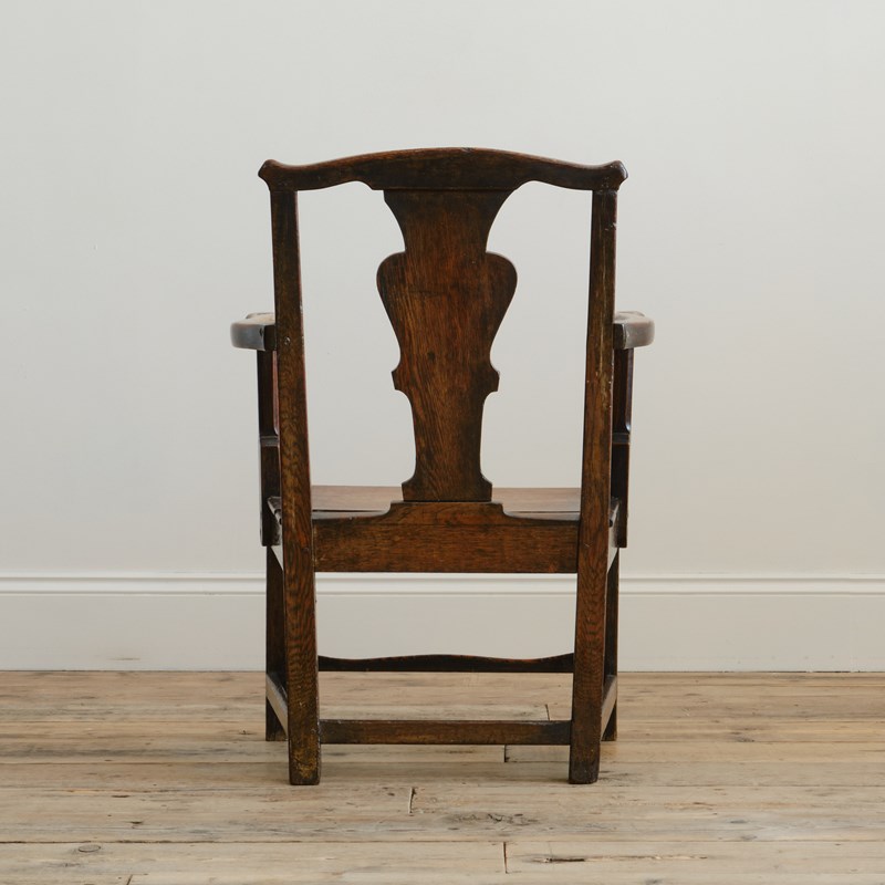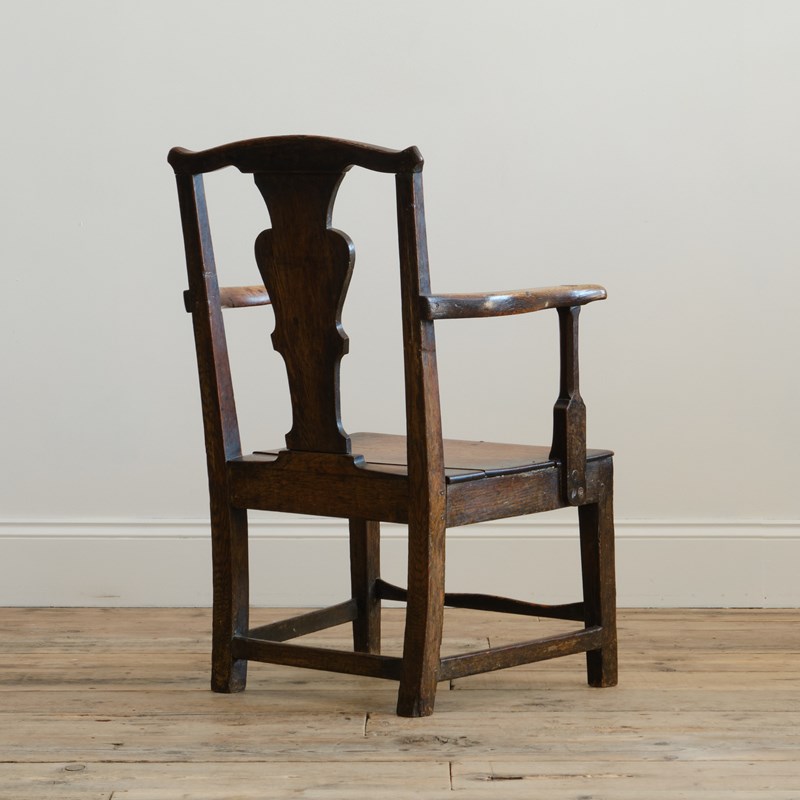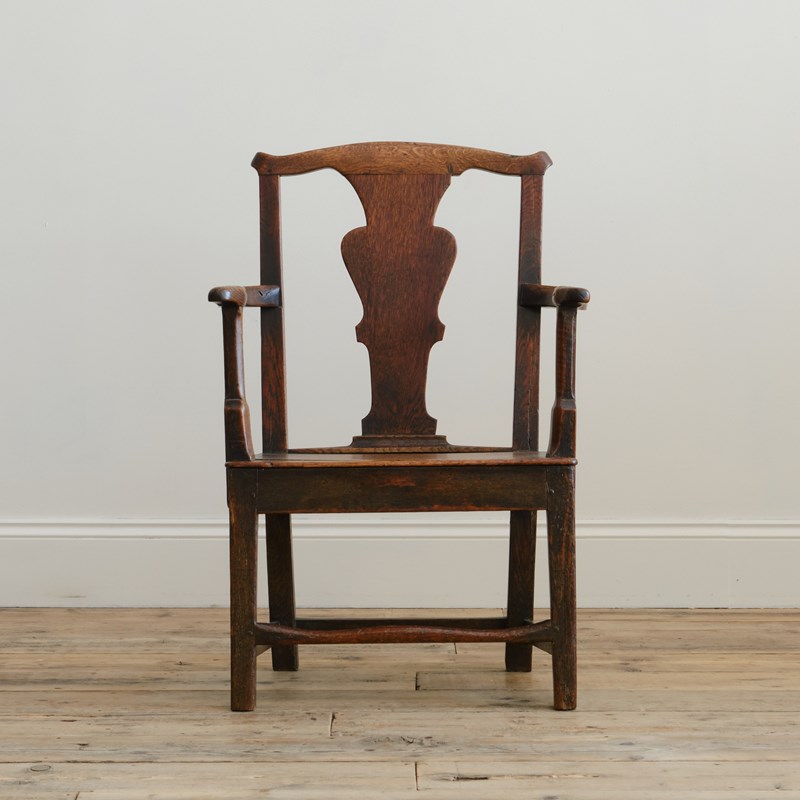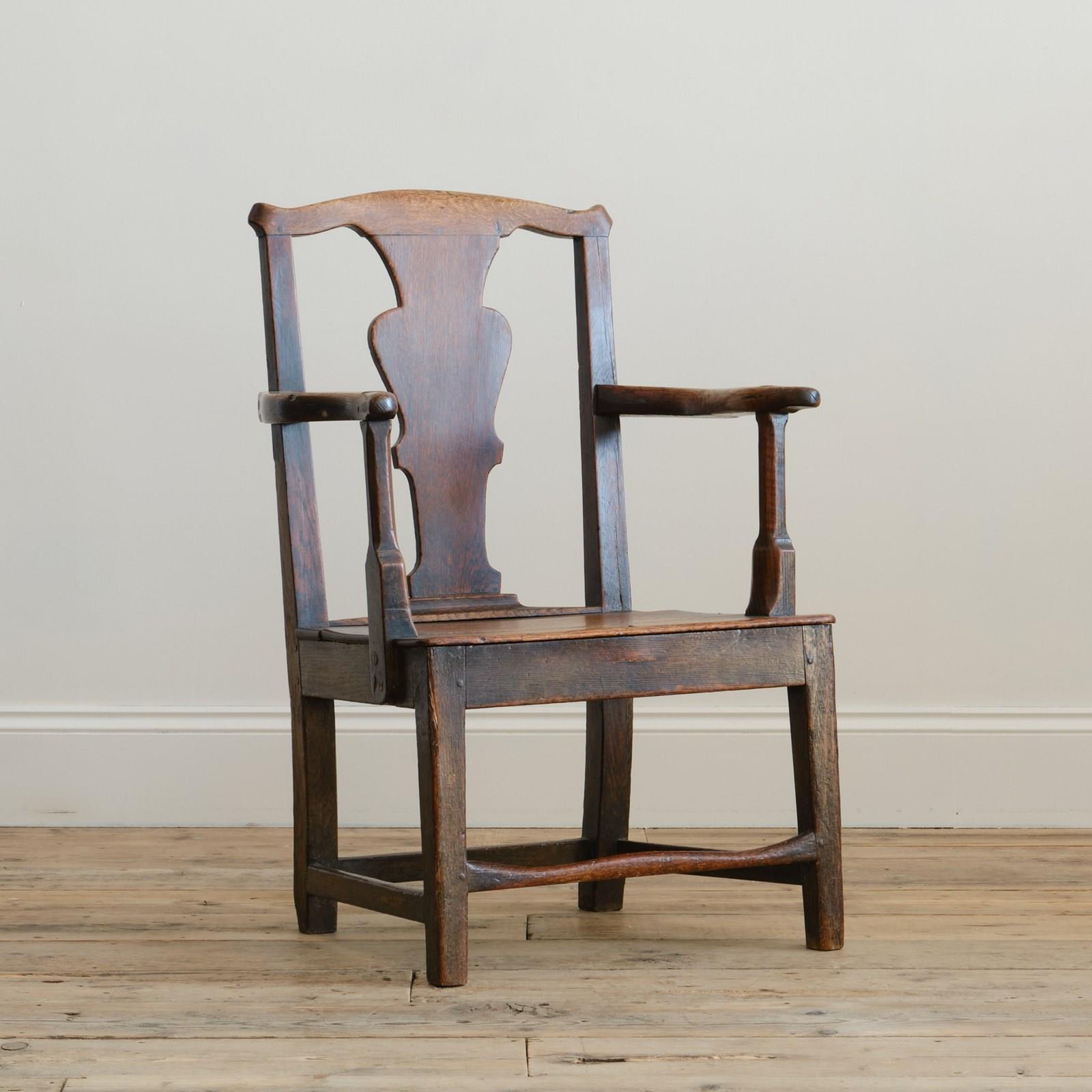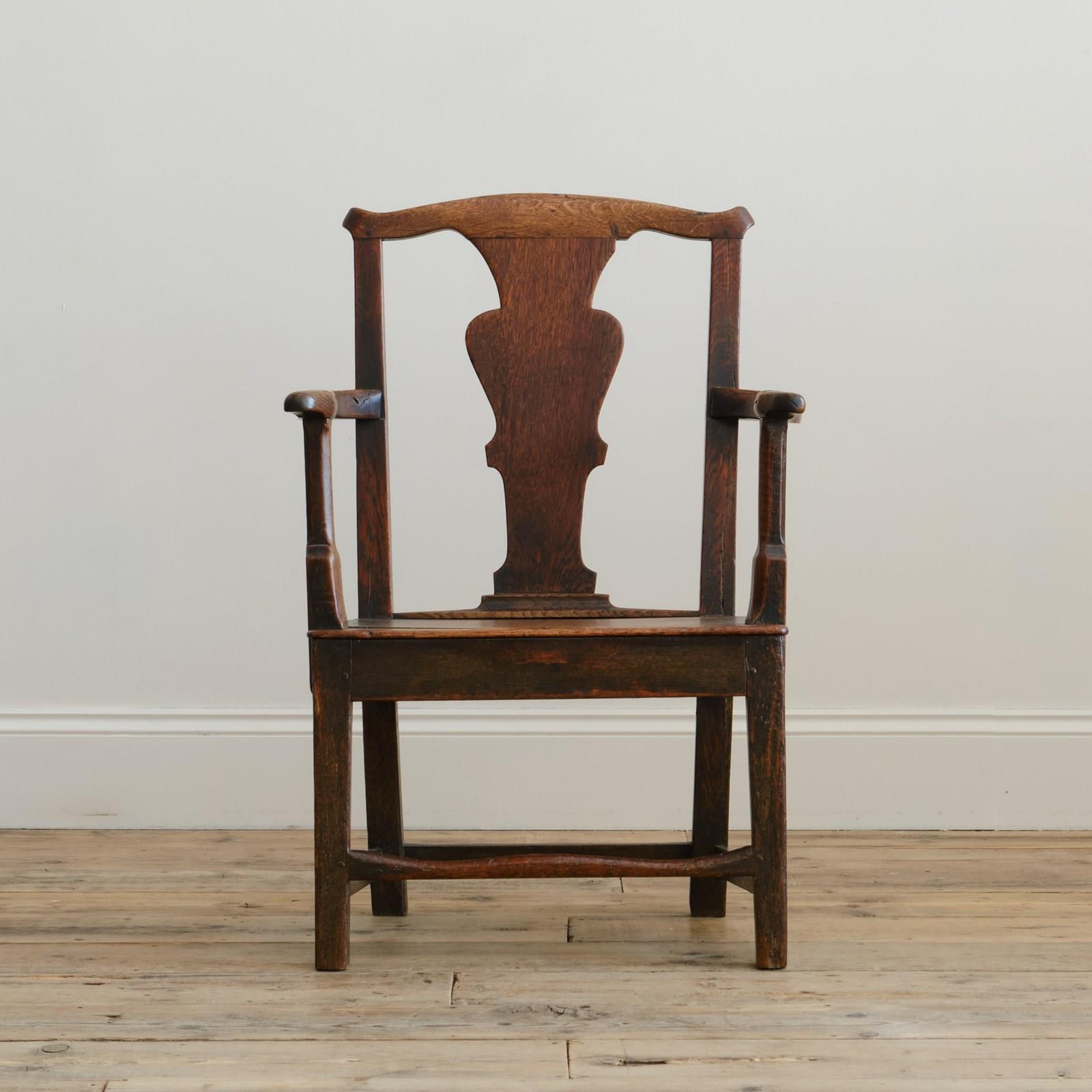 A nice and simple Georgian splat back armchair in oak with plenty of patina and remnants of its original painted finish.