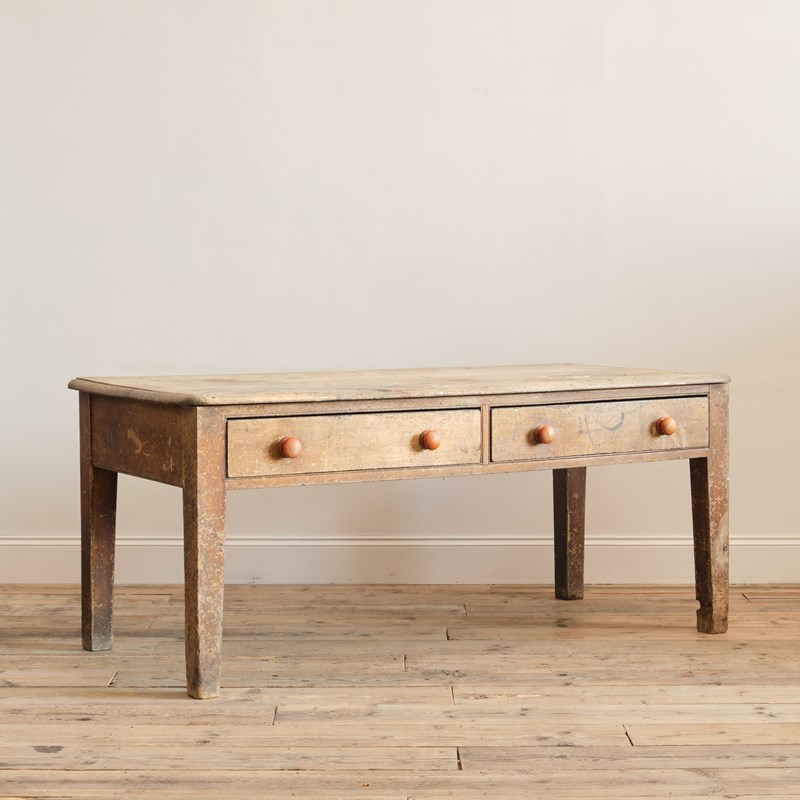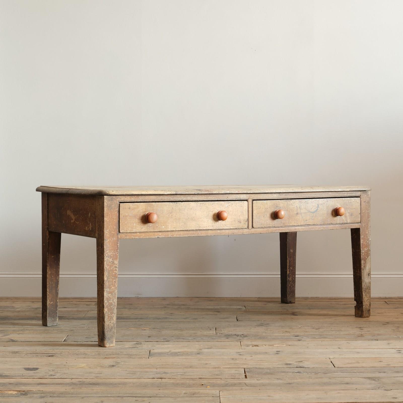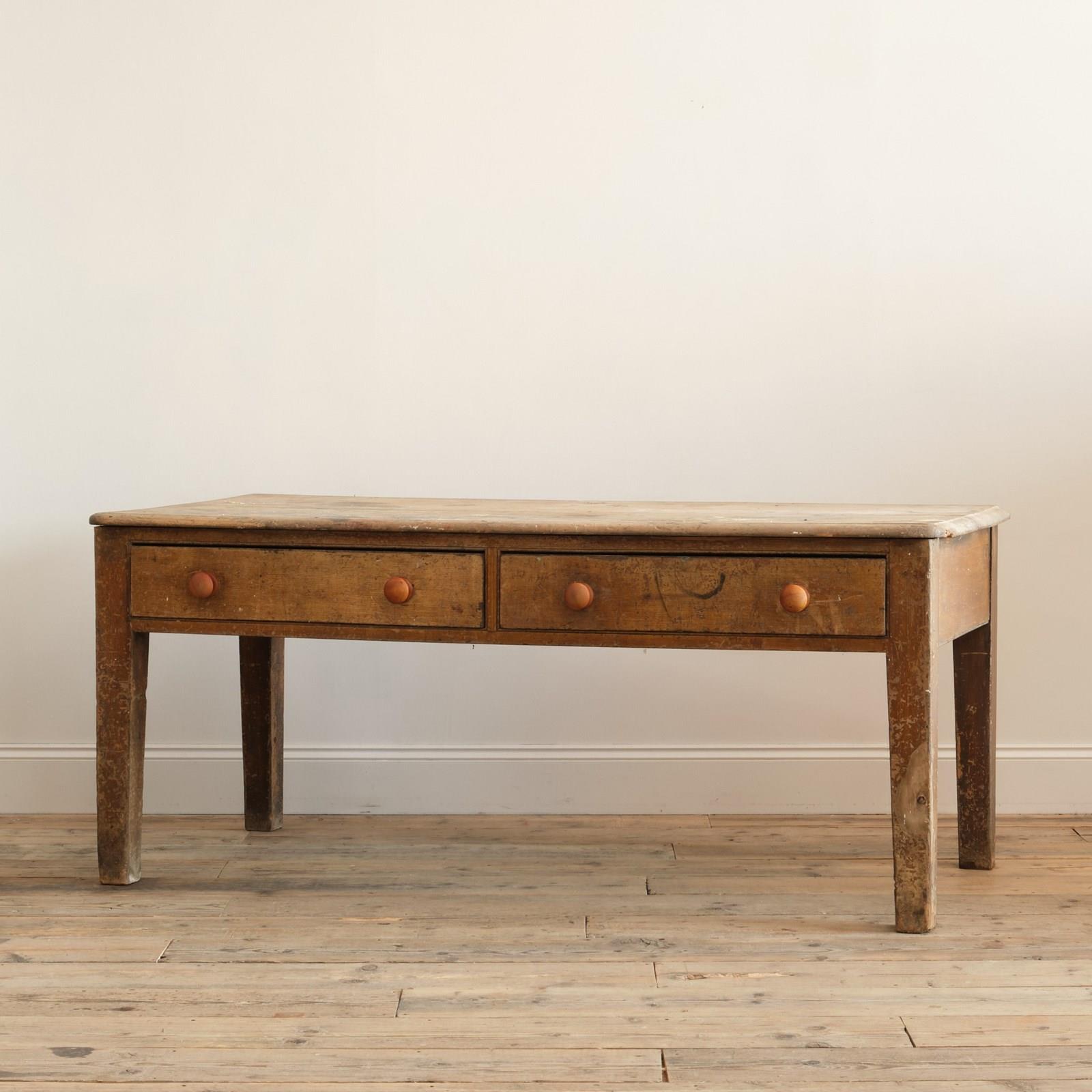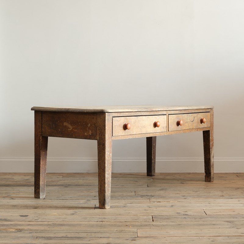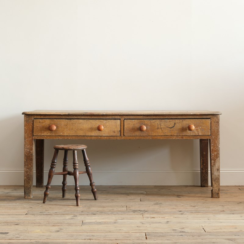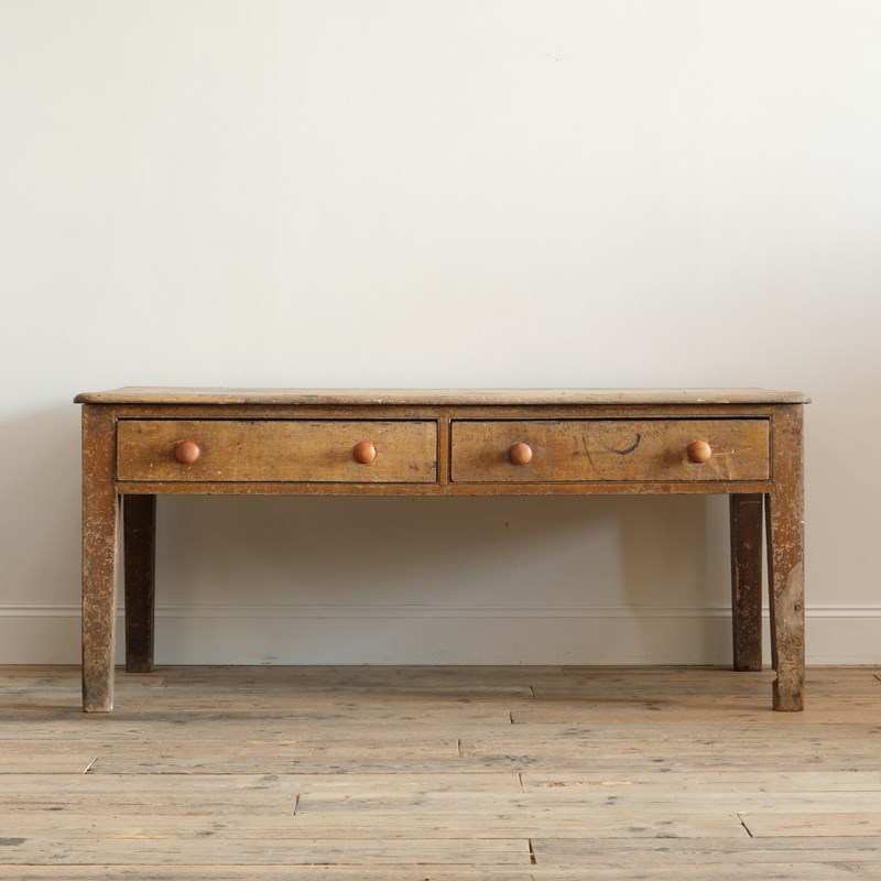 A Georgian pine scullery table in its original simulated golden oak grained paint and 2 plank top. The 2 wide drawers run the full depth of the table and run well. In all but original condition with a dry and beautifully worn surface. We have changed the drawer pulls with a set of 19th century period fruitwood turned knobs.