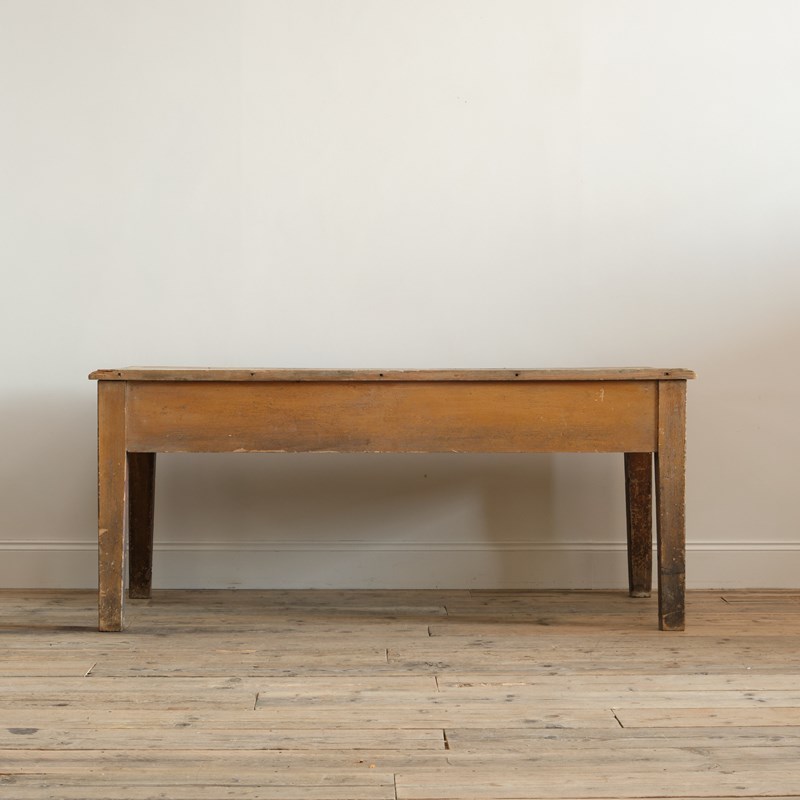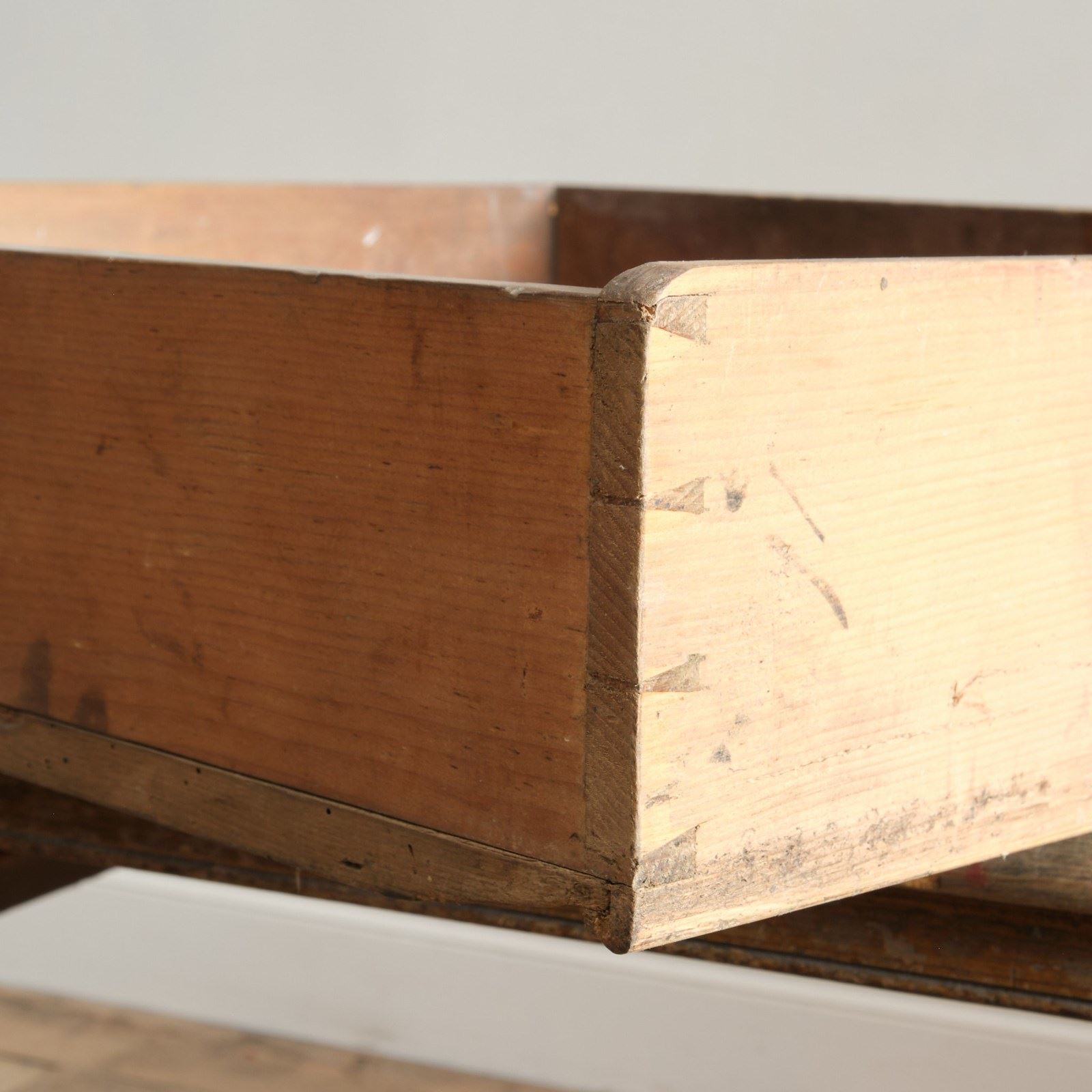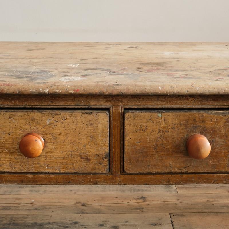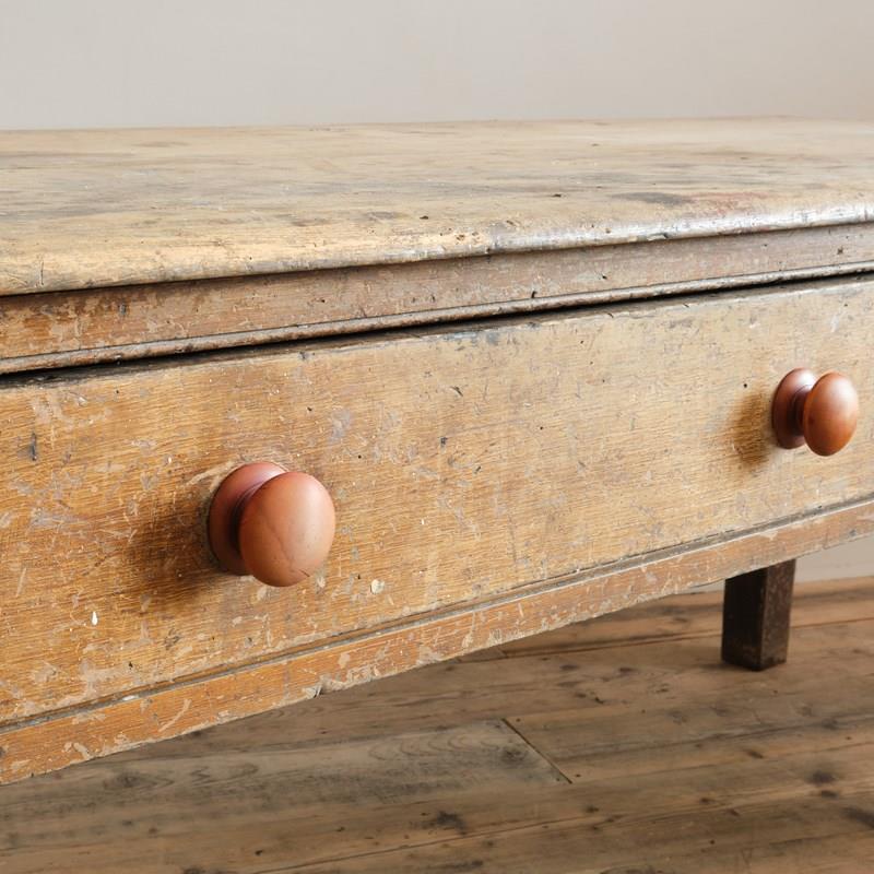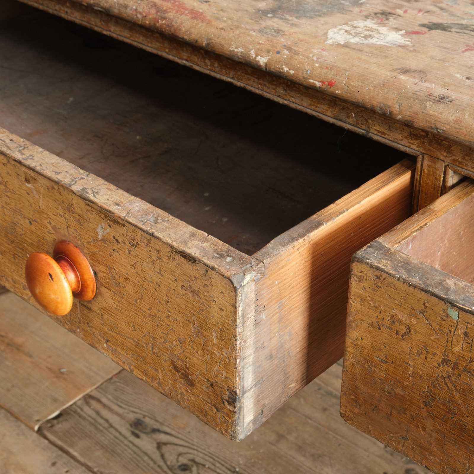 A Georgian pine scullery table in its original simulated golden oak grained paint and 2 plank top. The 2 wide drawers run the full depth of the table and run well. In all but original condition with a dry and beautifully worn surface. We have changed the drawer pulls with a set of 19th century period fruitwood turned knobs.