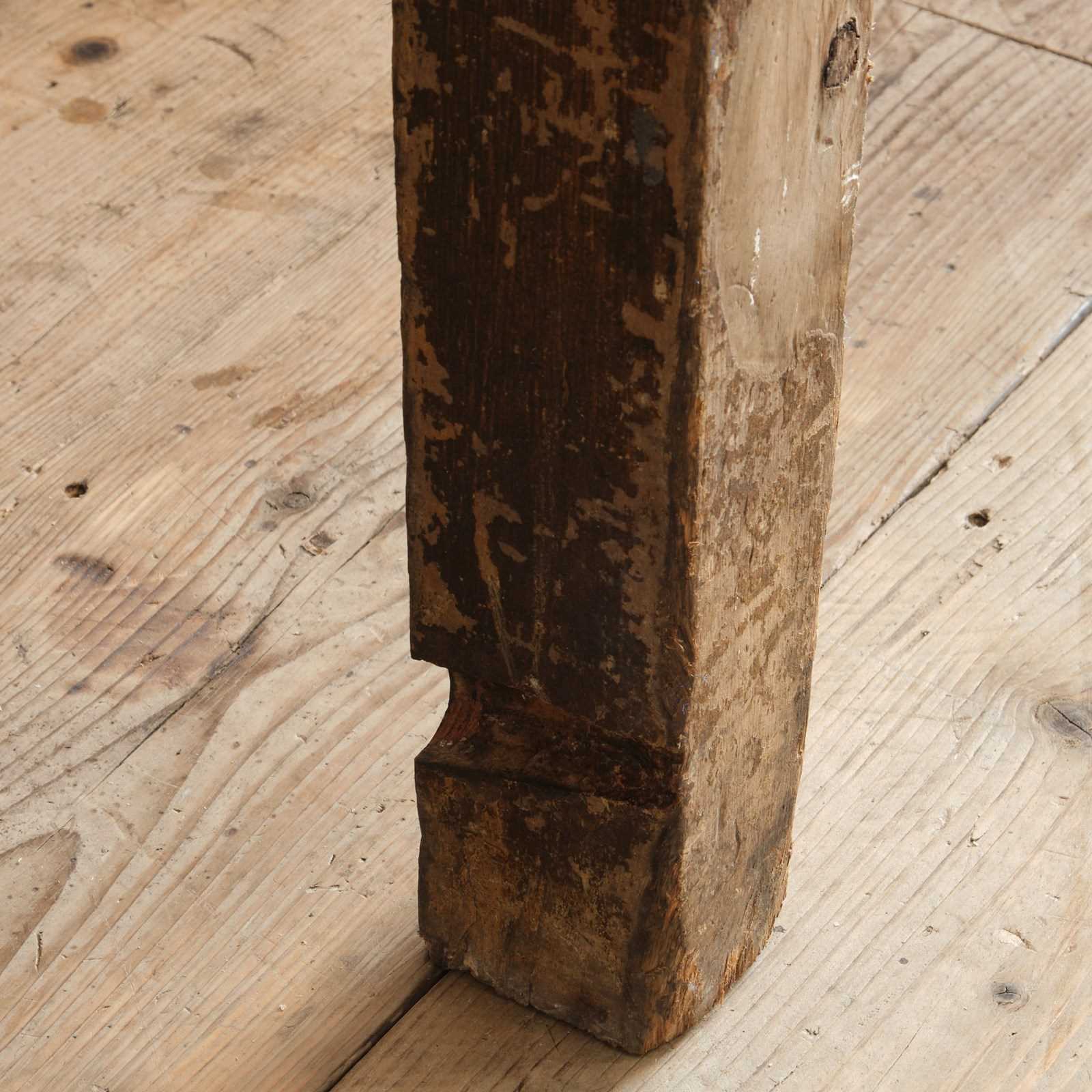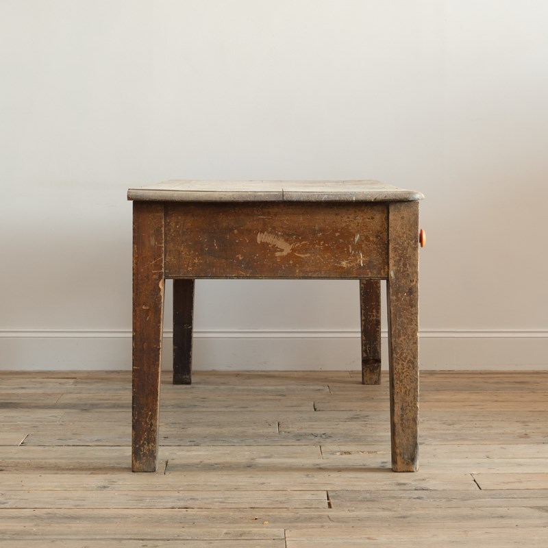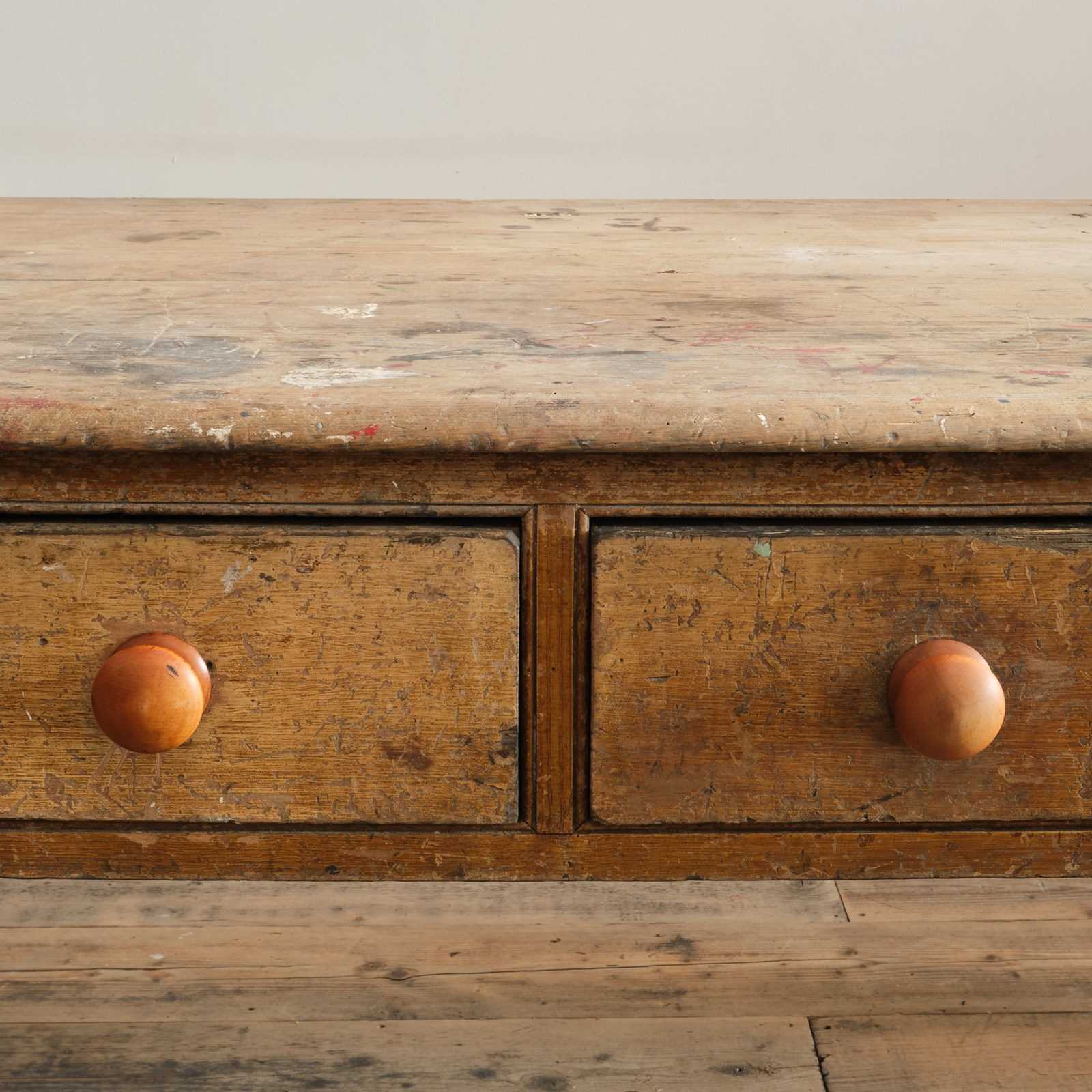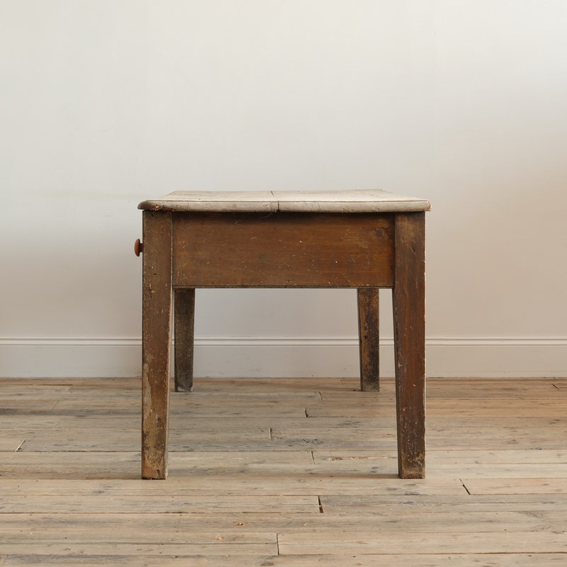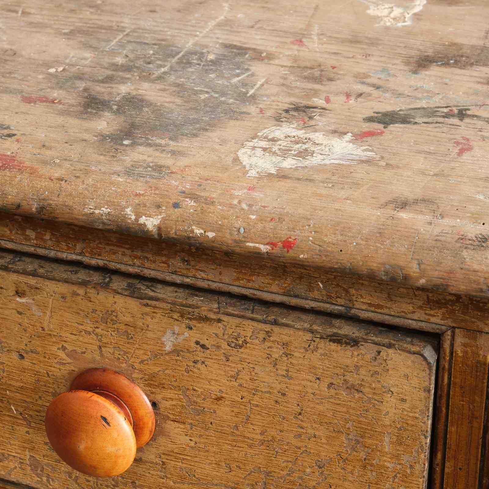 A Georgian pine scullery table in its original simulated golden oak grained paint and 2 plank top. The 2 wide drawers run the full depth of the table and run well. In all but original condition with a dry and beautifully worn surface. We have changed the drawer pulls with a set of 19th century period fruitwood turned knobs.