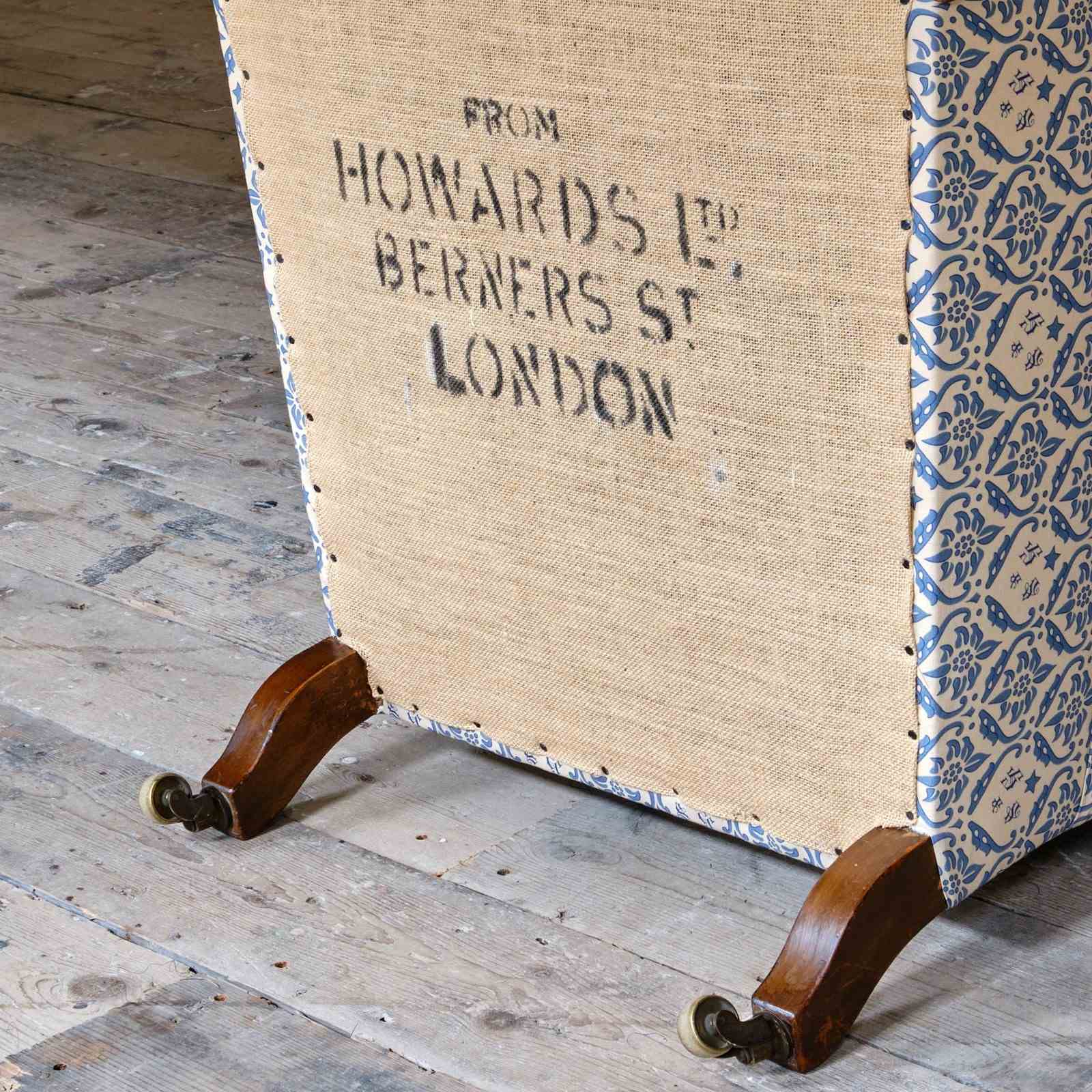 A wonderful early 20th century Howard & Sons open armchair. Raised on walnut legs and unusual square arm supports. All legs retaining the original Howard casters.