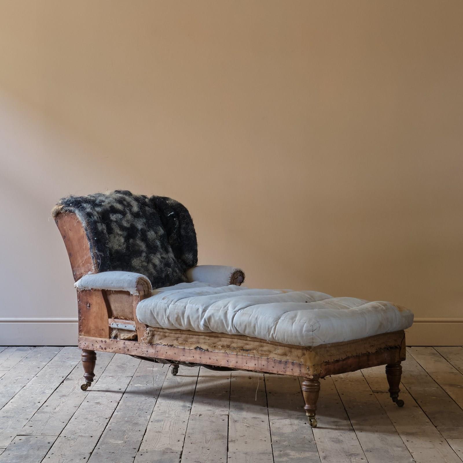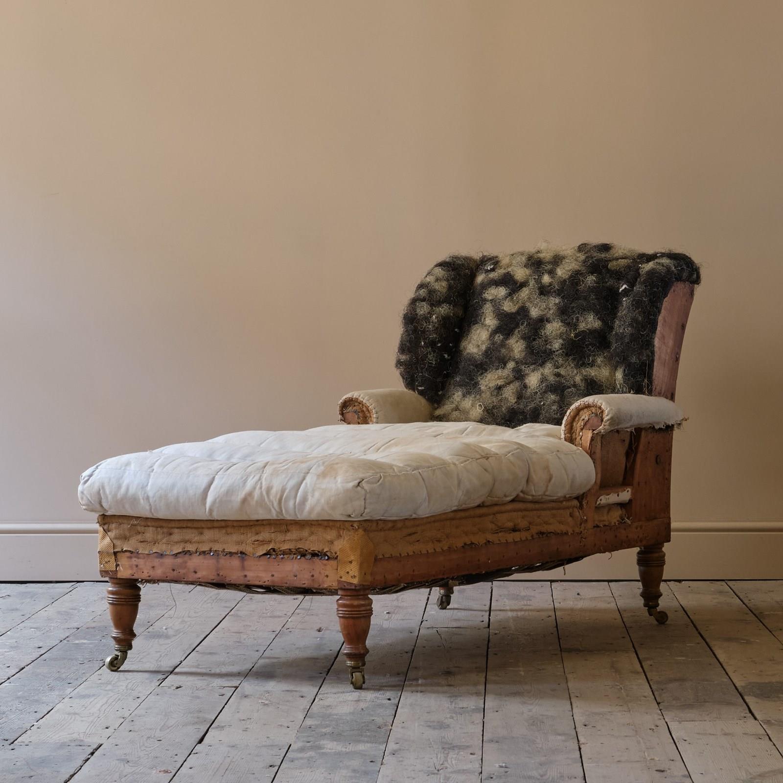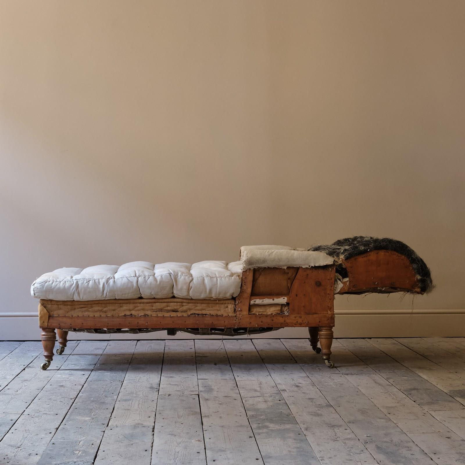A rare early 20th century reclining daybed by Howard & Sons, London - England. Raised on 4 turned walnut legs with the original stamped brass casters. The left back leg bearing the serial number and the ebonized stretcher rail retains the original Howard & Sons paper label.