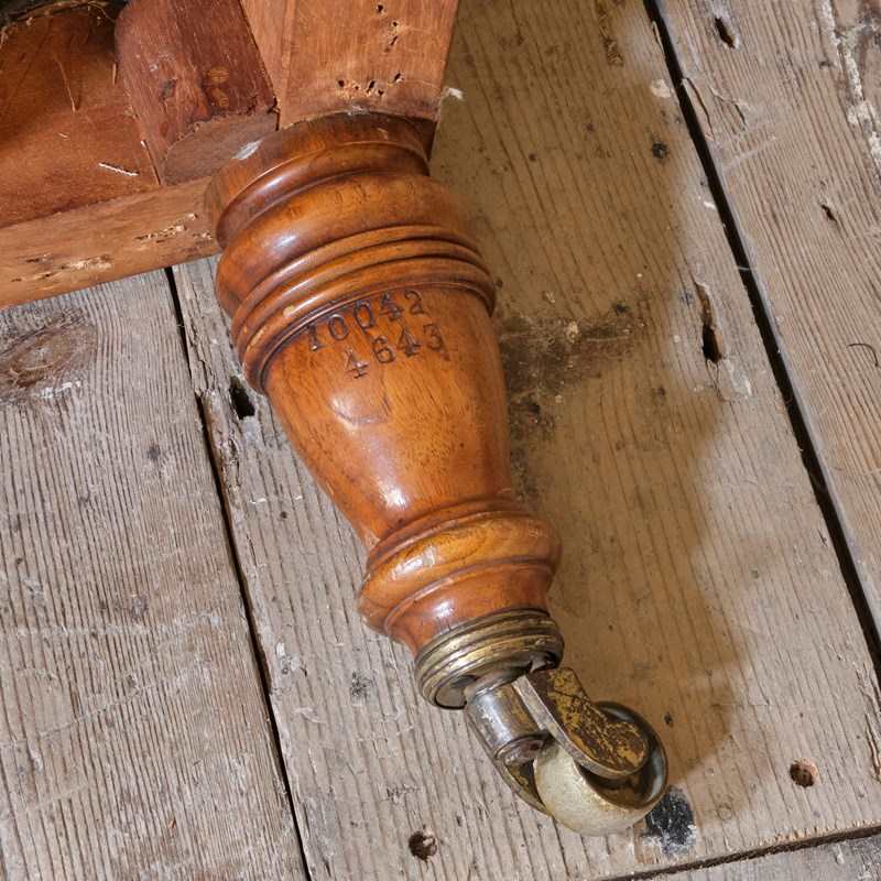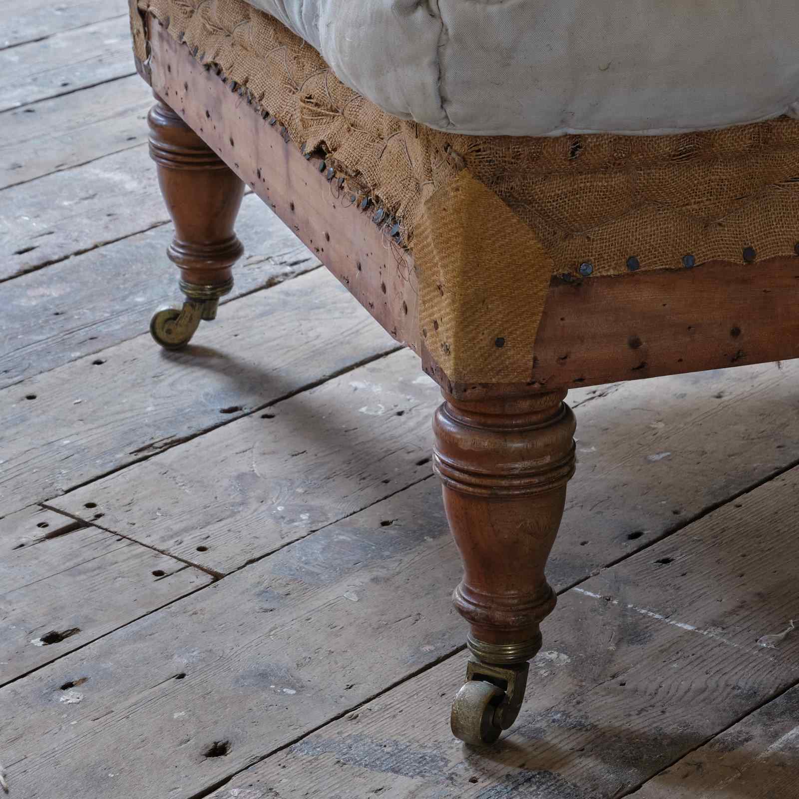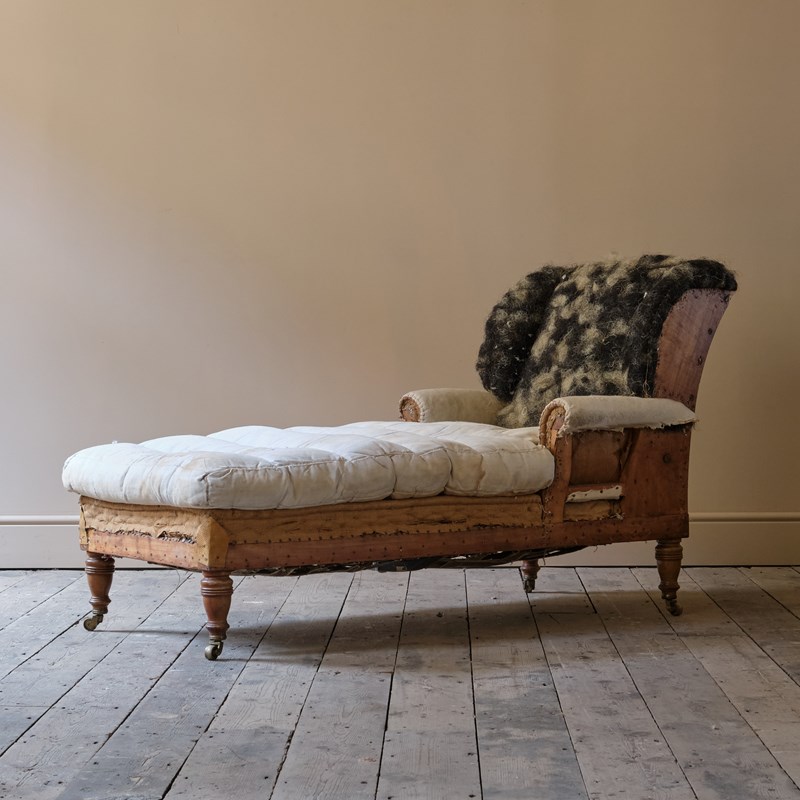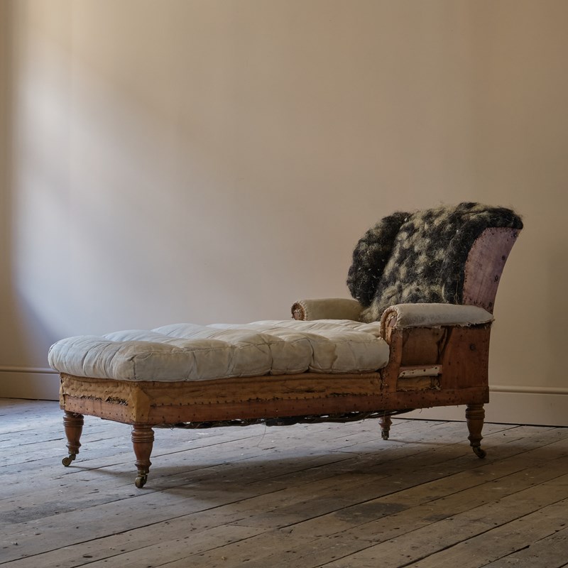 A rare early 20th century reclining daybed by Howard & Sons, London - England. Raised on 4 turned walnut legs with the original stamped brass casters. The left back leg bearing the serial number and the ebonized stretcher rail retains the original Howard & Sons paper label.