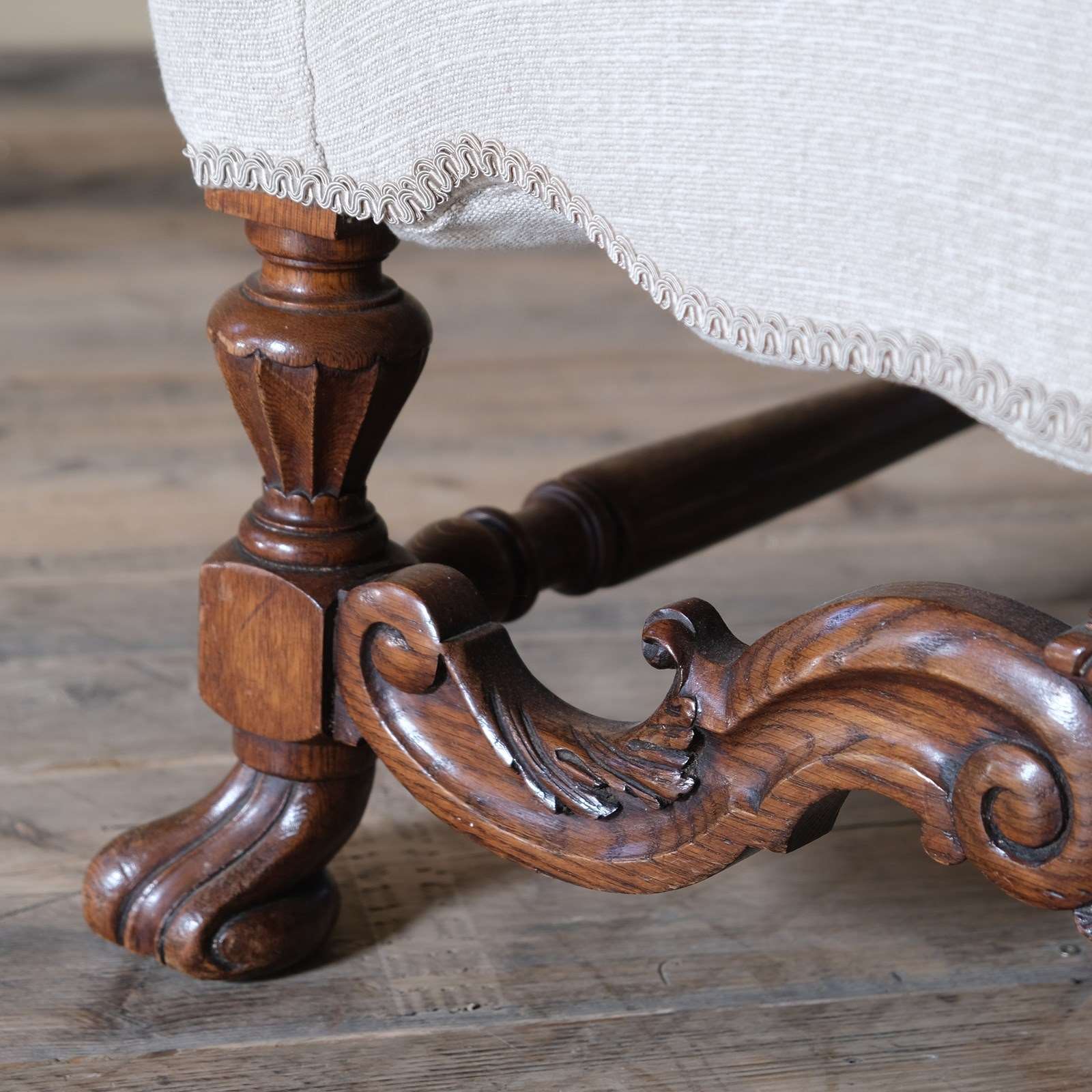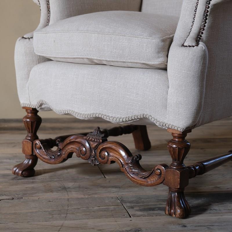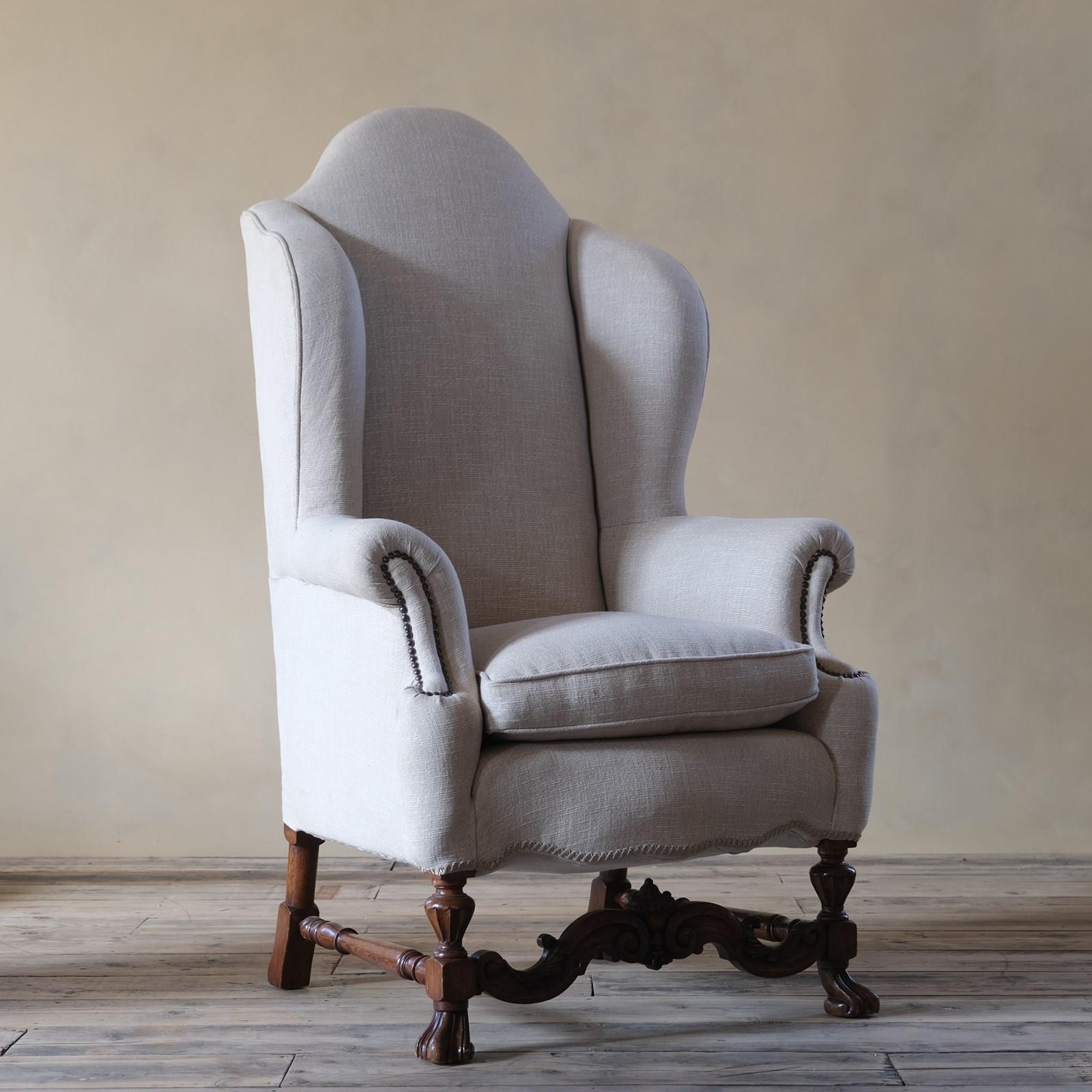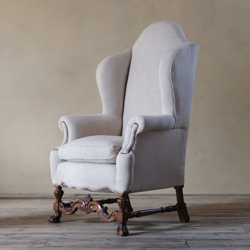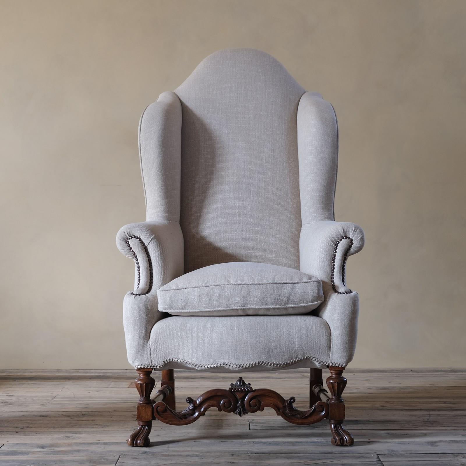 A monumental matched pair of 19th century William & Mary style wingback armchairs. The walnut frames raised by crisply carved oak legs.